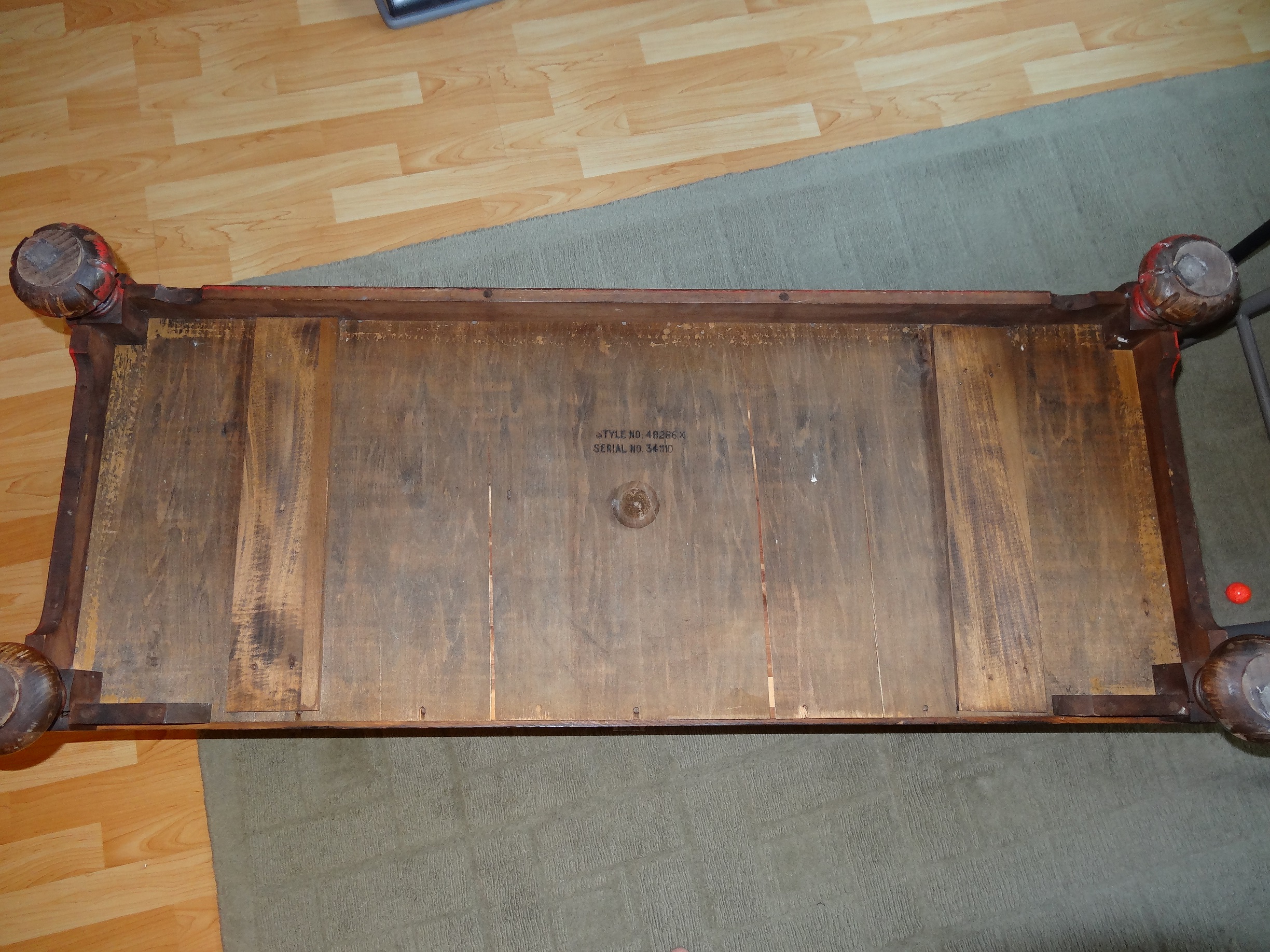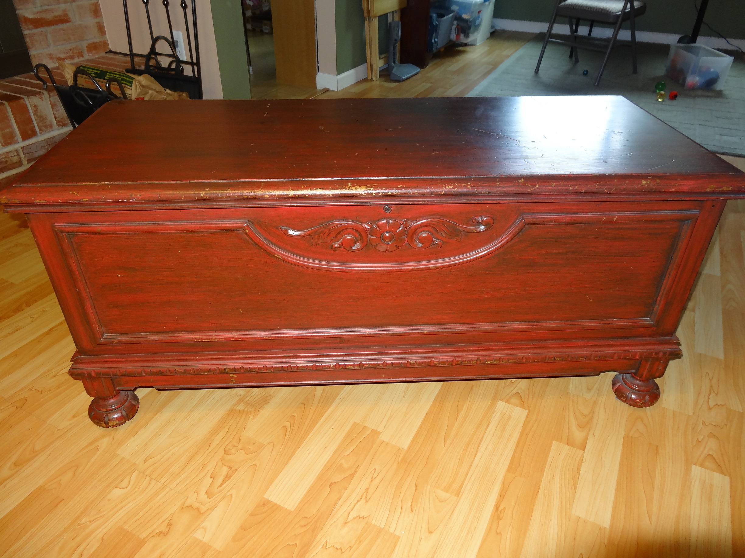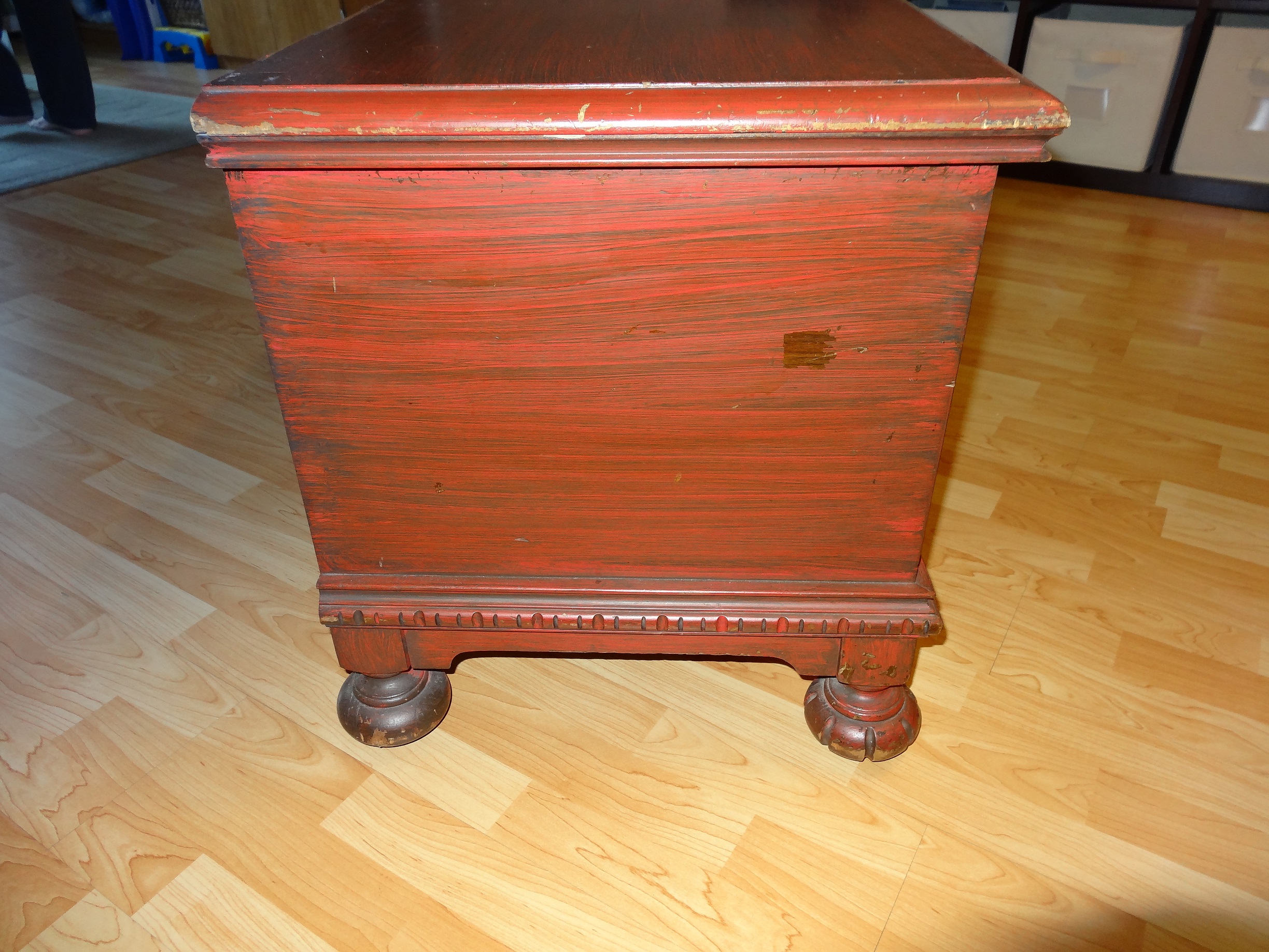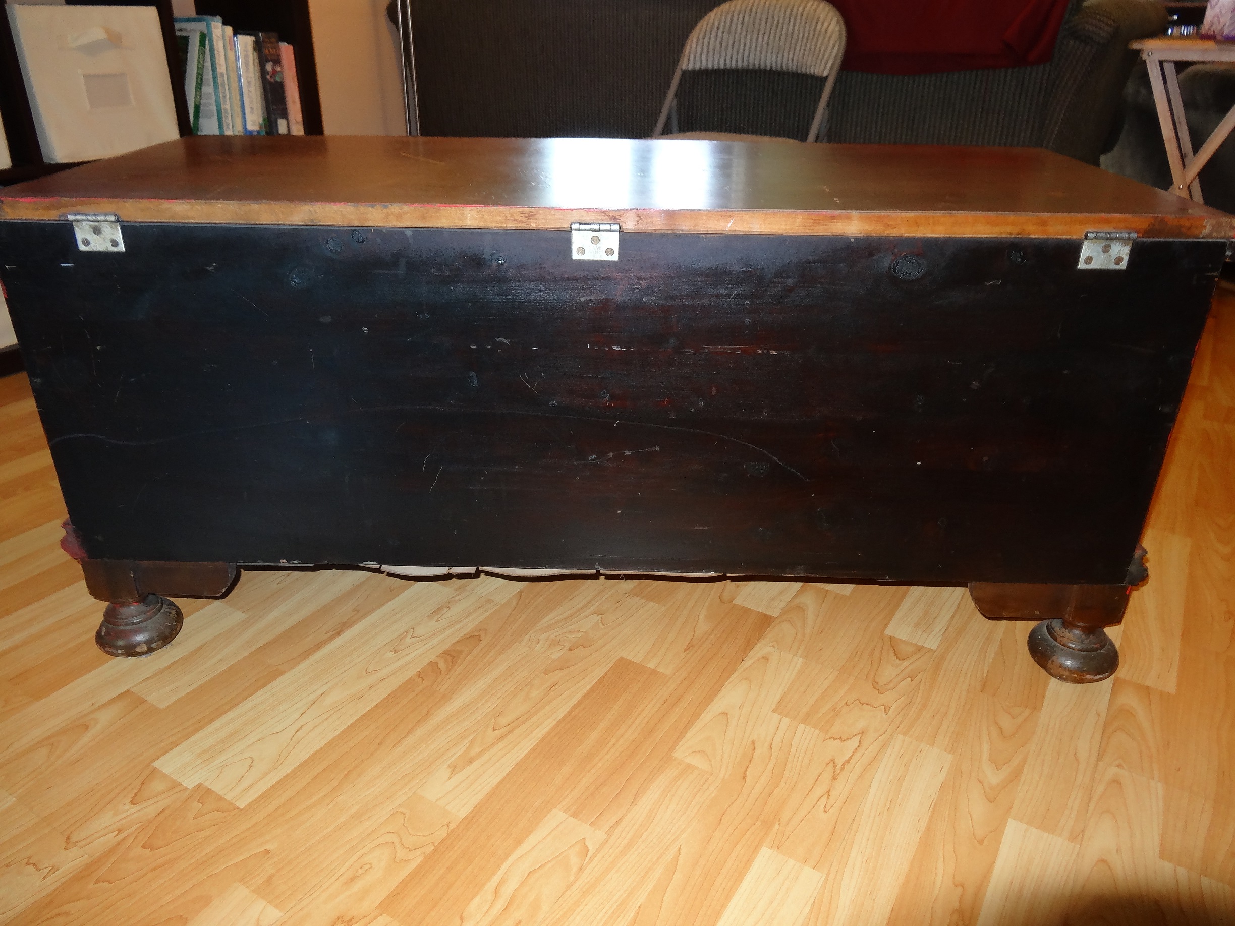 The chest was not well treated before it came into my father's hands, as evidenced by the surface marring and the fact that one of the legs has a part of it chopped off (how they even managed that is beyond me).
