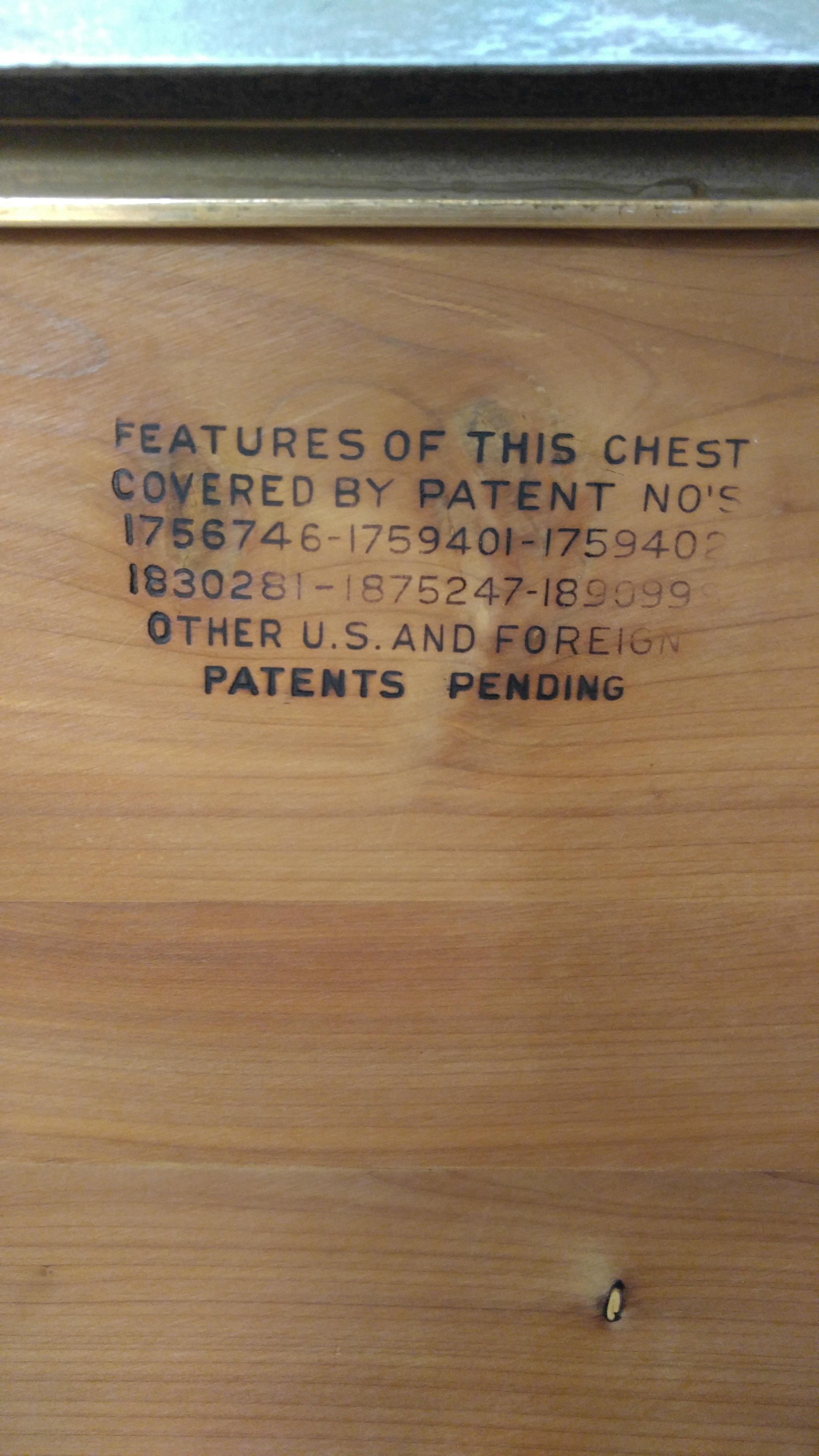 I came across this Lane Cedar hope chest in great condition. Hoping to find out how old it is. It's missing it's serial number, but has several patent no's listed 1756746-1759401-1759402
