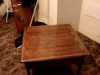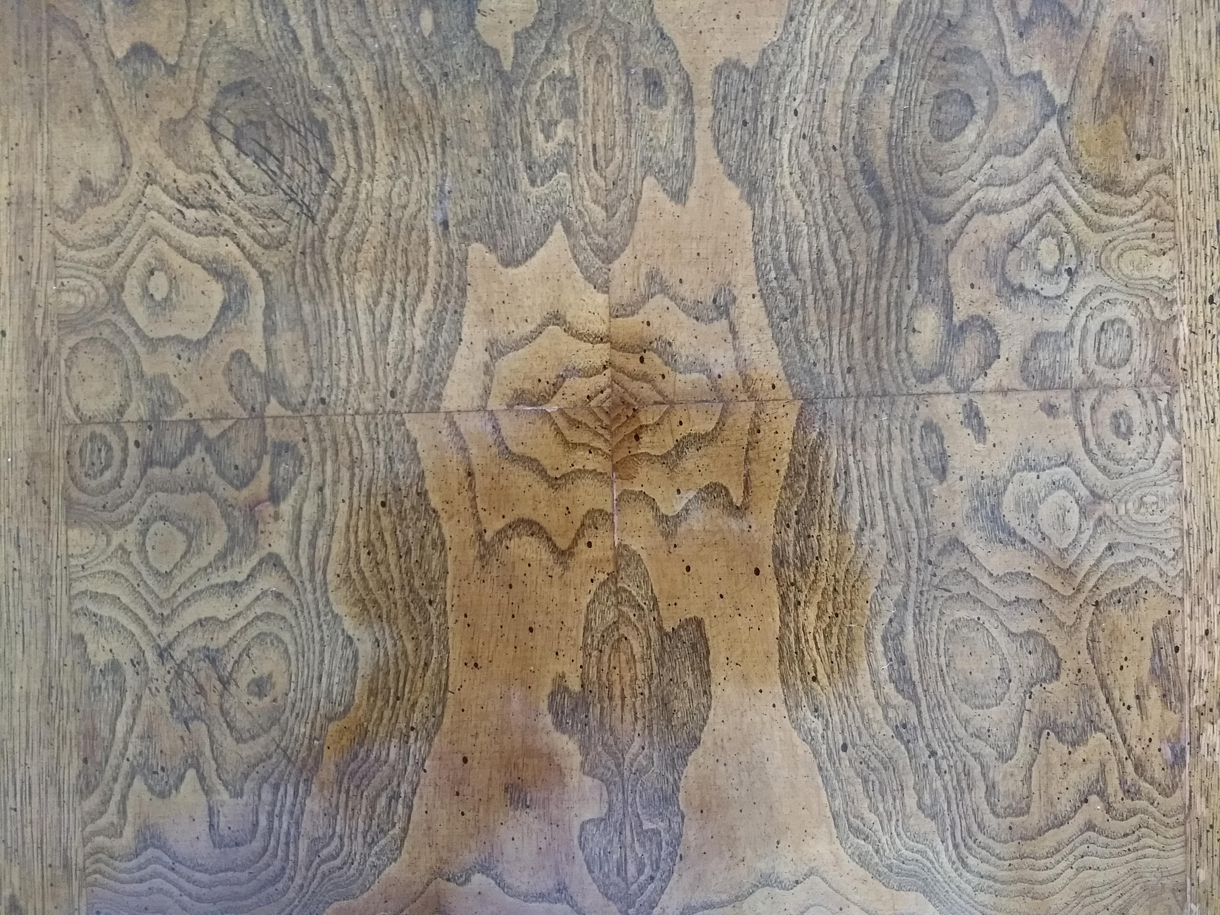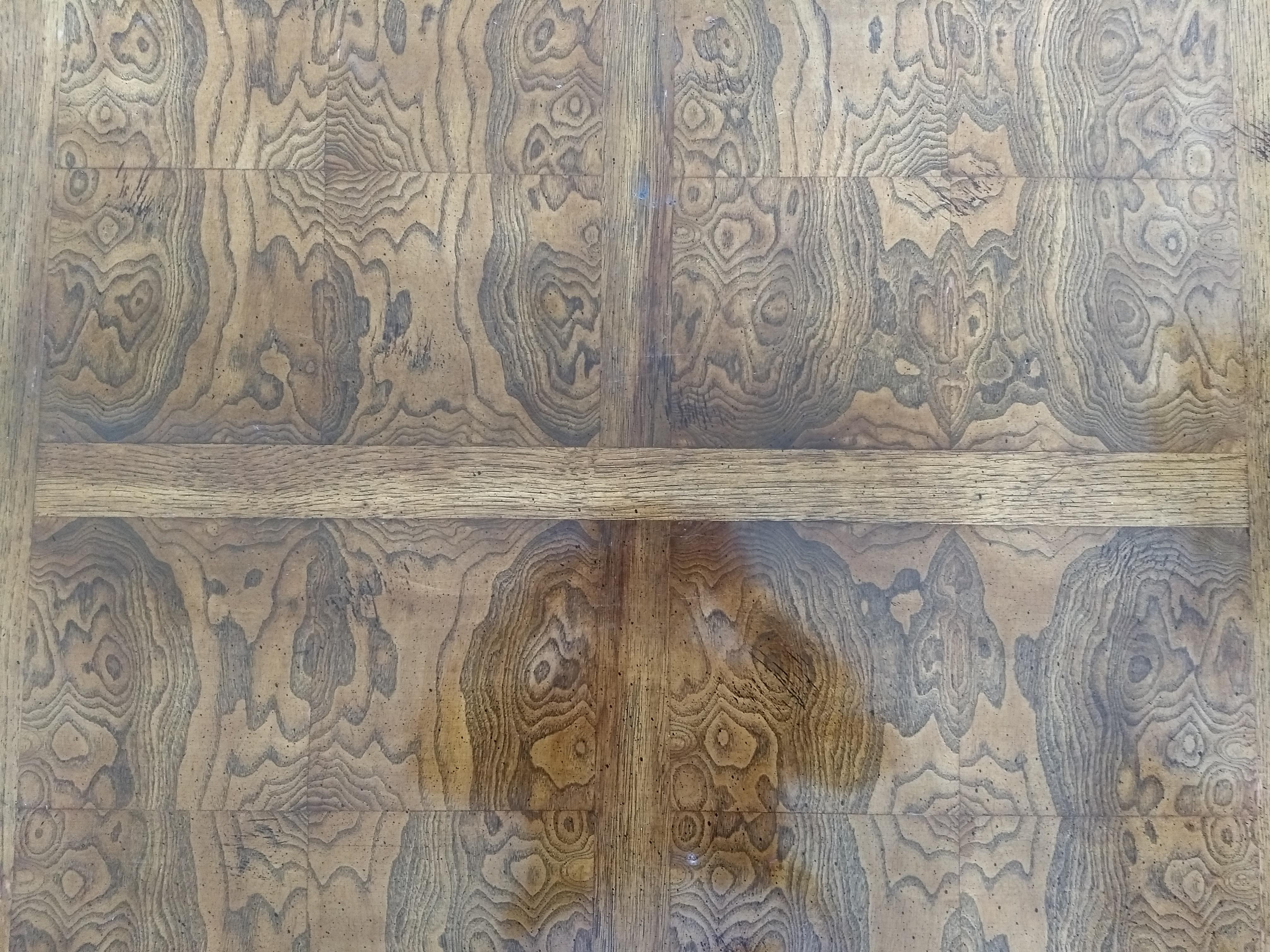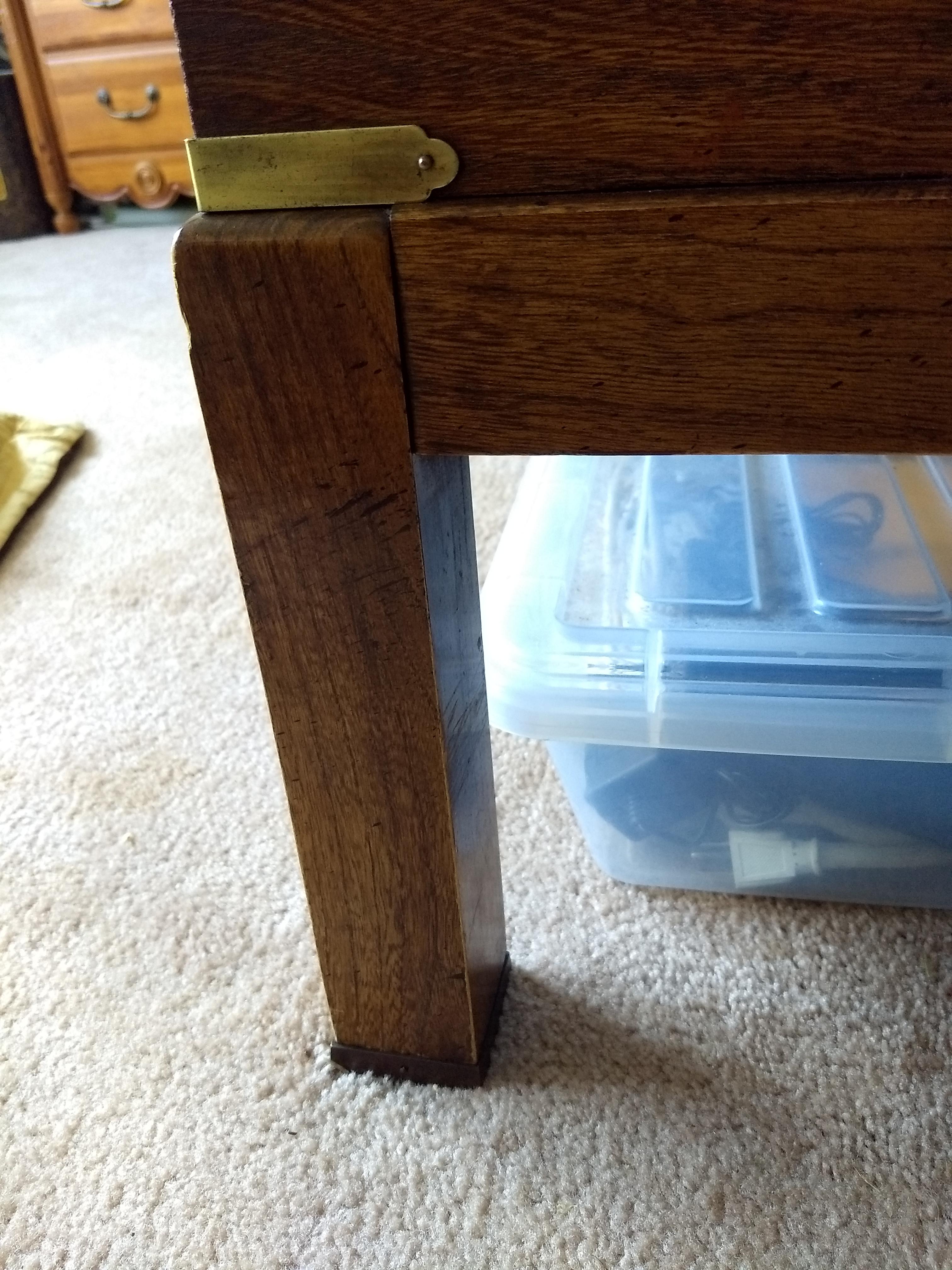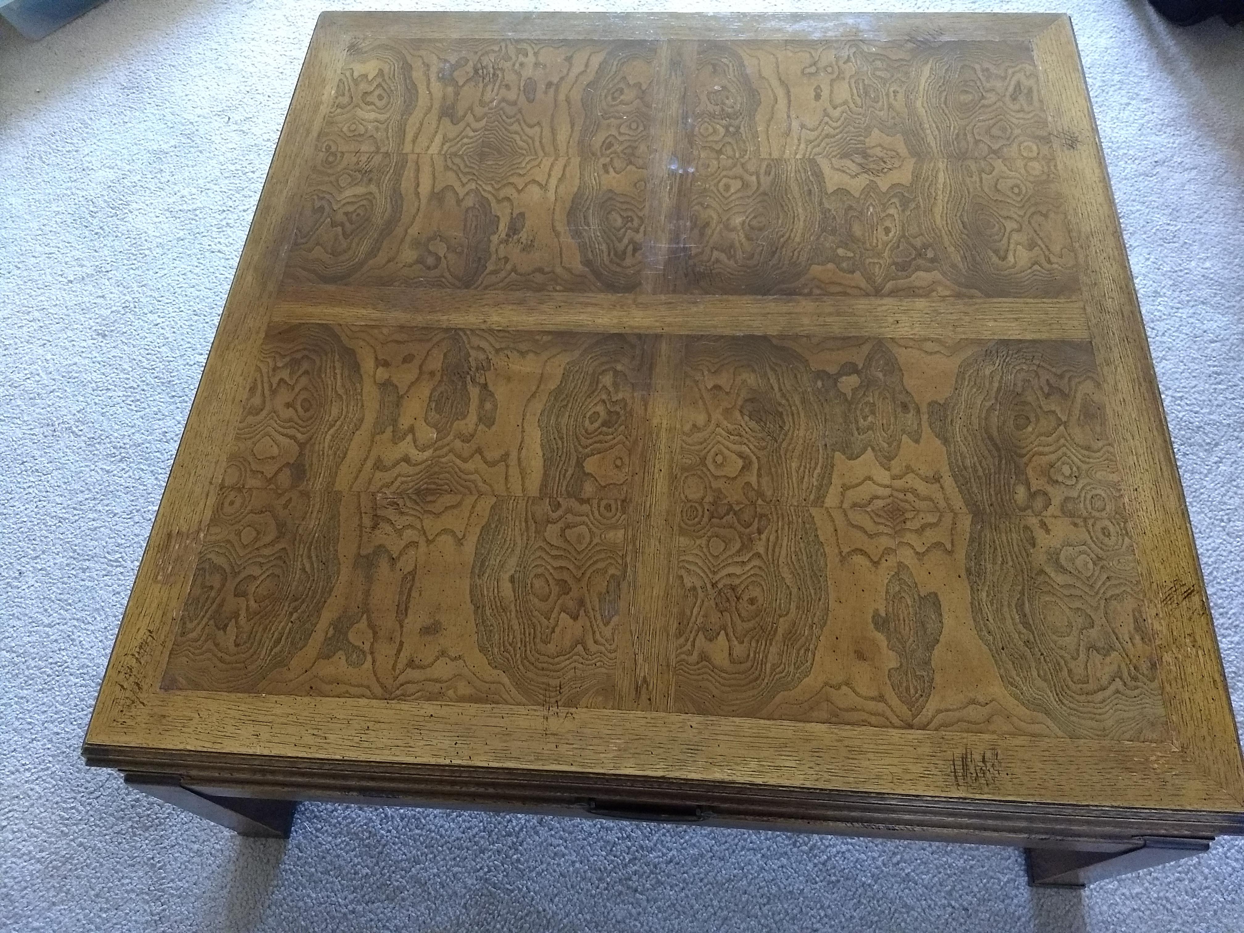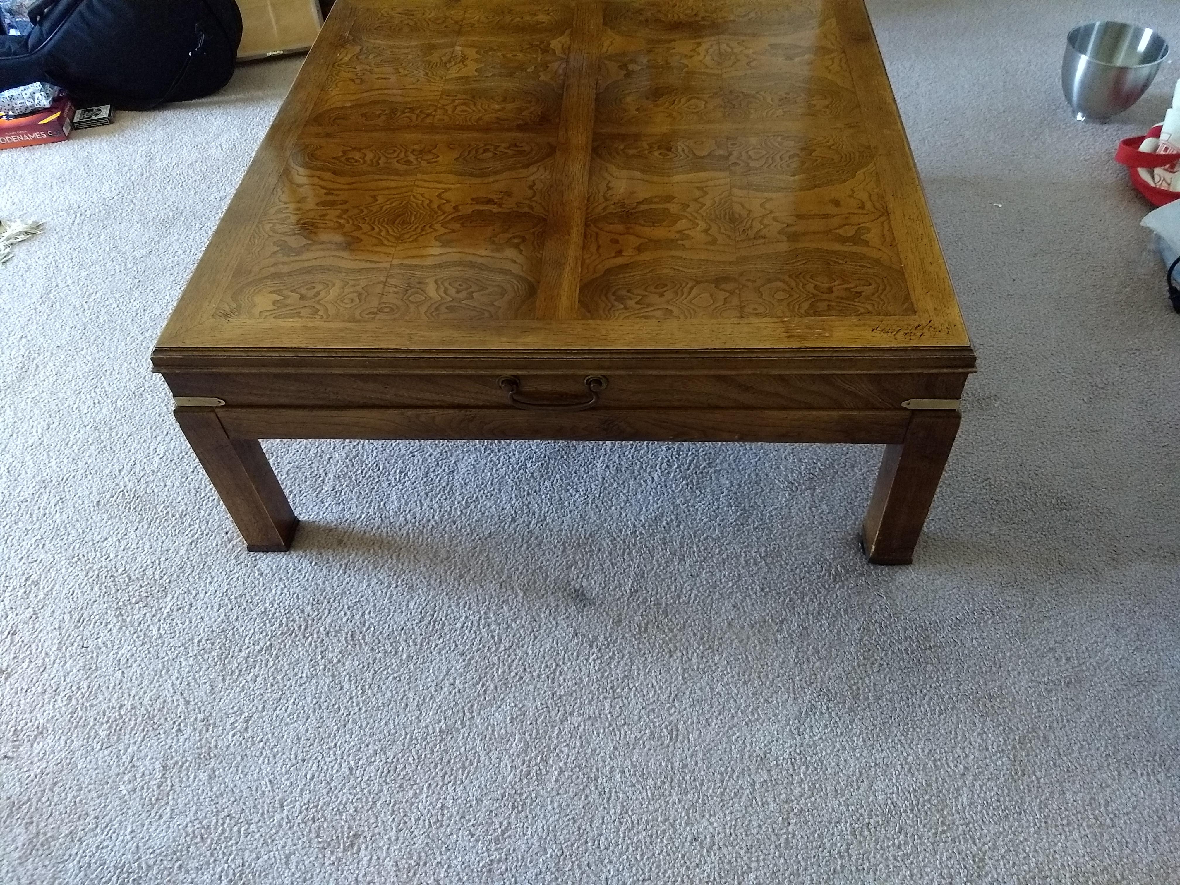 The table itself is 37.5" wide by 37.5" long, and 17" high. To my eyes, the intense variation in the grain of the main horizontal panels suggests walnut, and in several places where the finish has been chipped off, the wood beneath appears quite pale. The finish is roughly 0.5mm thick, comes off in distinct small chips, and is deliberately flecked with much darker and more opaque brown spots and streaks, as if splattered by a brush. These are most evident on the sides of the piece. Each leg terminates in a square brass rectangle that encloses the bottom of the leg where it meets the floor, and this enclosure is kept in place with a single, round-headed brass pin of 1mm diameter on each side of the leg. Above, a brass L-shape is bound just above the leg where it attaches to the horizontal surface of the table, and is fastened in a similar fashion. Each vertical side of the tabletop itself has a centrally-positioned brass handle. All brass fittings appear to be deliberately splattered with a similar brown coating to simulate tarnish. The piece is quite heavy, sturdy, and appears well-constructed. Though in far from perfect condition, I am curious what exactly it is, and what it would be worth if it were undamaged.