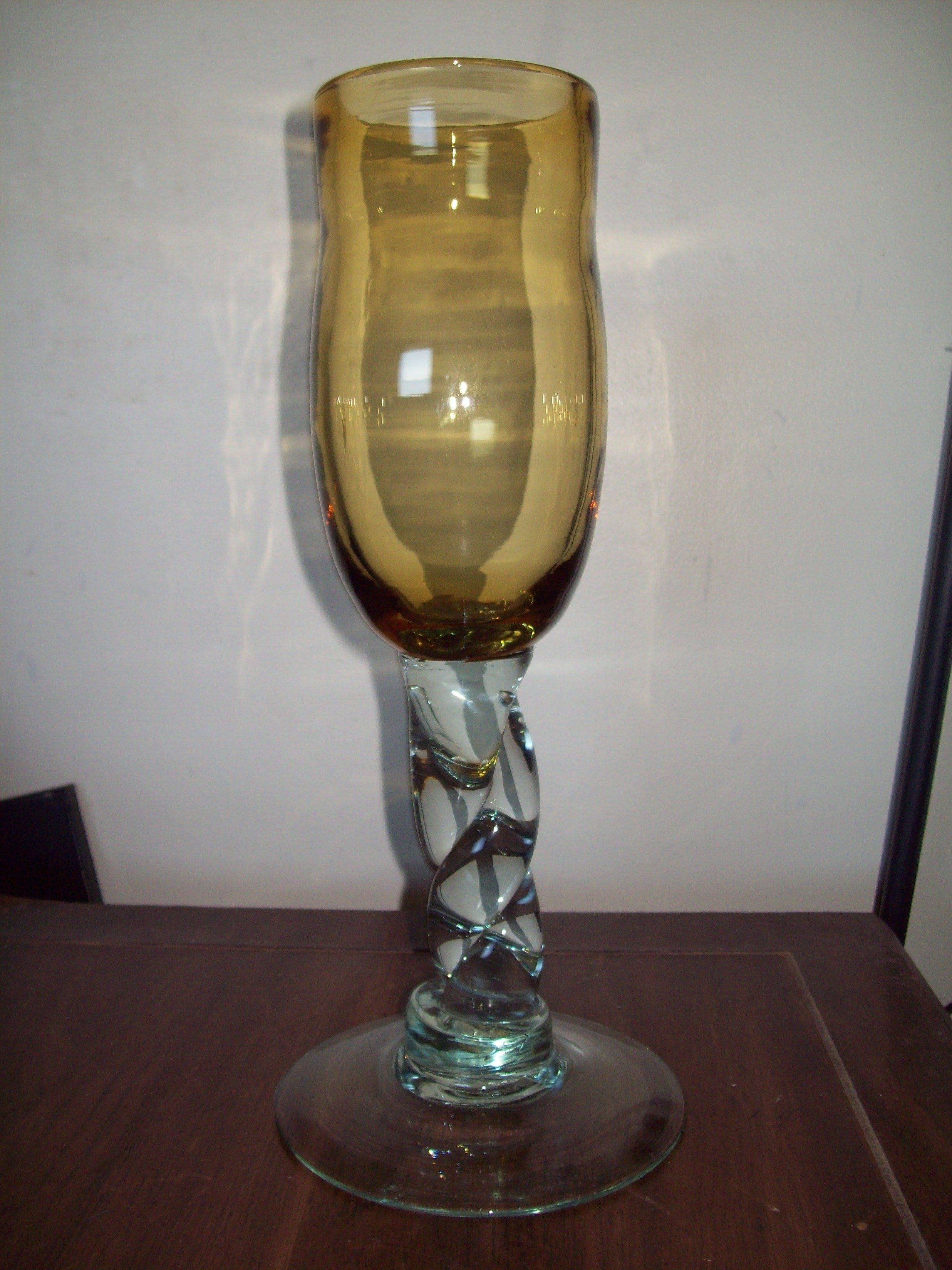 large twisted stem glass 14 inches tall yellow (gold) top. clear bottom. about 5 to 6 pounds