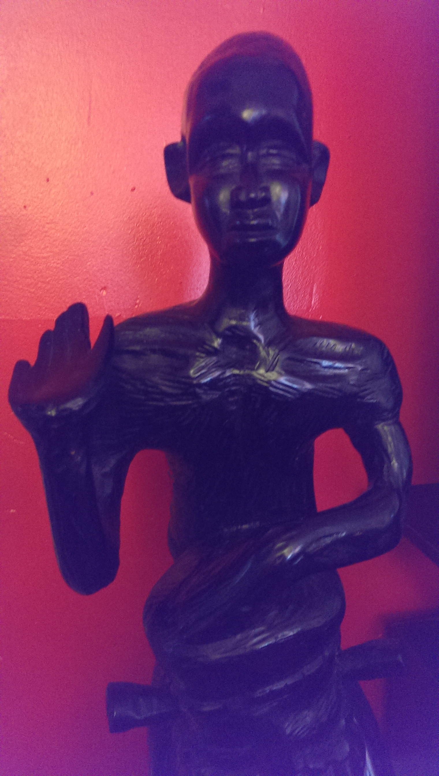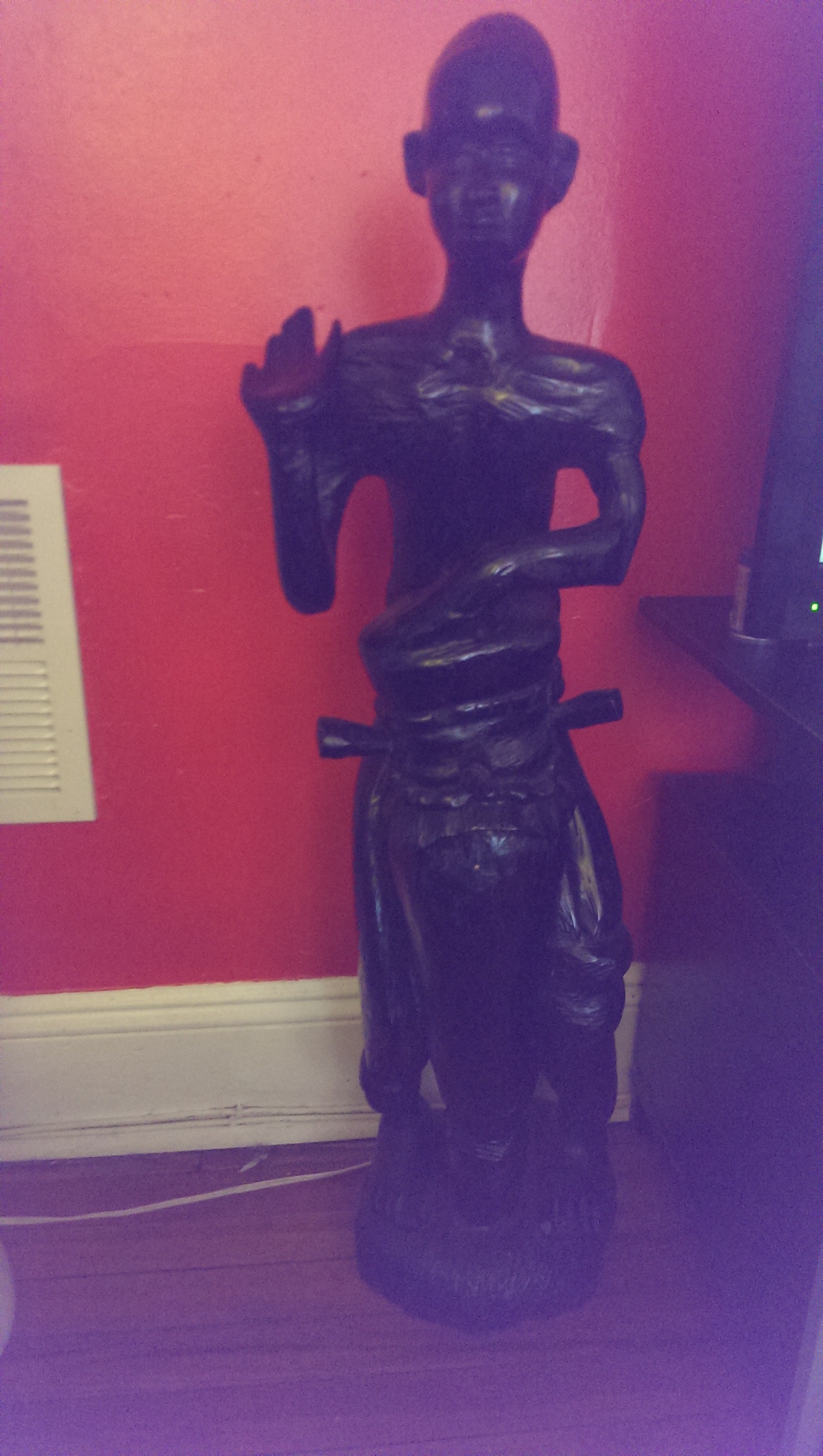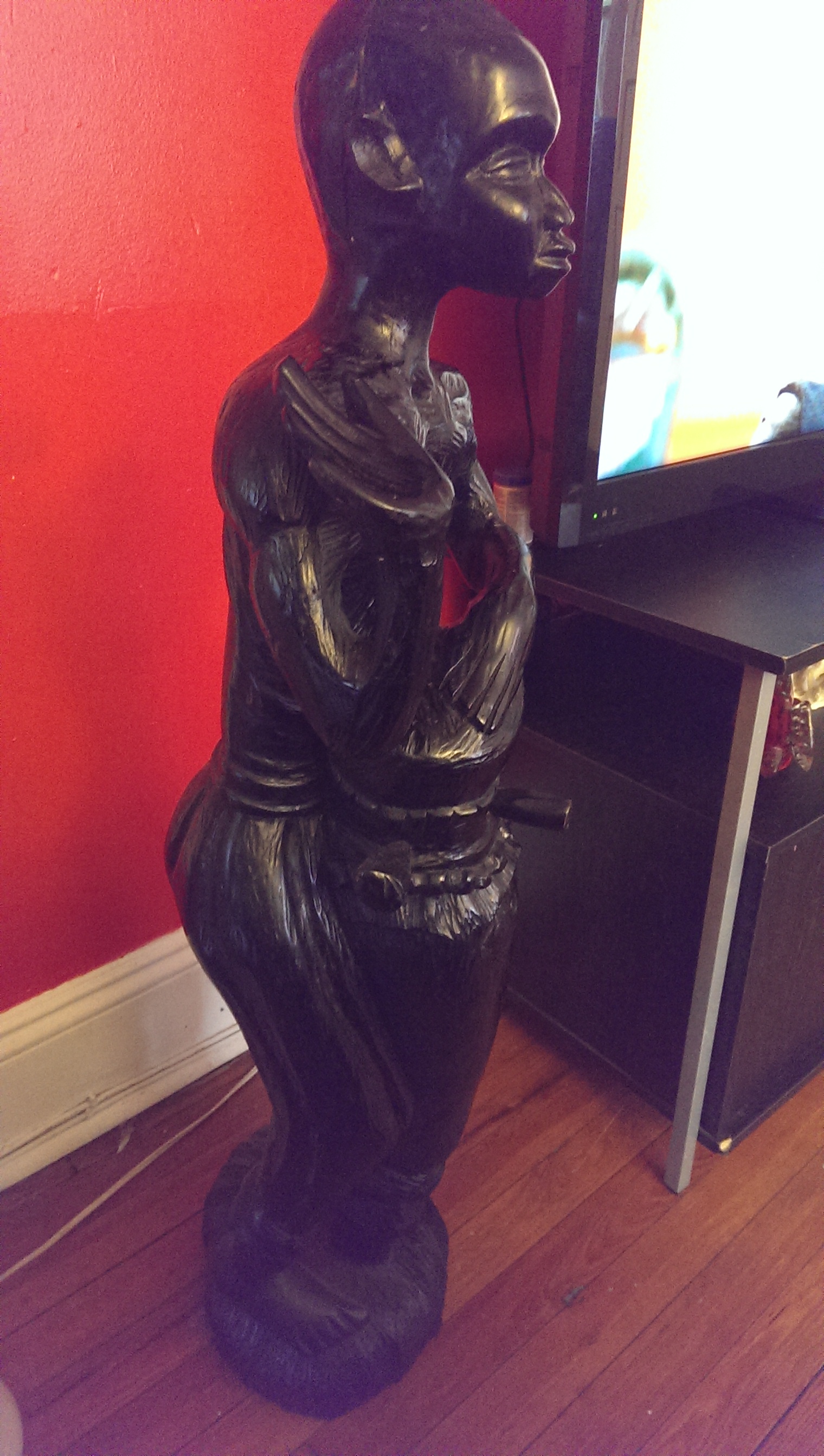 3 foot hand carved African statue playing a drum. Got the statue from an elderly lady. Don't really know much about it.