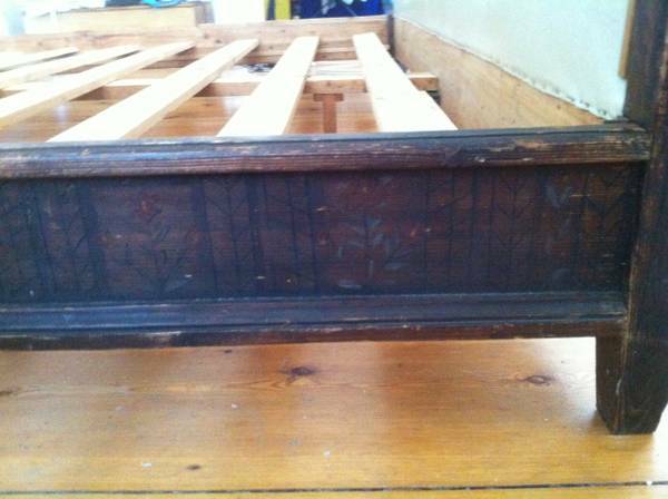 The bed is party restored and supporting pieces of wood have been added to add stability to the old wooden parts. The footboard and sides are handpainted. An animal, presumably cow skin covers the headboard.