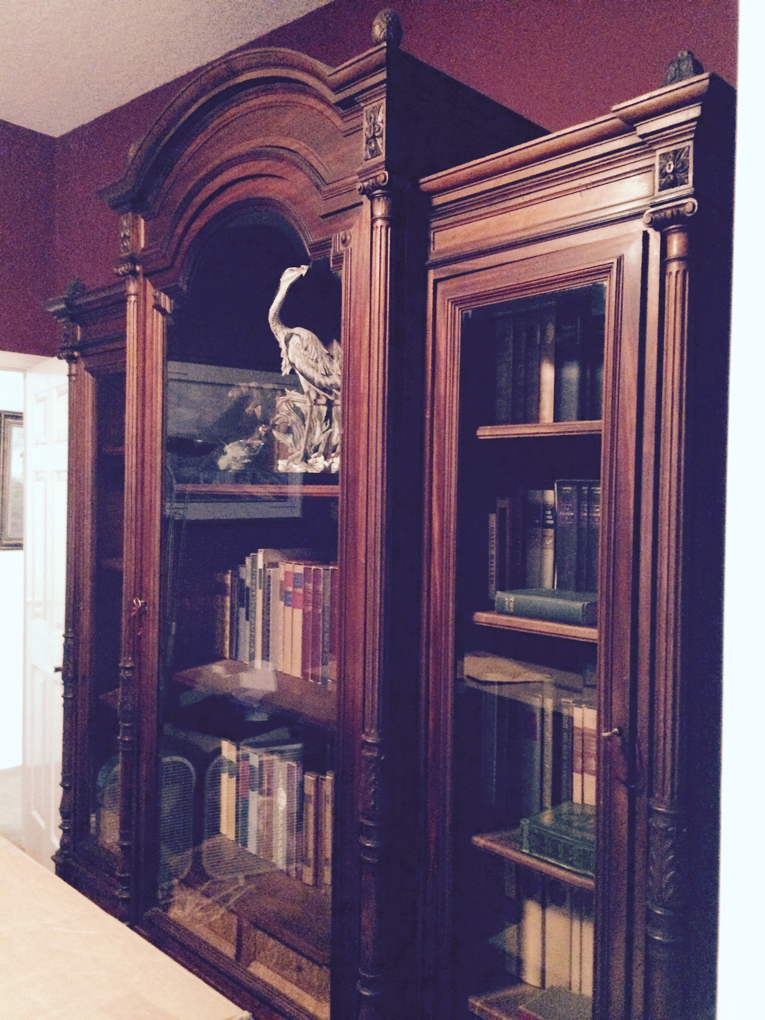This is a 3 piece bookcase (left side, center, right side lock togather into one piece). It measures 86" wide, 21" deep, 96" tall. From the hardware it appears to be French and before 1860. The doors slide on to the hinges (no screws-photo shown from bottom view). There is very little hardware (2 large screws secure each of the side pieces onto the center-photo shown). The tops of the doors, a piece sticks into a hole on the piece and the bottom slides and to the hinge (photot shown) and the door sits on it with no screw. There are a few worm holes on the back (could not get to for photo). There are a couple splits in the side of the cabinet (very small and can only be seen when a light is shined in). On the bottom right corner there is a bit of damage. There are normal scratches from use over the years. This is a beautiful and large piece, the photos do not do it justice. It has all 3 keys which I believe to be the originals. The are no labels or stamps on the piece, on the inside edge of the center door is some writing in pencil but it is unlegible to me (photo shown). The lock for the center peice still works (photo) but the side pieces no longer lock.