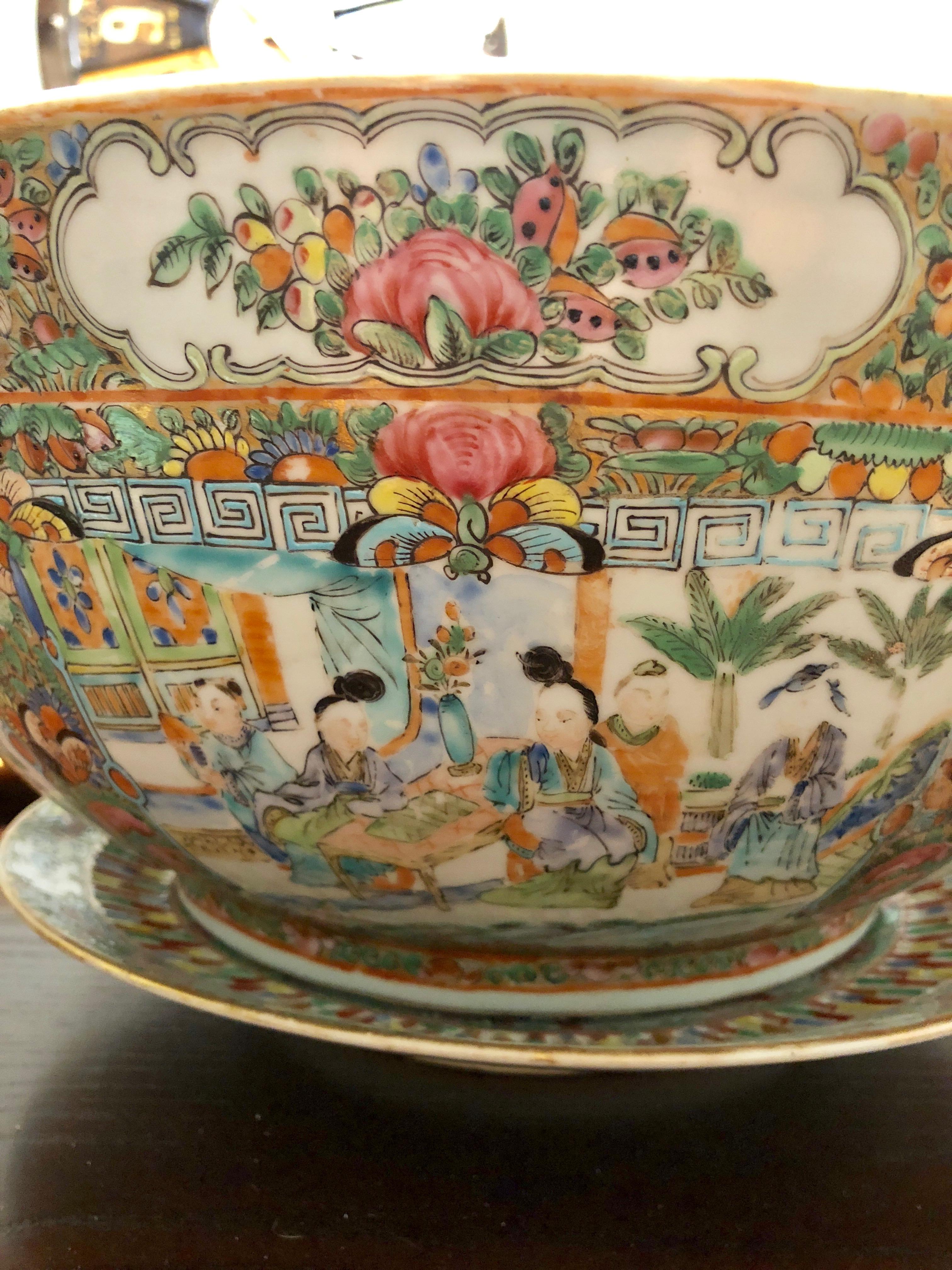 In the family for approximately 80 years. A Great Grandmother was a missionary in China in the 1930s. The bowl was given to her by a family to save from Japanese invasion. It was smuggled out to the US just before WWII and was lost for many years in customs at one point. We believe the bowl and stand/plate are between 150 and 250 years old. Possibly older.