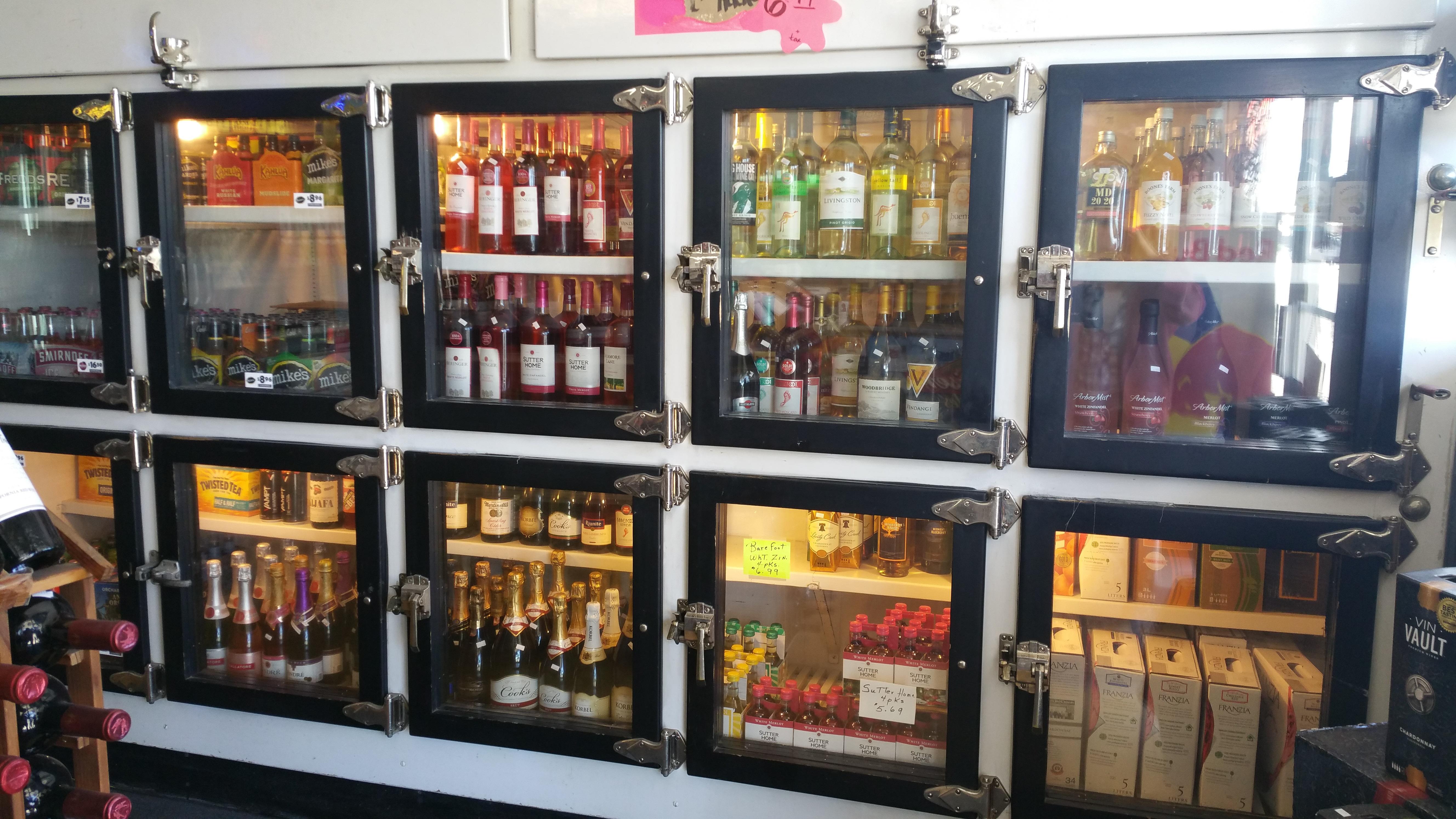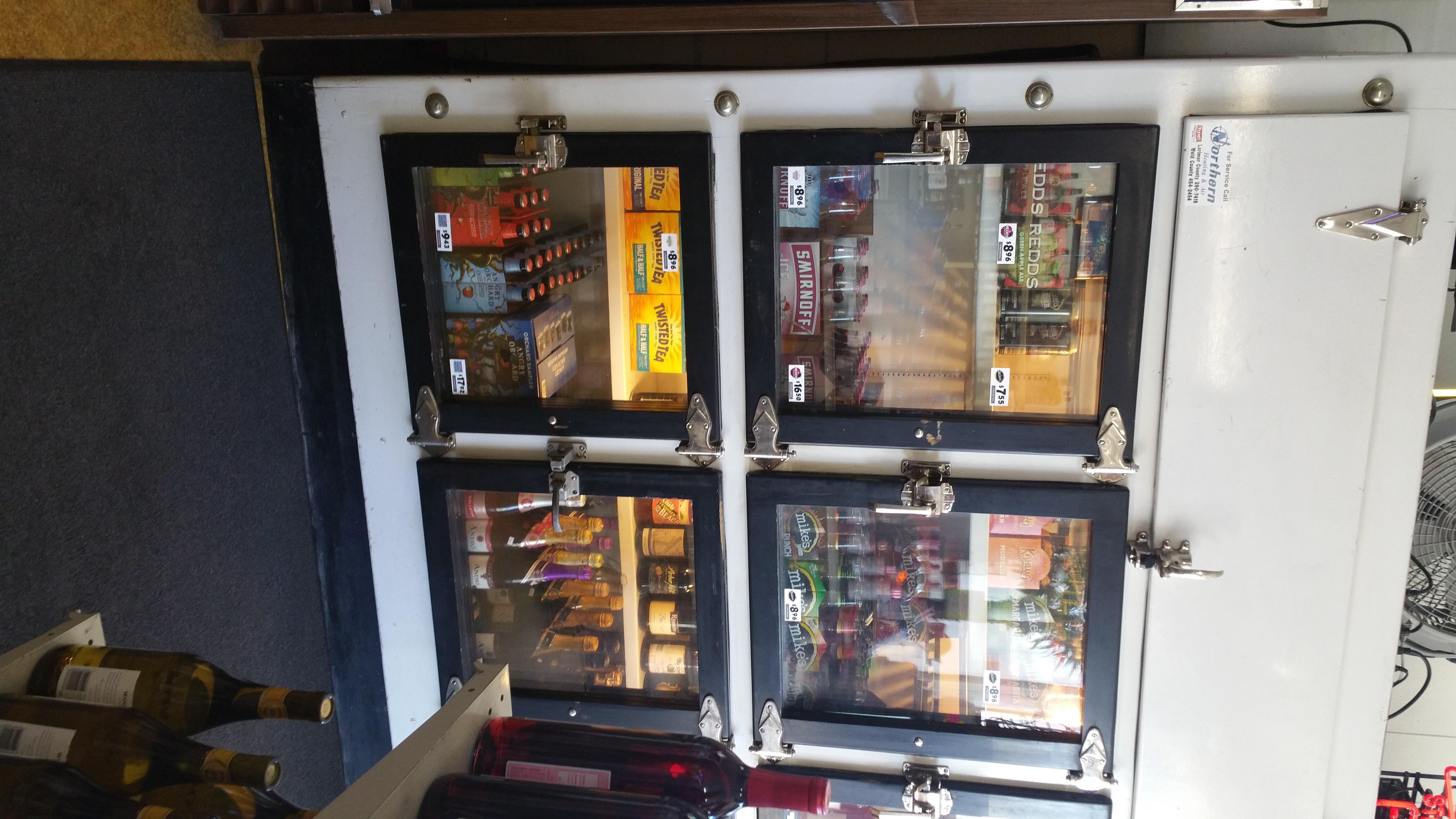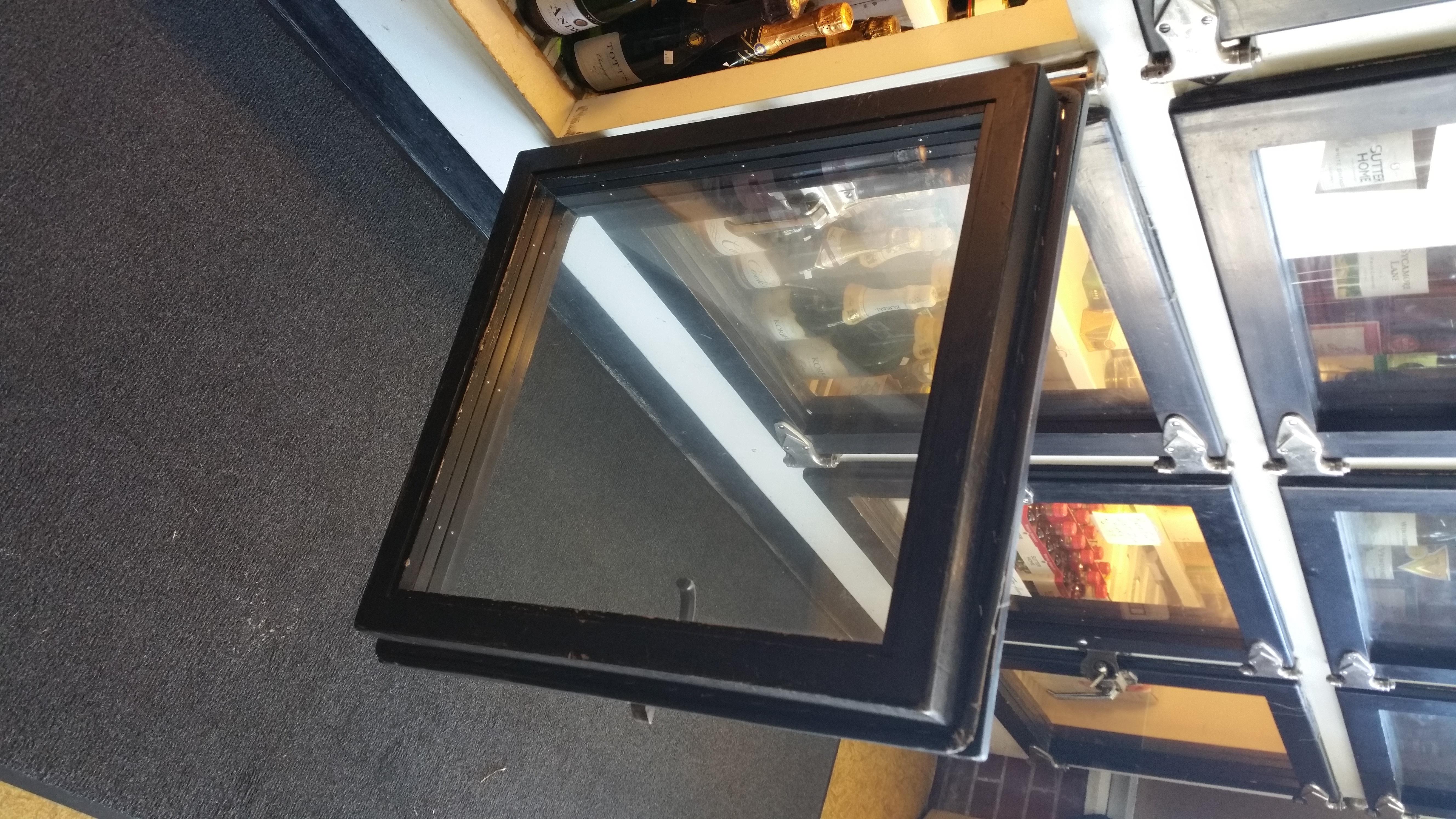 Very large ice box that has been converted into a refrigerator/wine cooler for a liquor store. I cannot find any manufacturer or date markings. The building it is located in is over 100 years old, I have no idea if it has been in here that long or when it was built in here. Pretty sure it is all wood with metal/aluminum covering on some parts. 10 wood framed glass front doors. All shelving on the inside is wood, metal brackets have been added to help support the weight of the product we keep in it. Light sockets located inside also, I would assume they were added when the conversion was done, probably in the 1970's???? Ice pans are still located in the top portion of the unit.