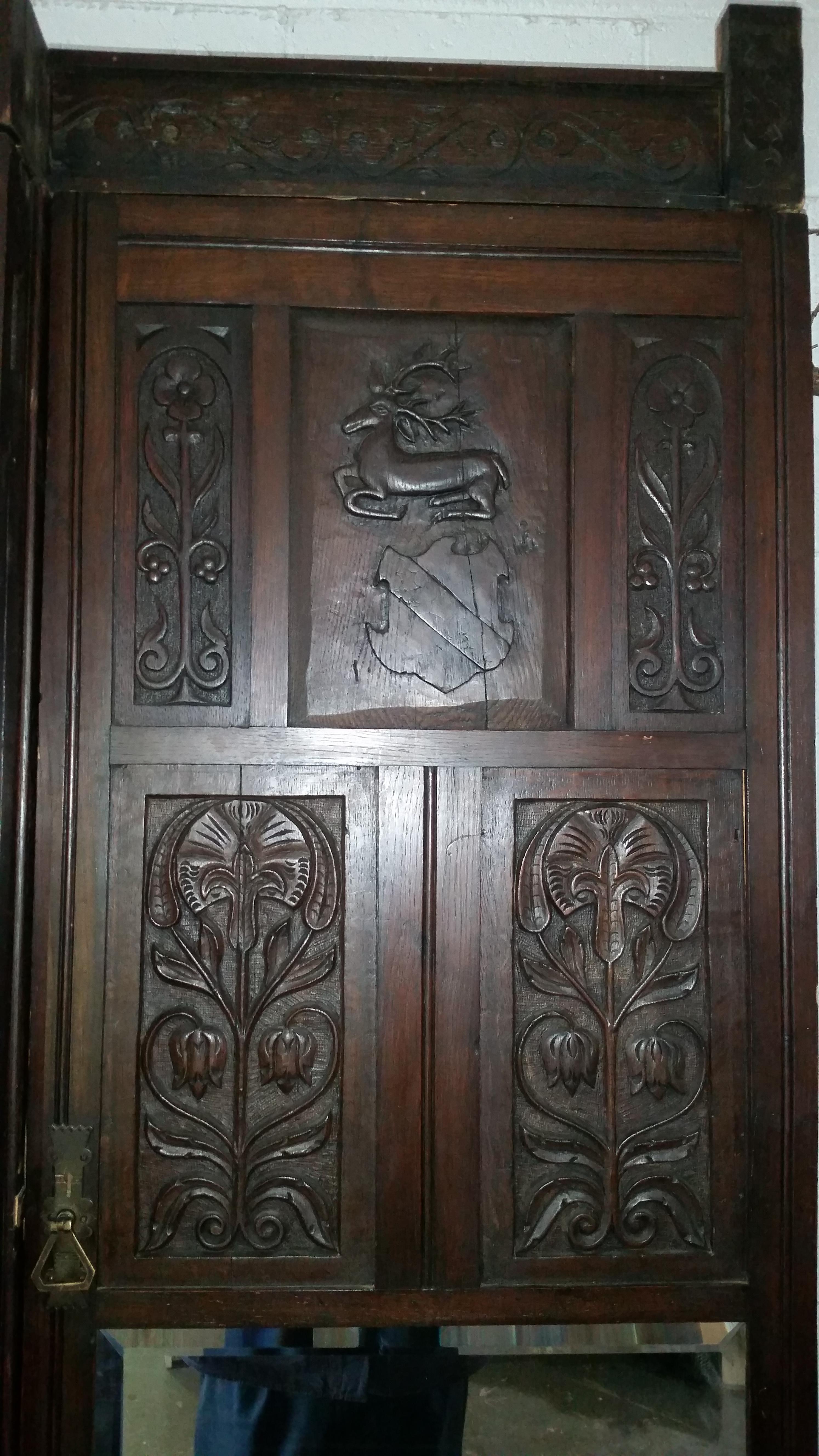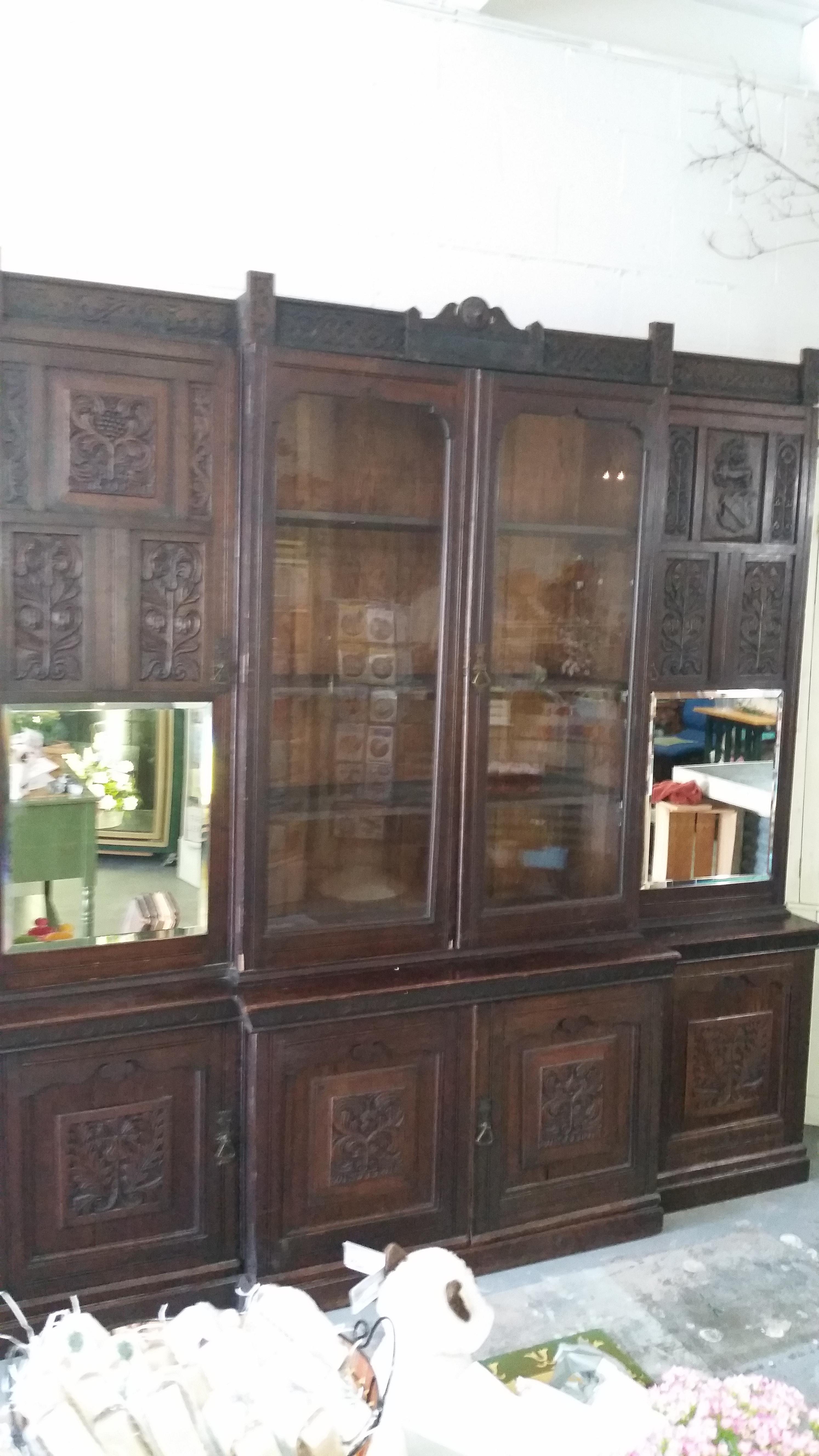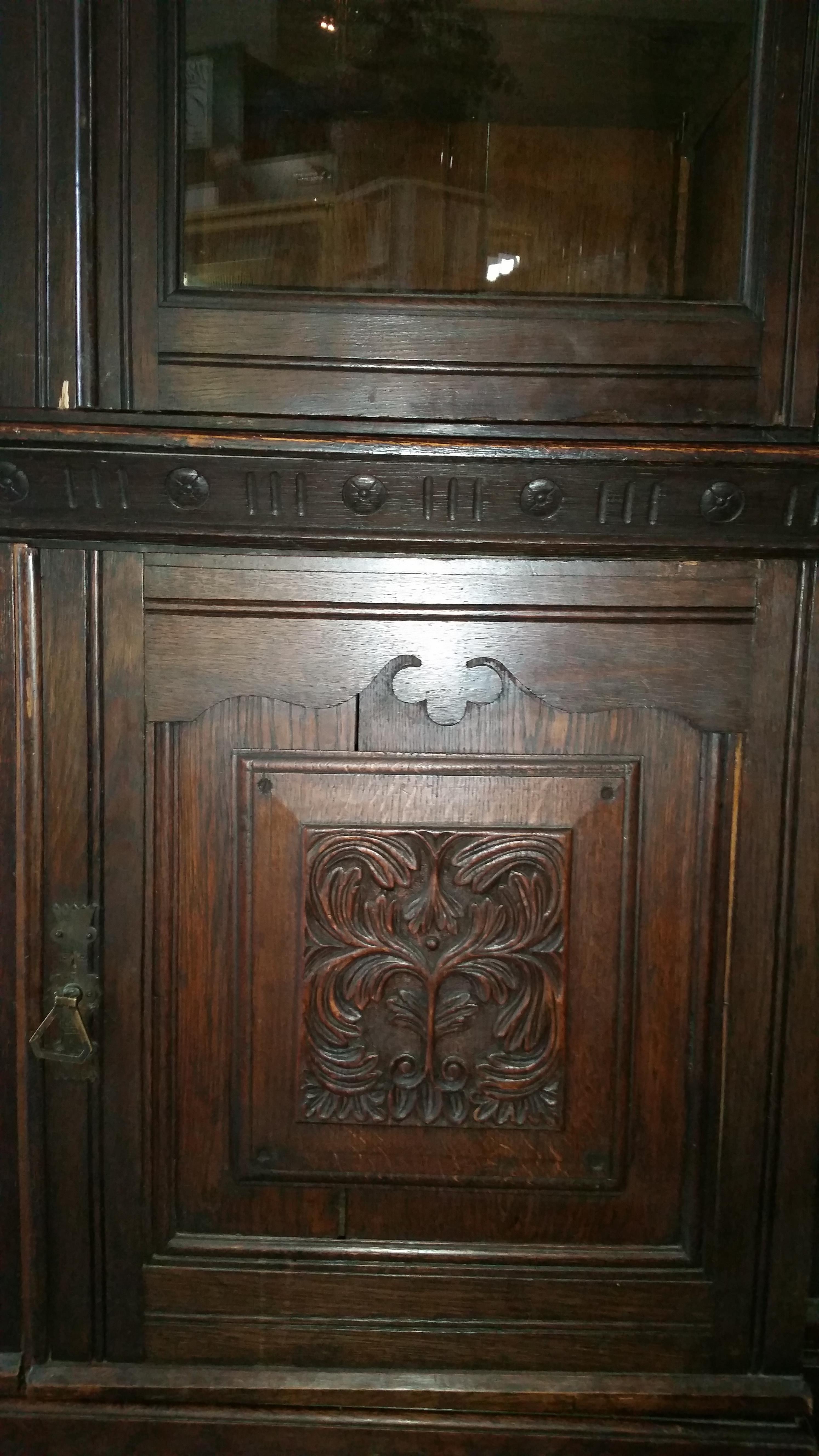 This cabinet is nearly 8 ft tall and 8 ft wide appears to be oak and is very dark.