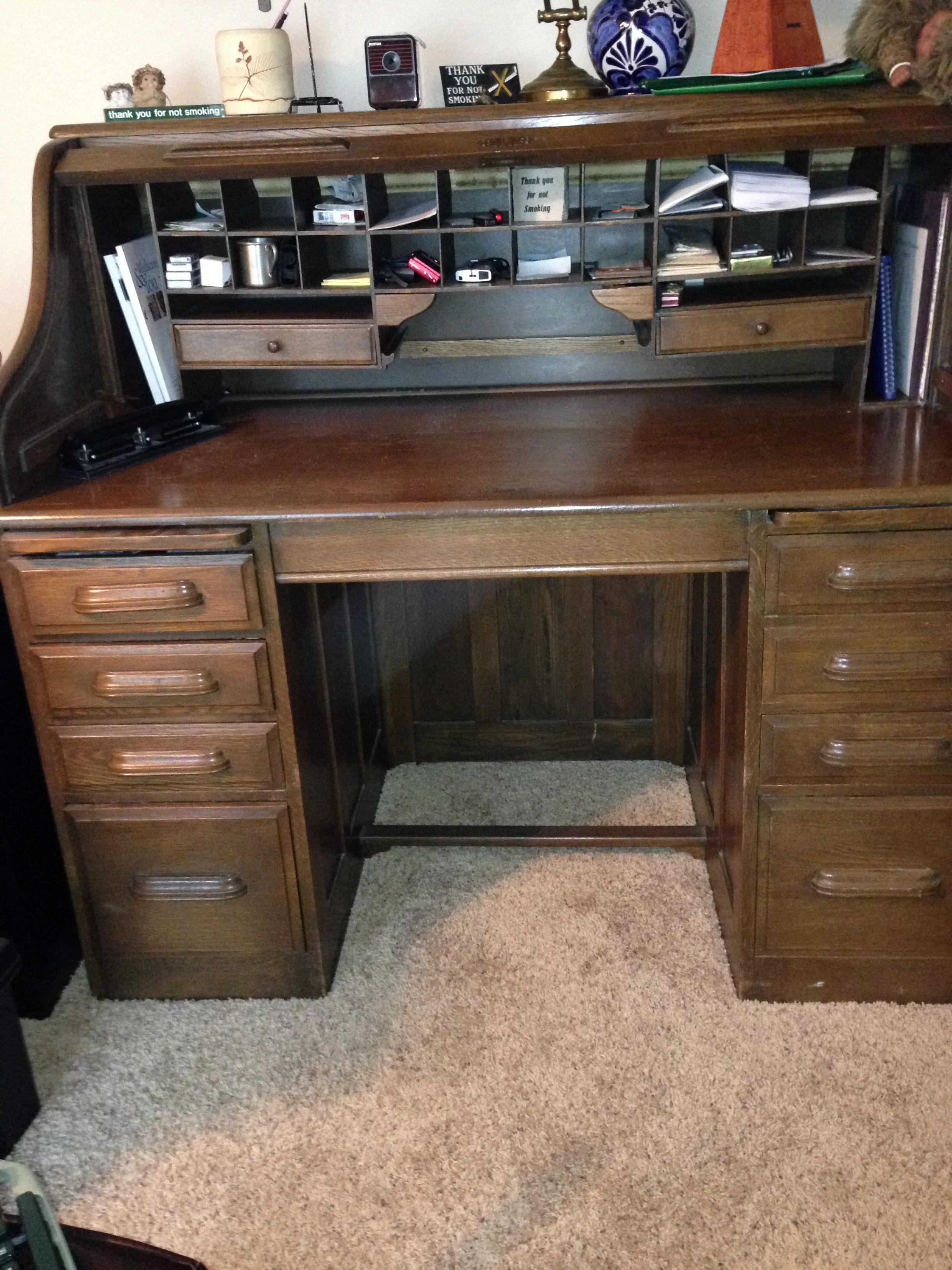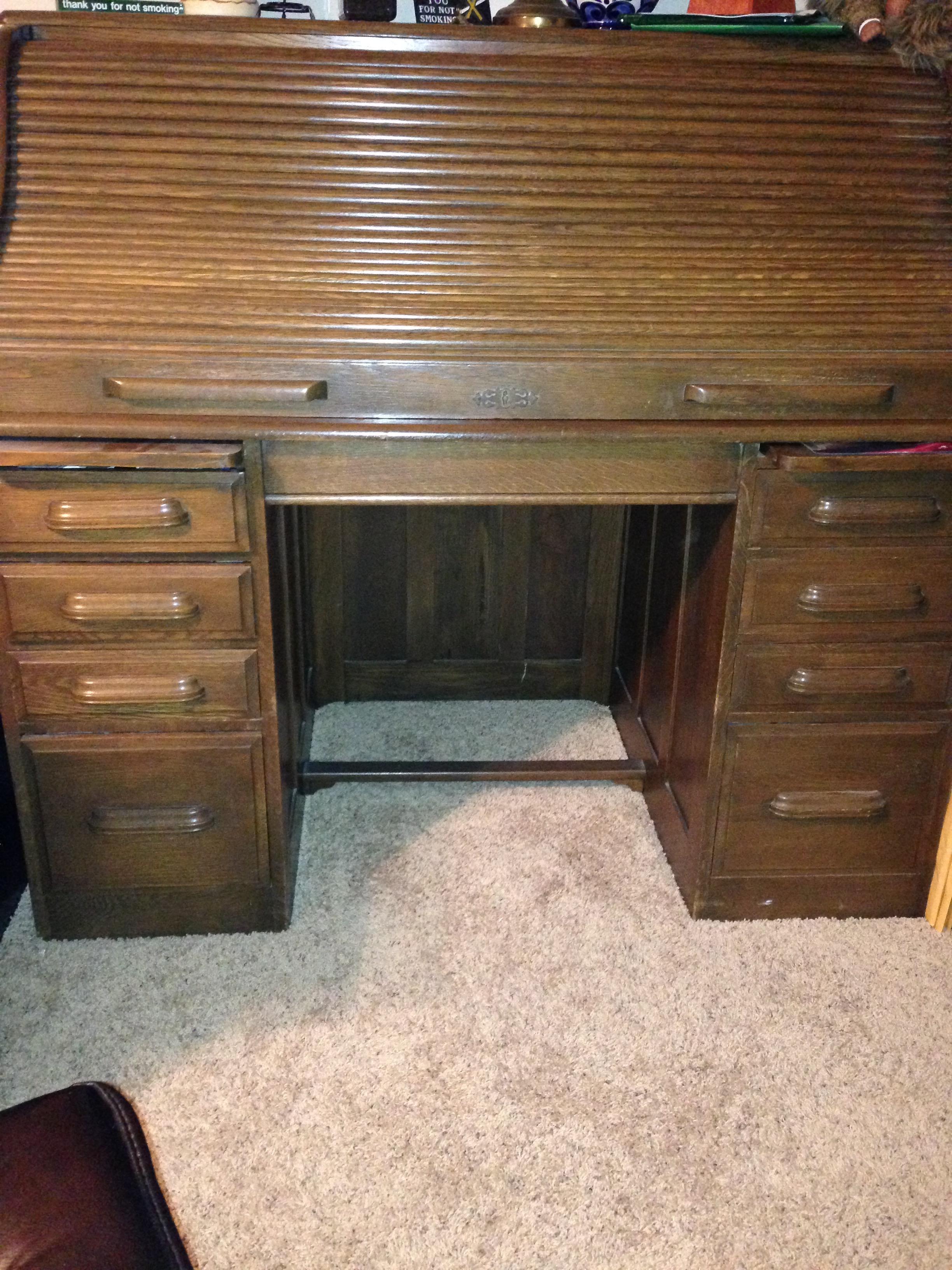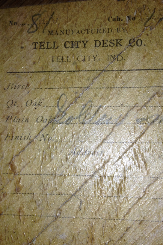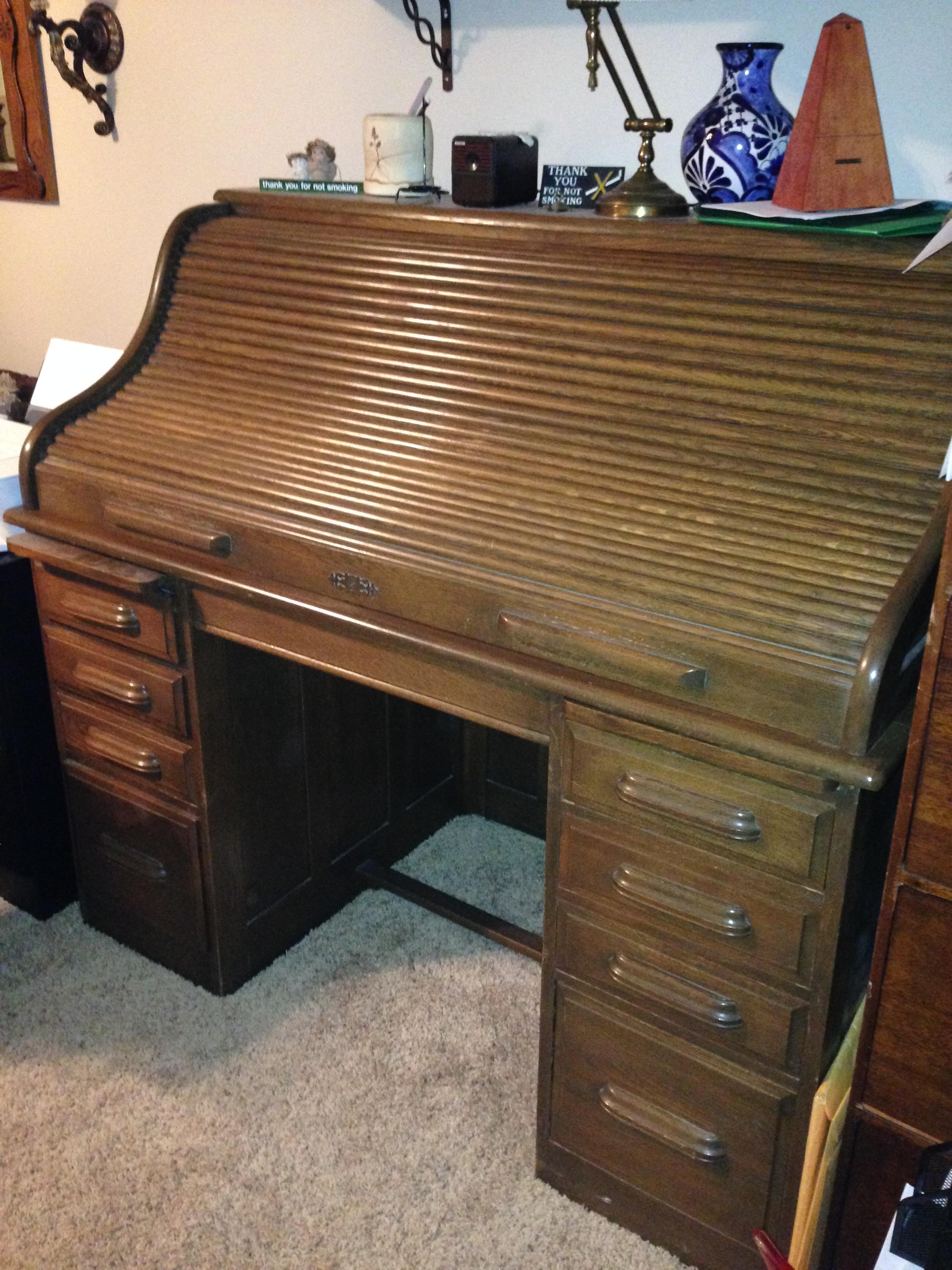 My parents bought this beautiful roll top desk about 50 yrs ago. It has a paper under the desk top that says Tell City Desk Co. #81 There is little hardware, a couple of screws and the lock. The wood is put together by interlocking- a picture of the side of a drawer is included. Also, seen is the inside of a drawer. Thin wood slats work as dividers. The bottoms are thin wood also. On either side of the center open area are carved areas for probably pens. and also there are 2 little drawers that have curved bottoms. I really would like to know how old this desk is and how much its worth. I don't know if I want to sell it. Thanks so much for your help.