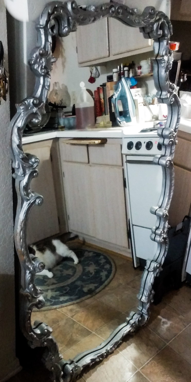 Galax corp large horizontal wall mirror, silver wooden Ornate frame w55 L35 irregular shaped. might be french