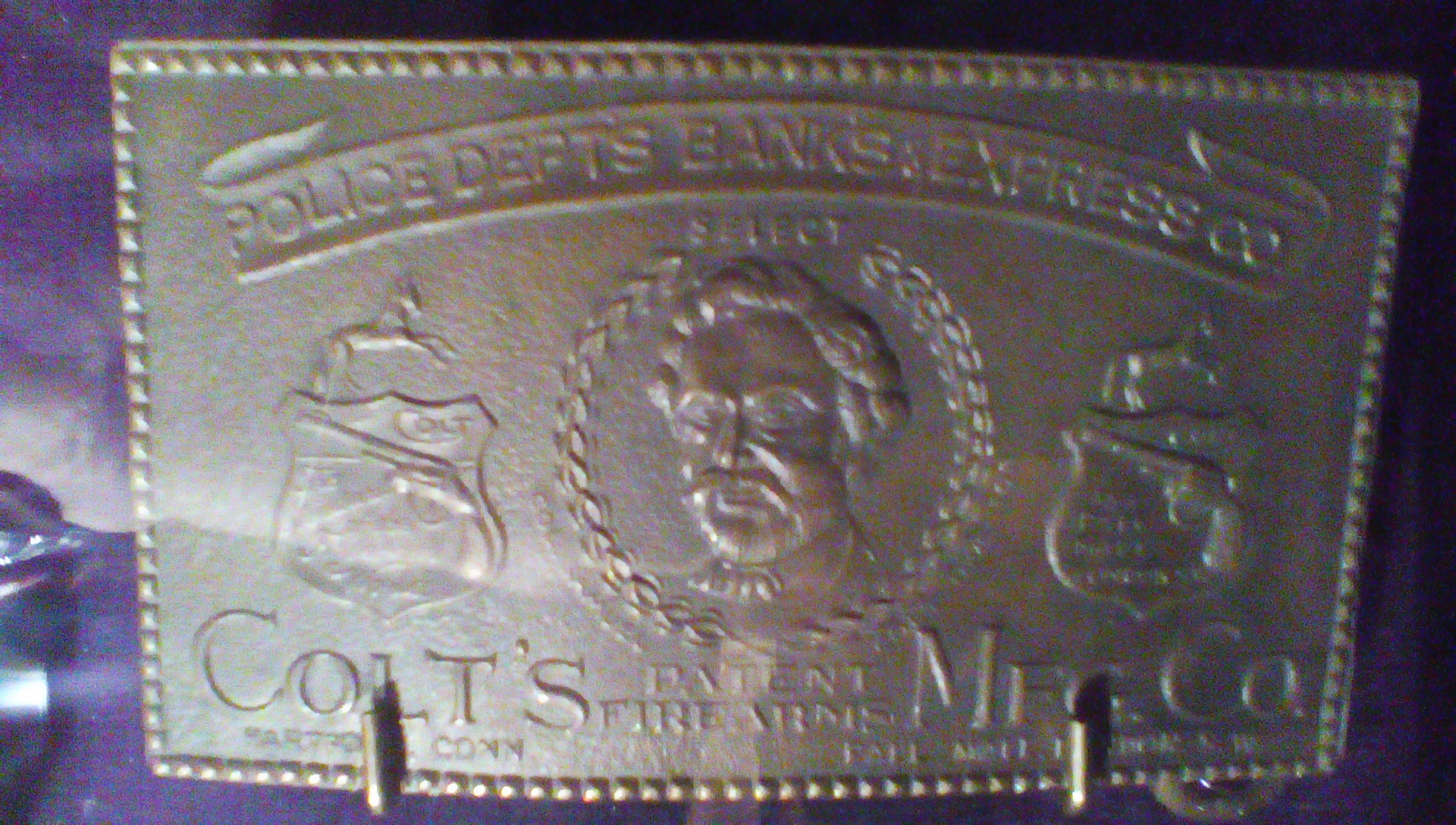 Banner across top says: POLICE DEPTS BANKS and EXPRESS CO. in caps. There is a likeness of Sam Colt in the center flanked by a shield with a pistol and some text in it on each side. On the bottom it says: Colt's patent firearms Mfg. Co. and below that is Hartford, Conn. in the left corner and Pall Mall, London. S. W. in the right one.