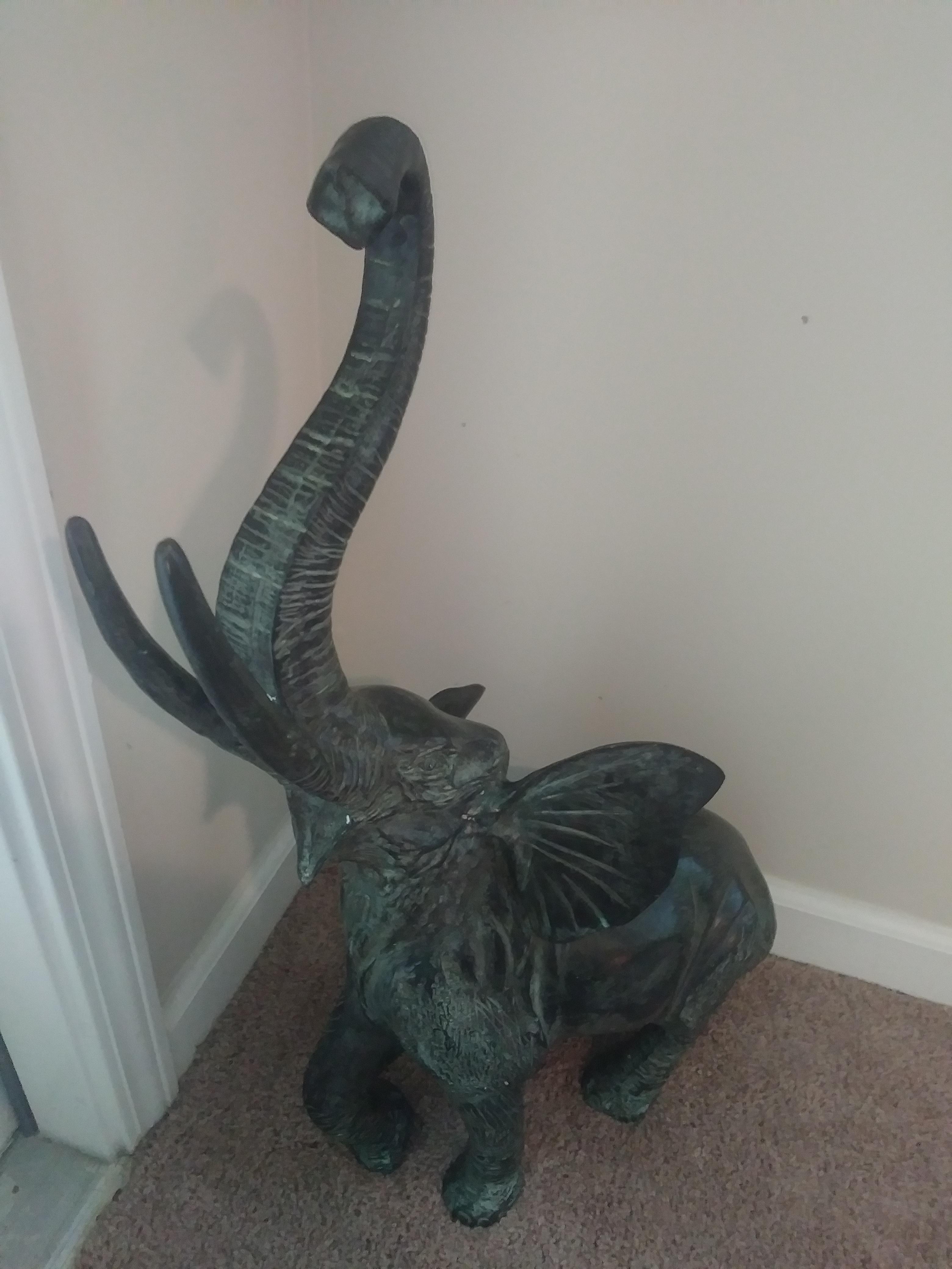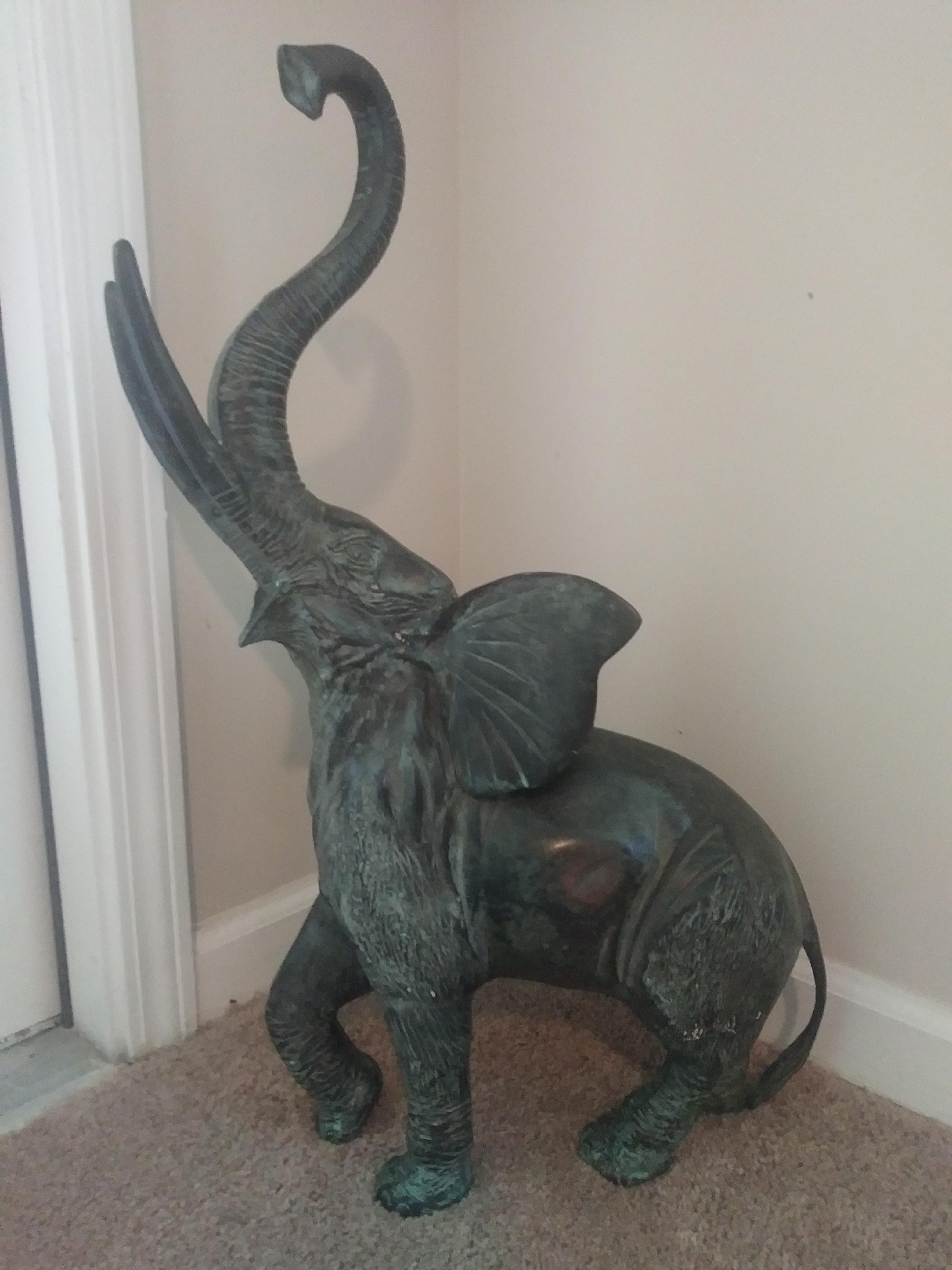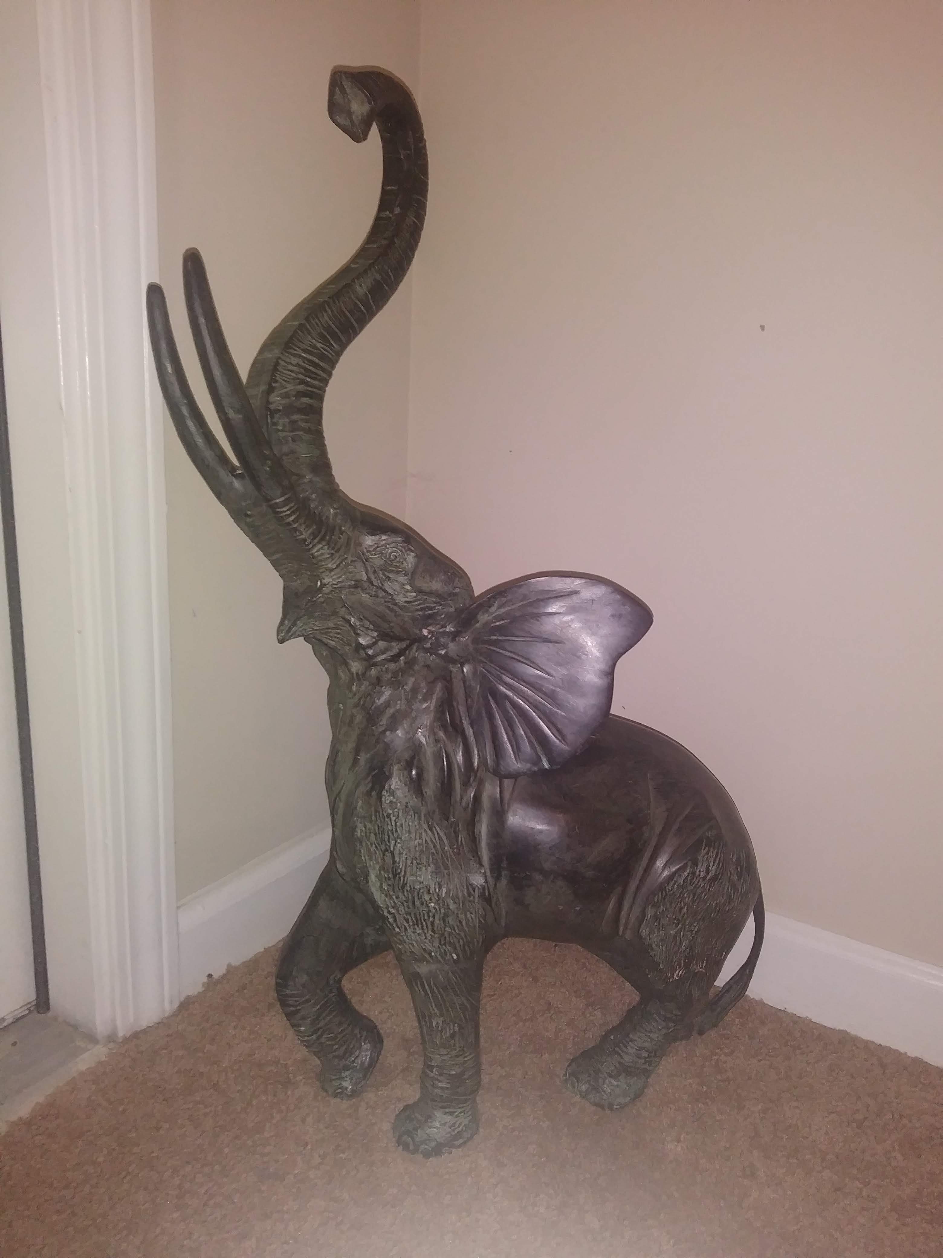 I was given this giant elephant for prosperity and good health by a indian woman I met. It's about 3 ft tall, 18 inches long. Weights around 50 lbs. Has green wax you can see in bottom of elephants feet. Dont know where to look for markings. Dont know much more about it.