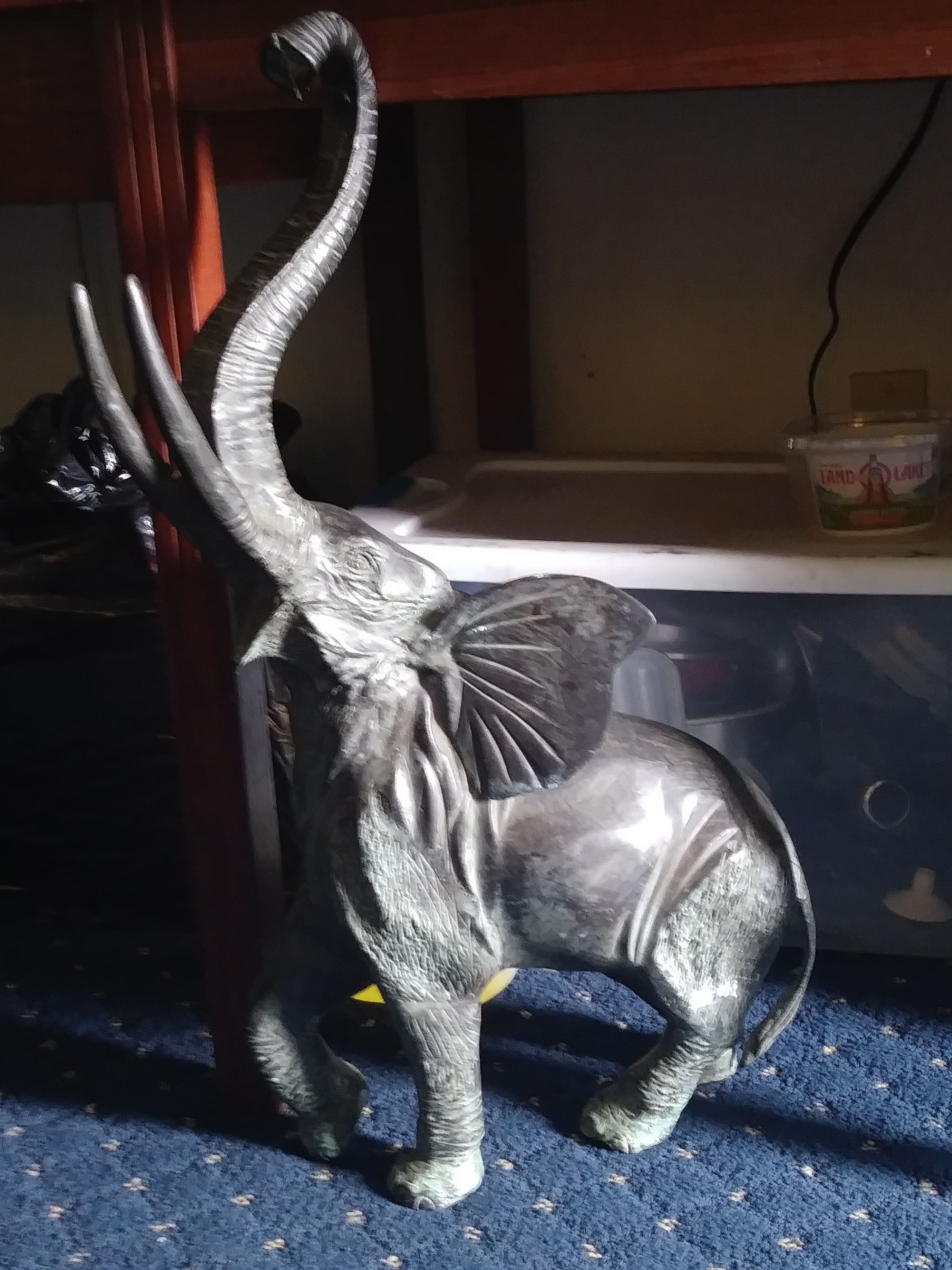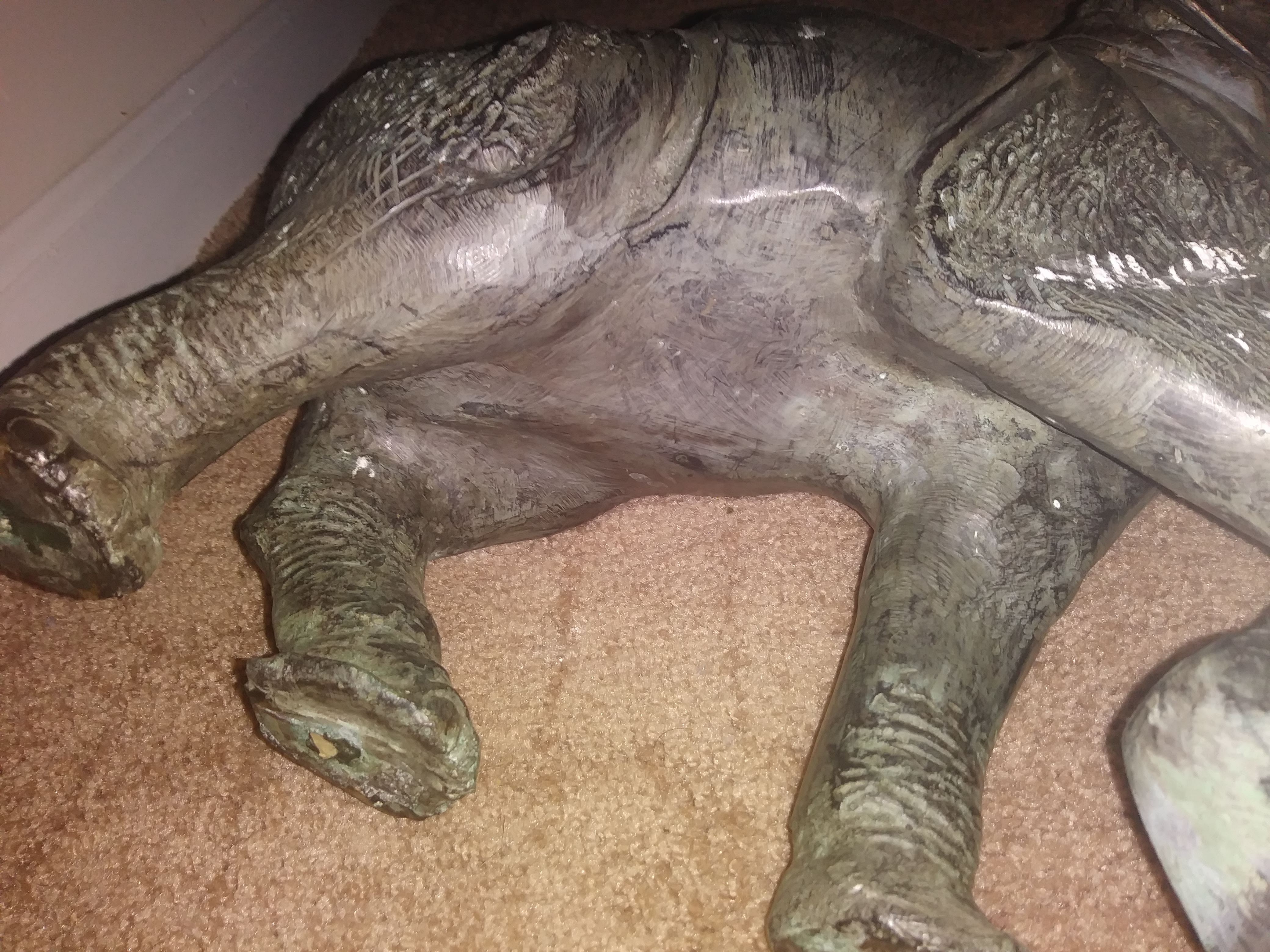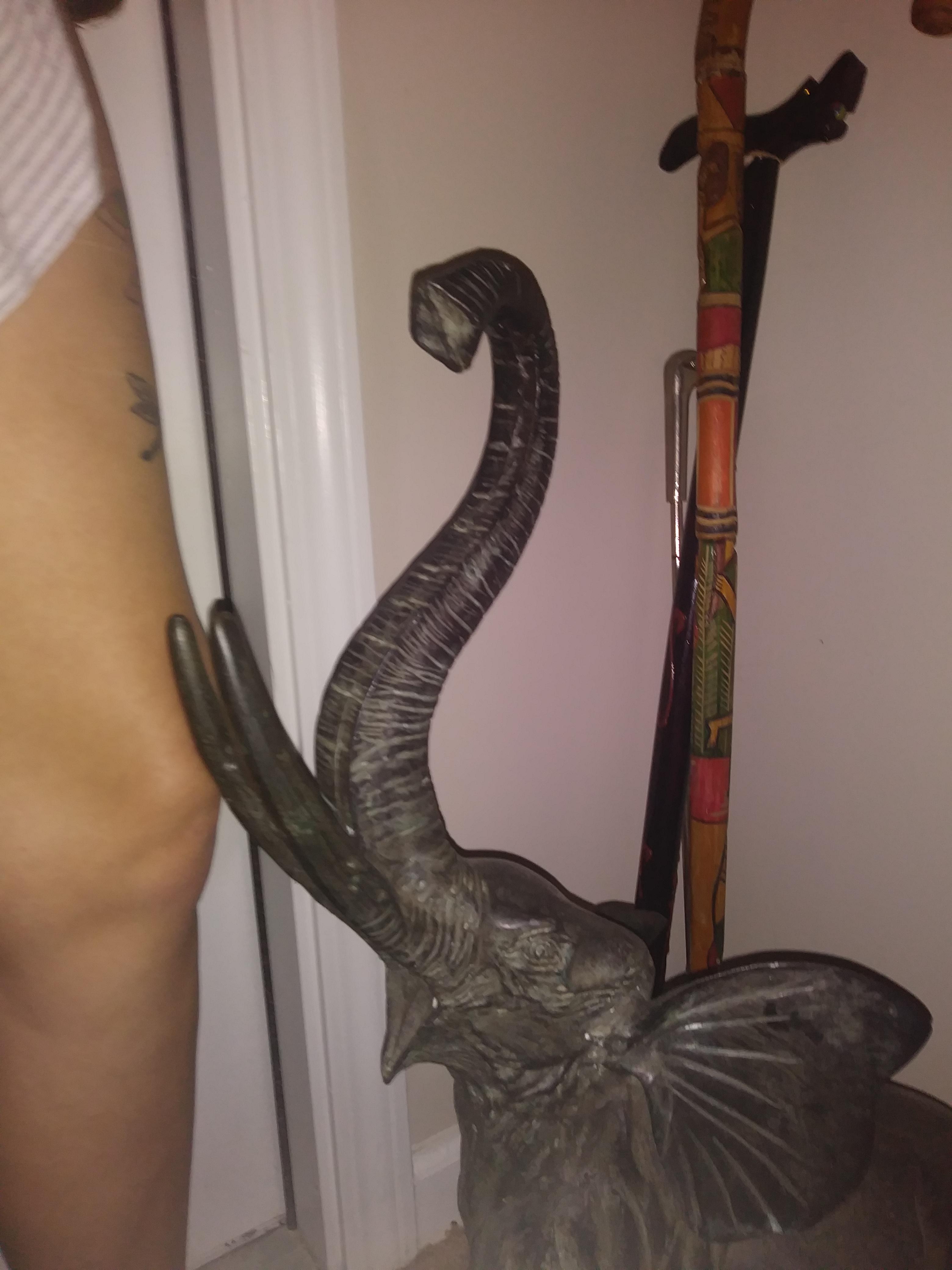I was given this giant elephant for prosperity and good health by a indian woman I met. It's about 3 ft tall, 18 inches long. Weights around 50 lbs. Has green wax you can see in bottom of elephants feet. Dont know where to look for markings. Dont know much more about it.