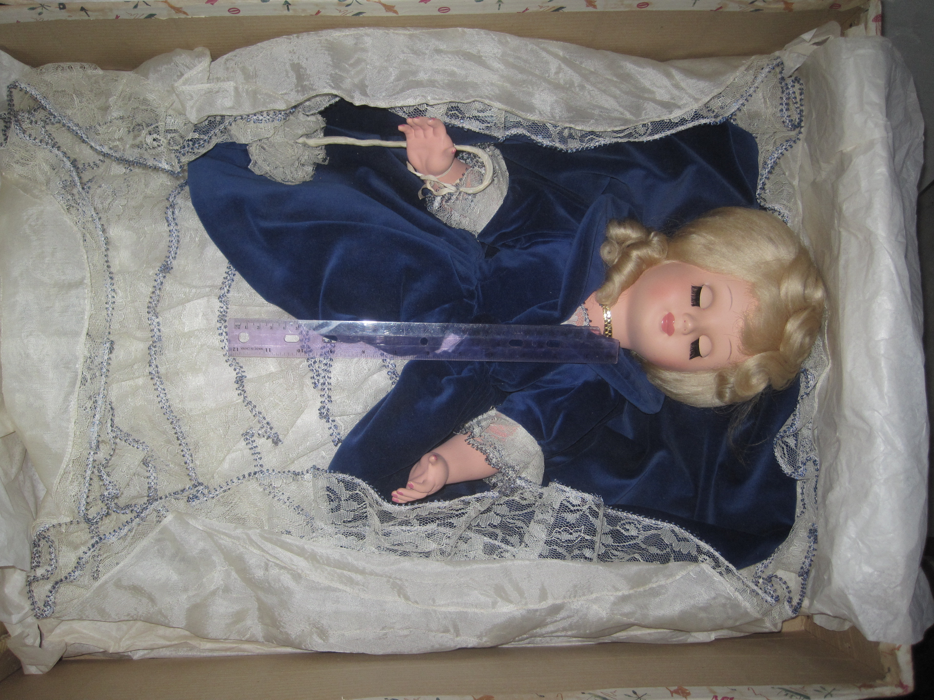 The doll is almost 3ft tall (that's a purple 1ft ruler in the photos). The head is ceramic, not sure what the arms and rest are made of. The eyes open and close as the dolls stands up and lies down. It's beautifully clothed in a blue and white dress. The blue is velvet or something similar, and the white is some lacey material. There appears to be a shepards crook or possibly a cane, so it maybe it's supposed to be a Bo-Peep doll.