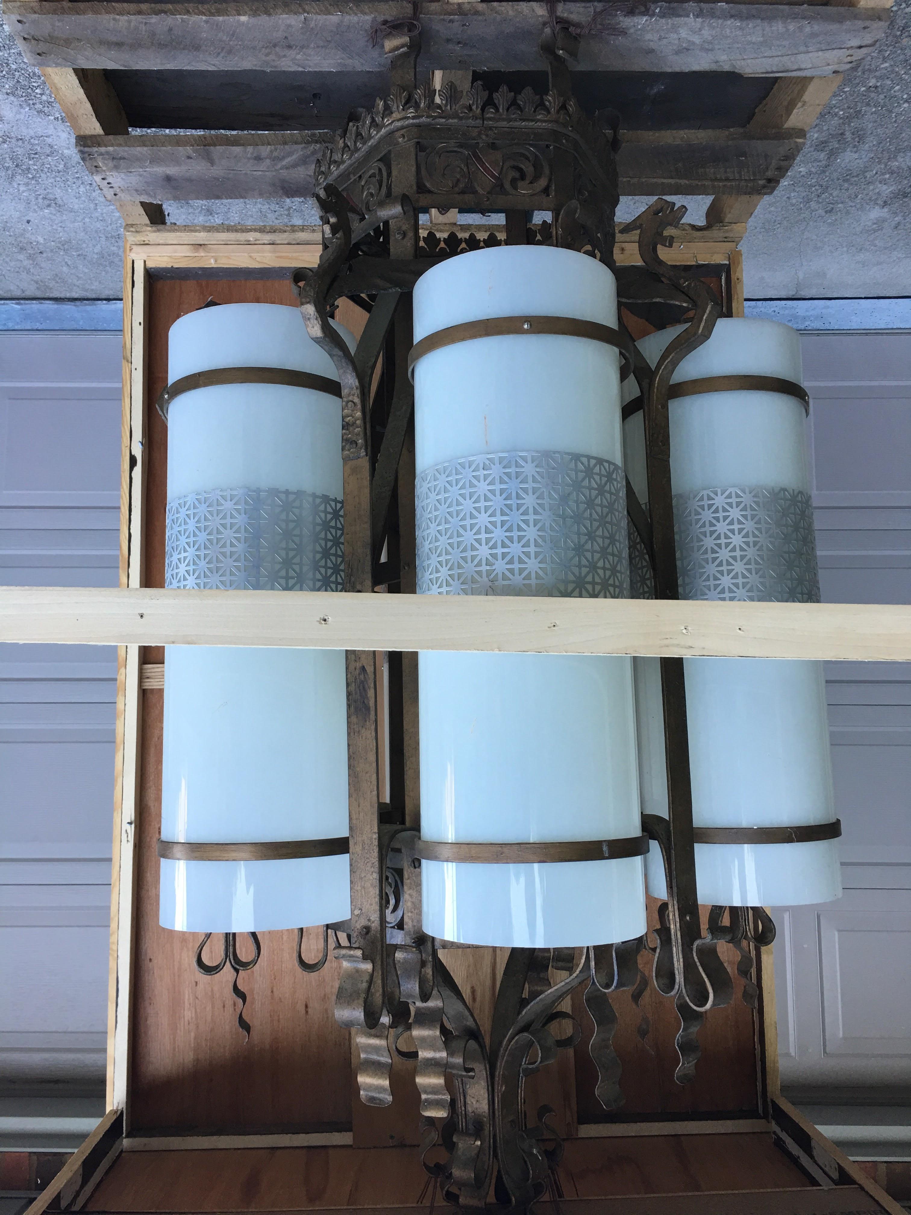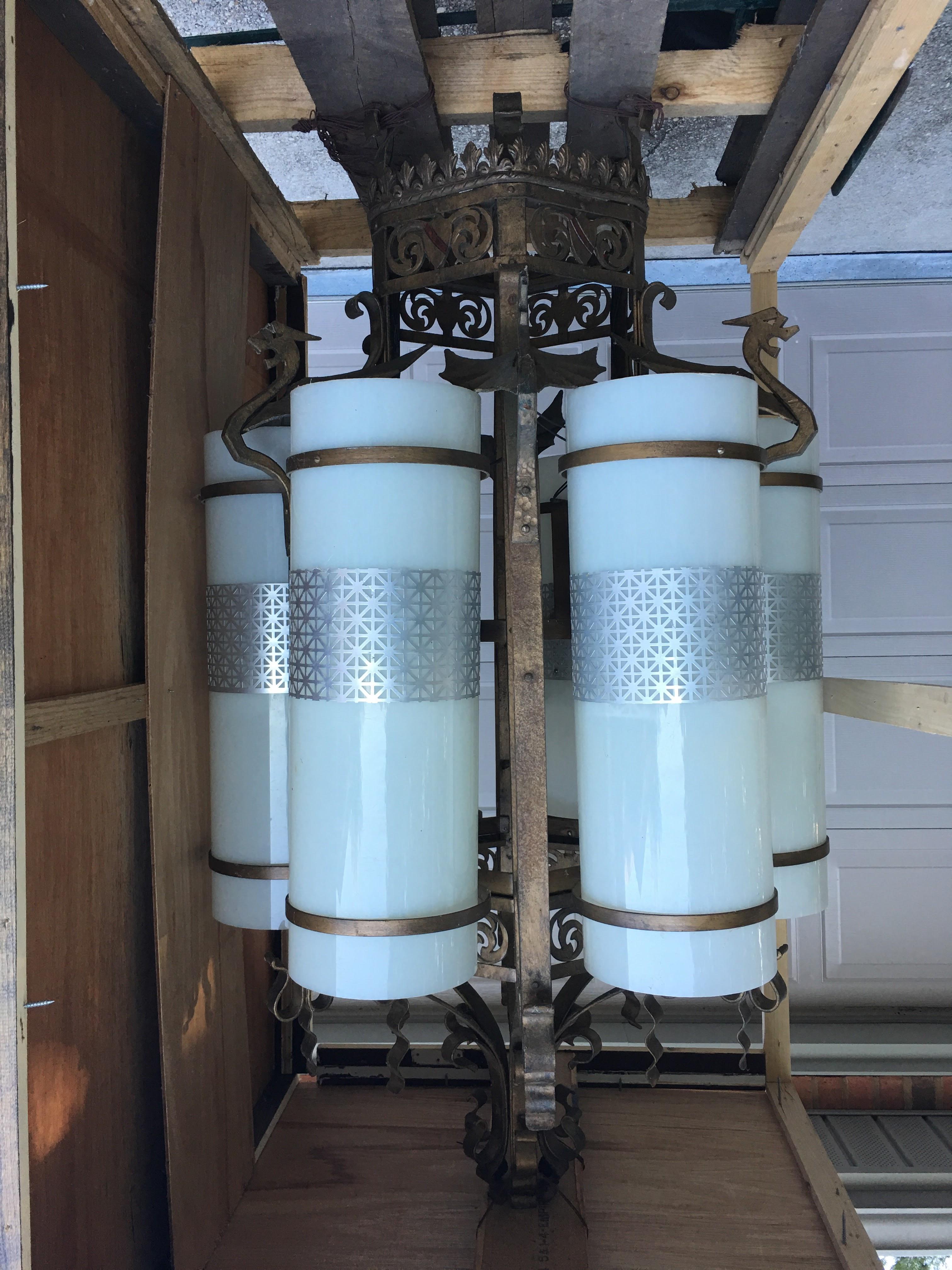 The Chandelier is 54" tall by 28" wide with 6 lights. It has Dragons and Crests on the top and there are Crests on the bottom,  each Crest is stamped 26350.   The metal backbone of the light is not  light tin, this is a very heavy light.   The installed bulbs are 160W, the bulb sockets are made of an older material and the wiring is all black. My understanding is this light was a gift to a new 22000 sq ft business, many, many years ago and the light has been stored in the crate until now.