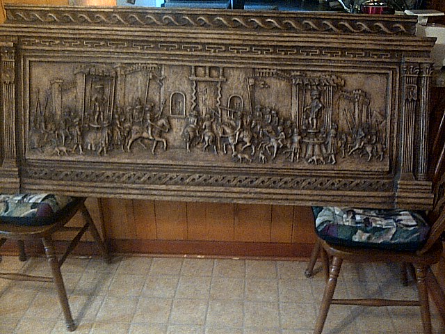Large, fiberglass wall hanging with the artist name, Espada with 2 triangles under the signature, is part of the mold on this intricately detailed hanging. It measures 67 inches by 28 inches. The hanging has a metal frame on the back that the mold was attached to. The lady I bought it from said it had been hanging in her fathers office for over 30 years and she had it for another 15 or so years.