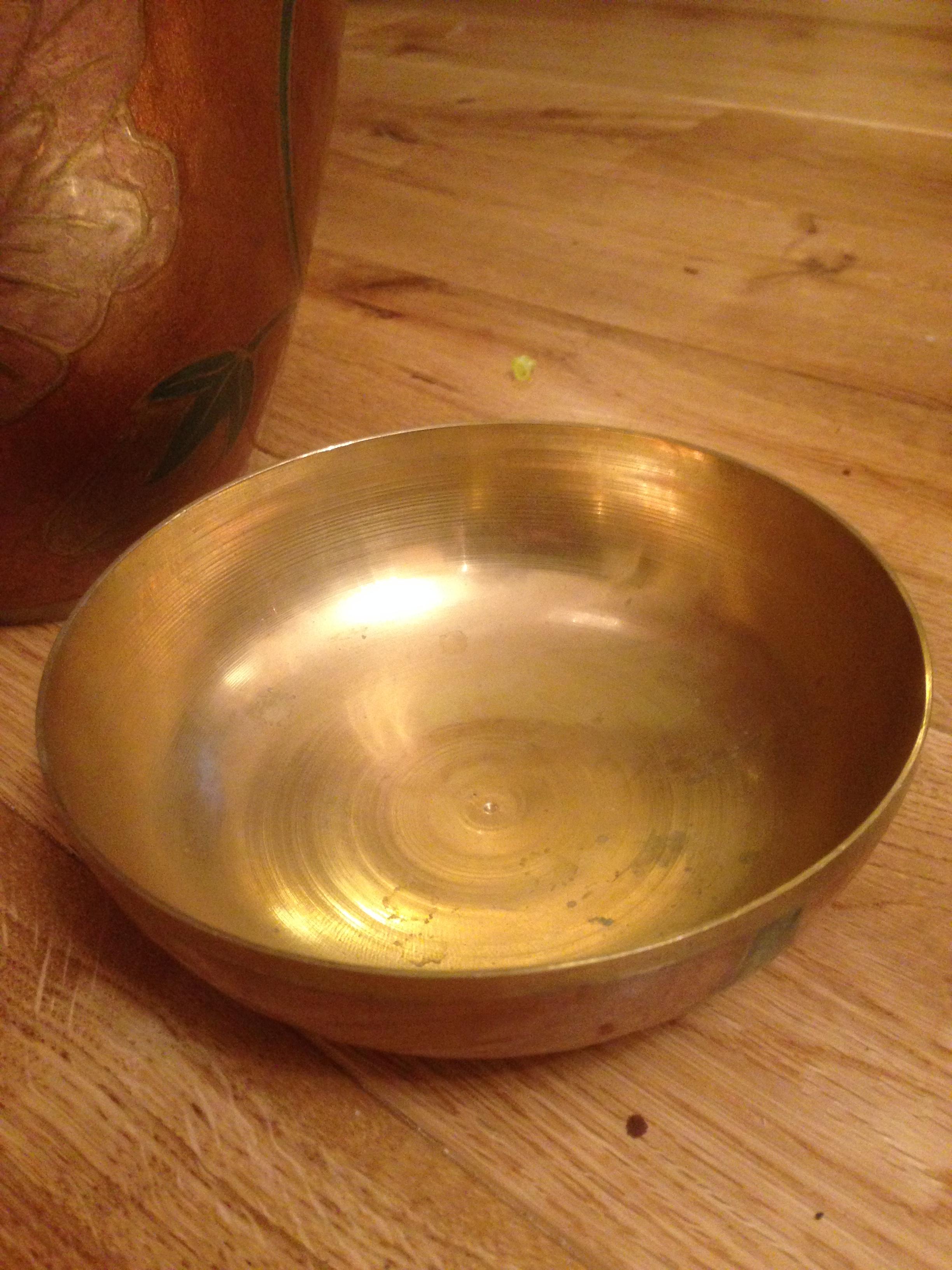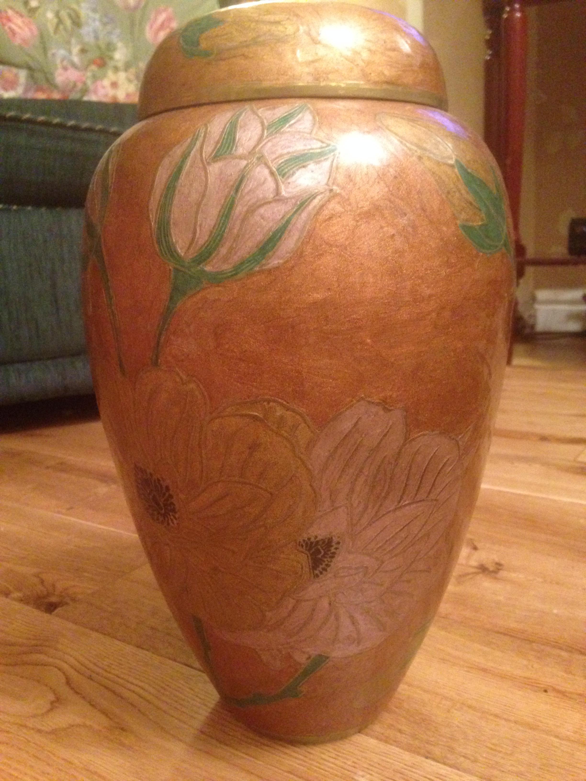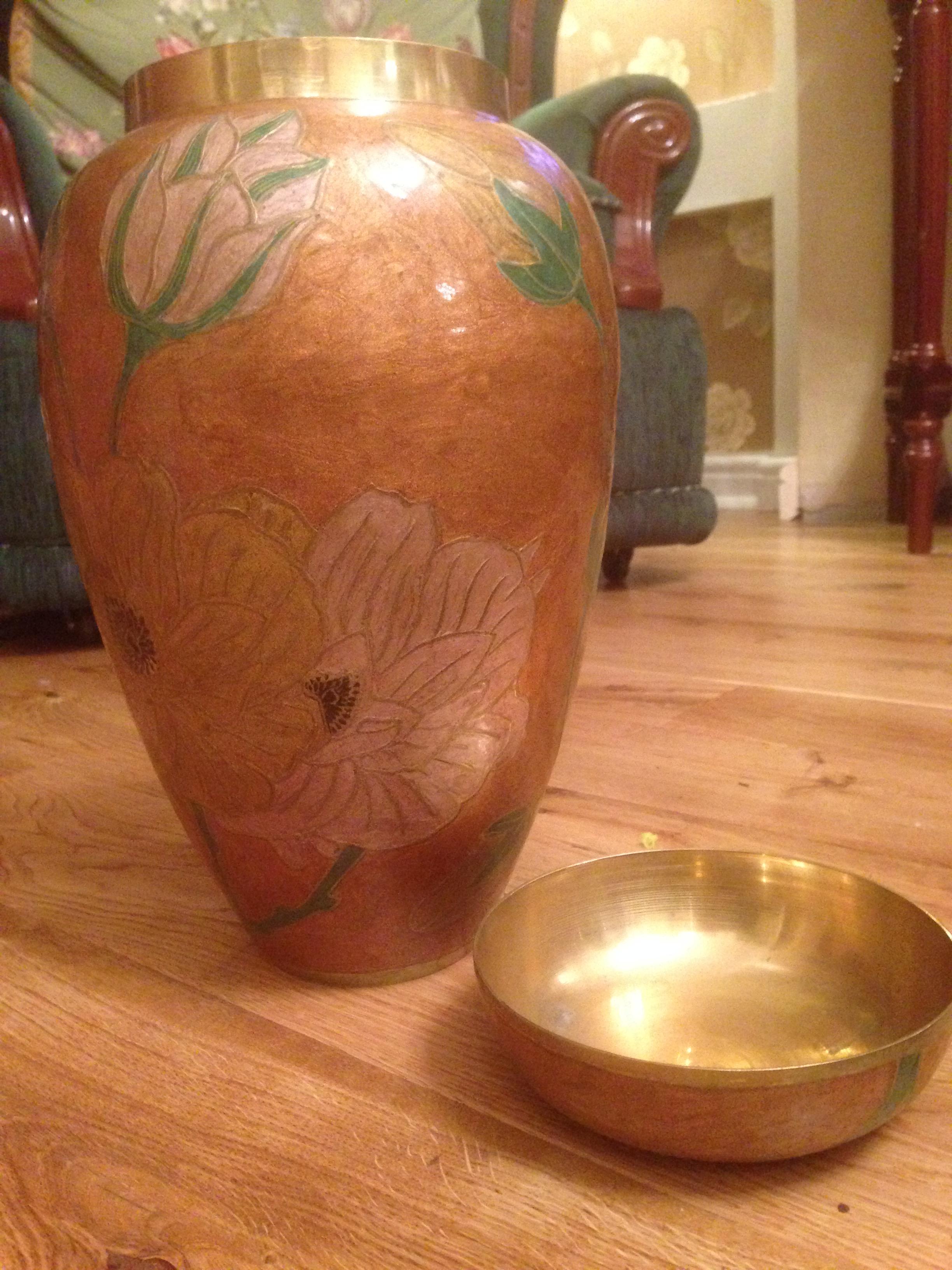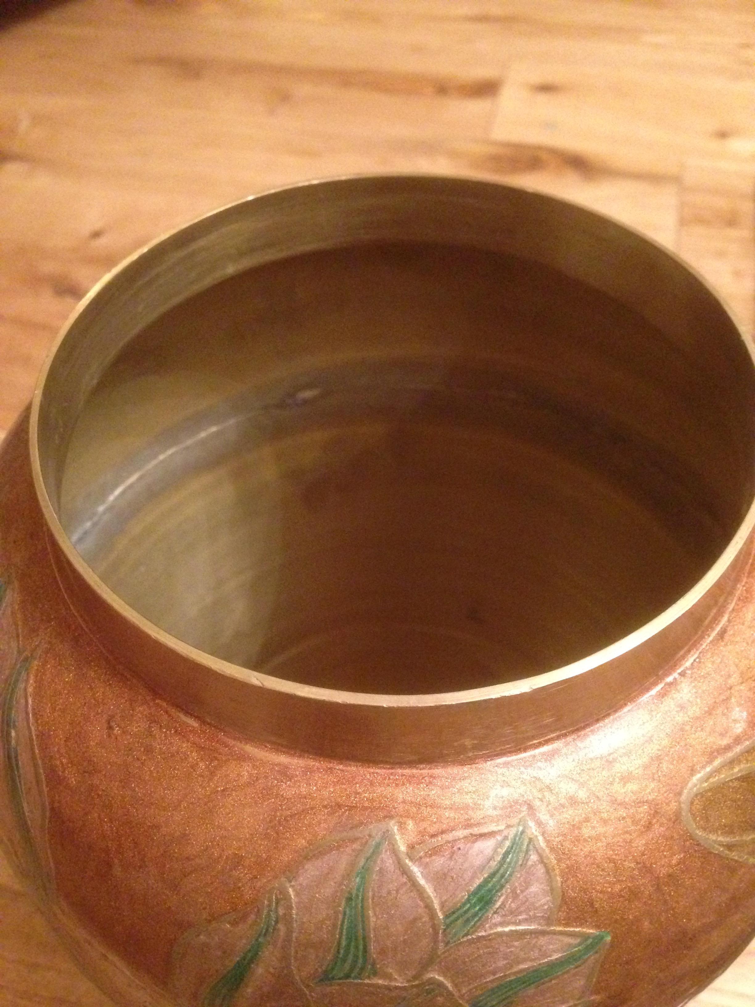Large heavy brass enamelled ginger jar/urn approximately 13" tall including lid. Approximately 8" maximum diameter, 3.5" diameter at the base.