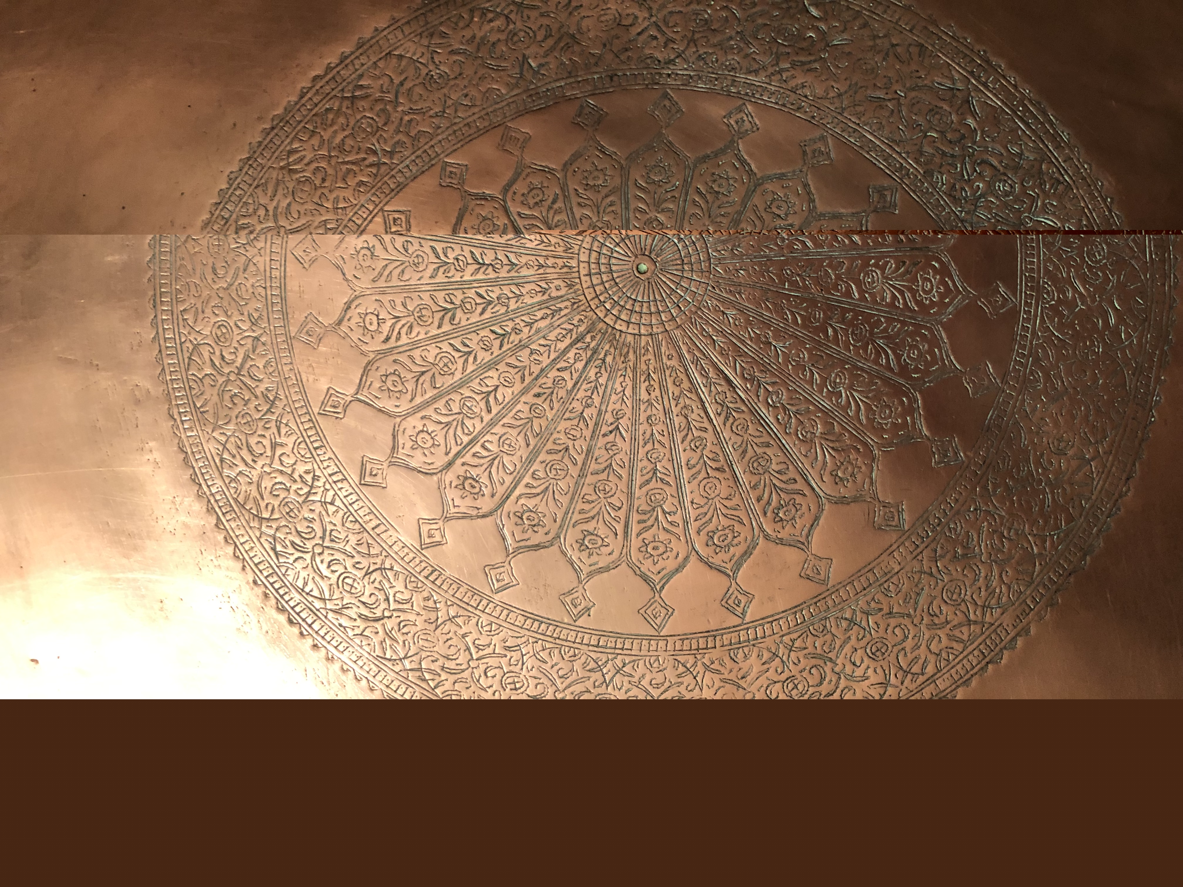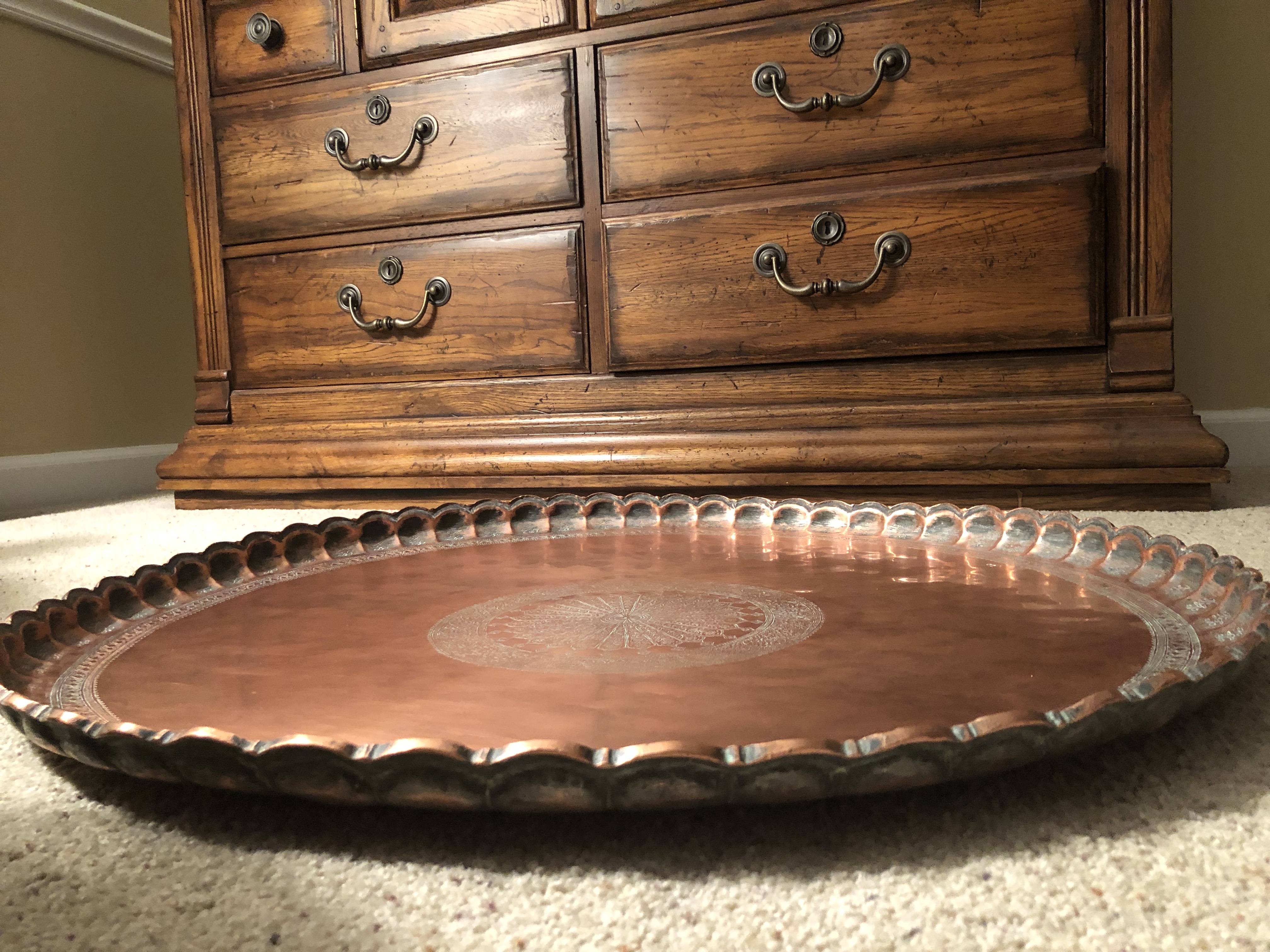 This tray is 29” in diameter and 16.5 lbs. It was shipped from Iran to the U.S. by my aunt approx. 70 years ago.