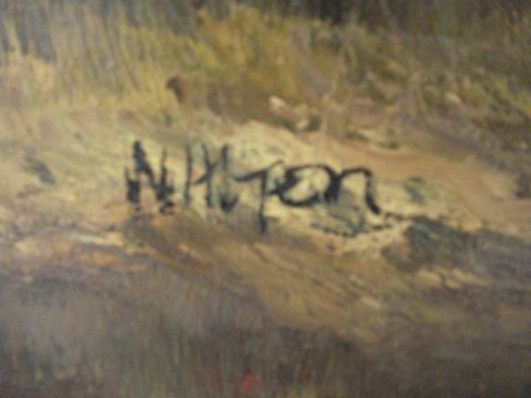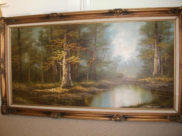 Attractive framed oil painting depicting a pond in a forest, measures 24 inches x 48 (without frame). I don't know much about the painting, It is signed by the artist and looks like 'W. Hiten'