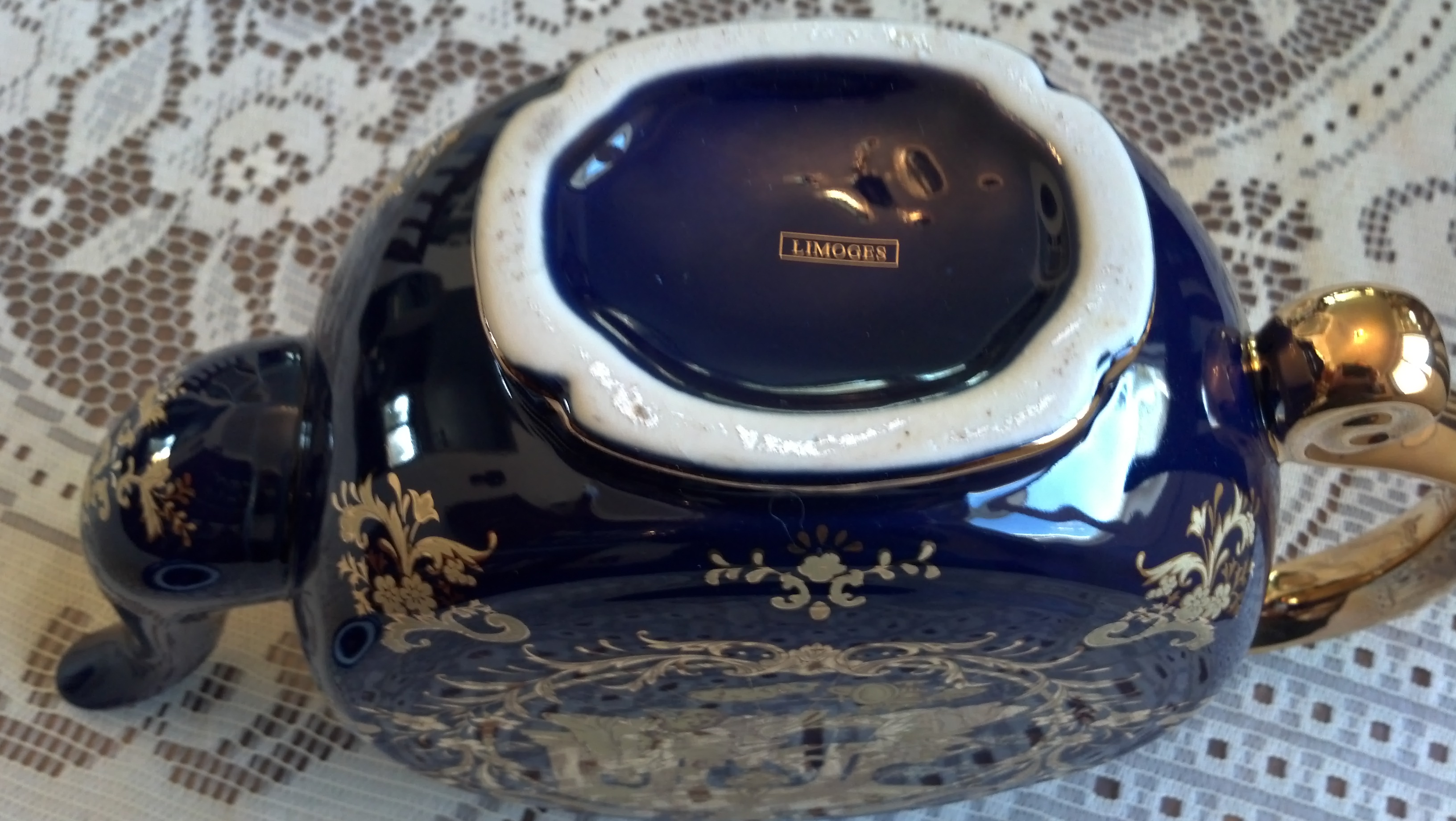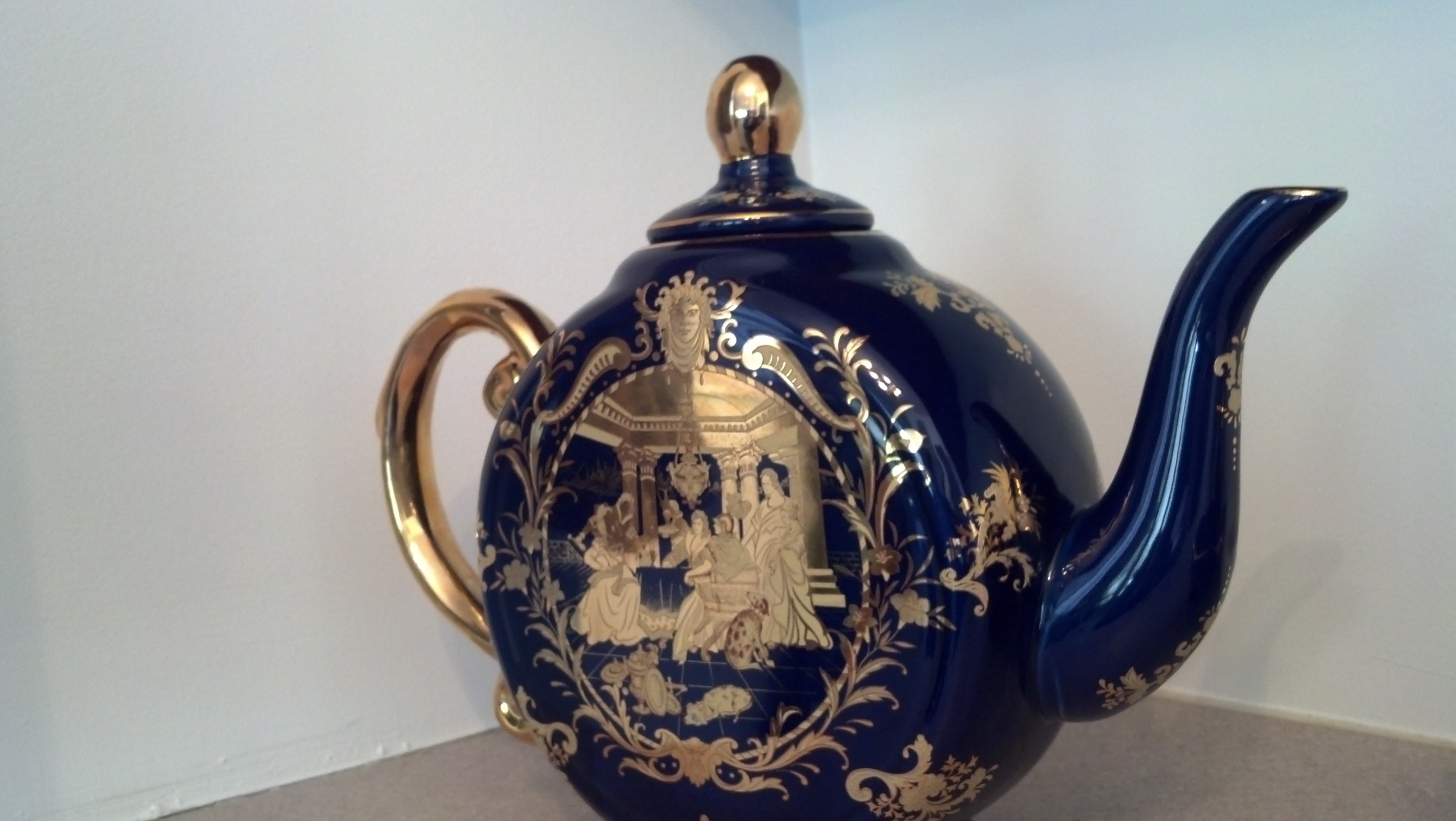 The teapot is approximately 10 inches high and 12 inches wide from handle to spout.