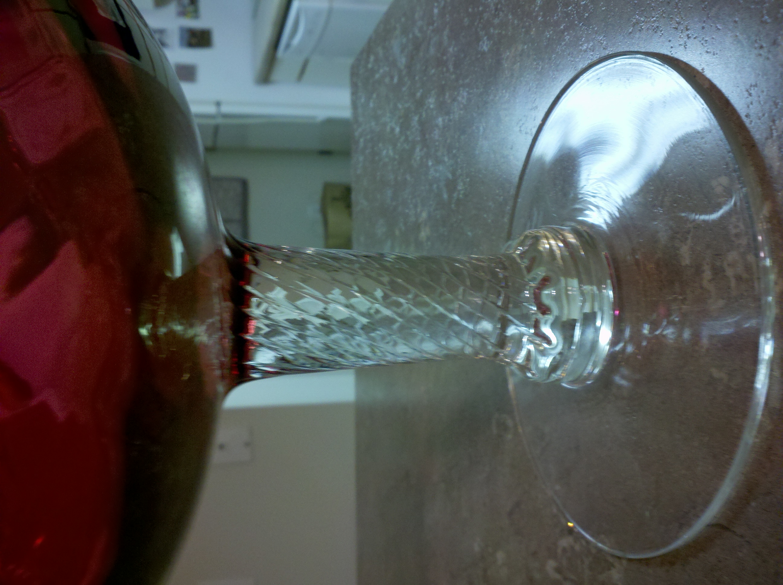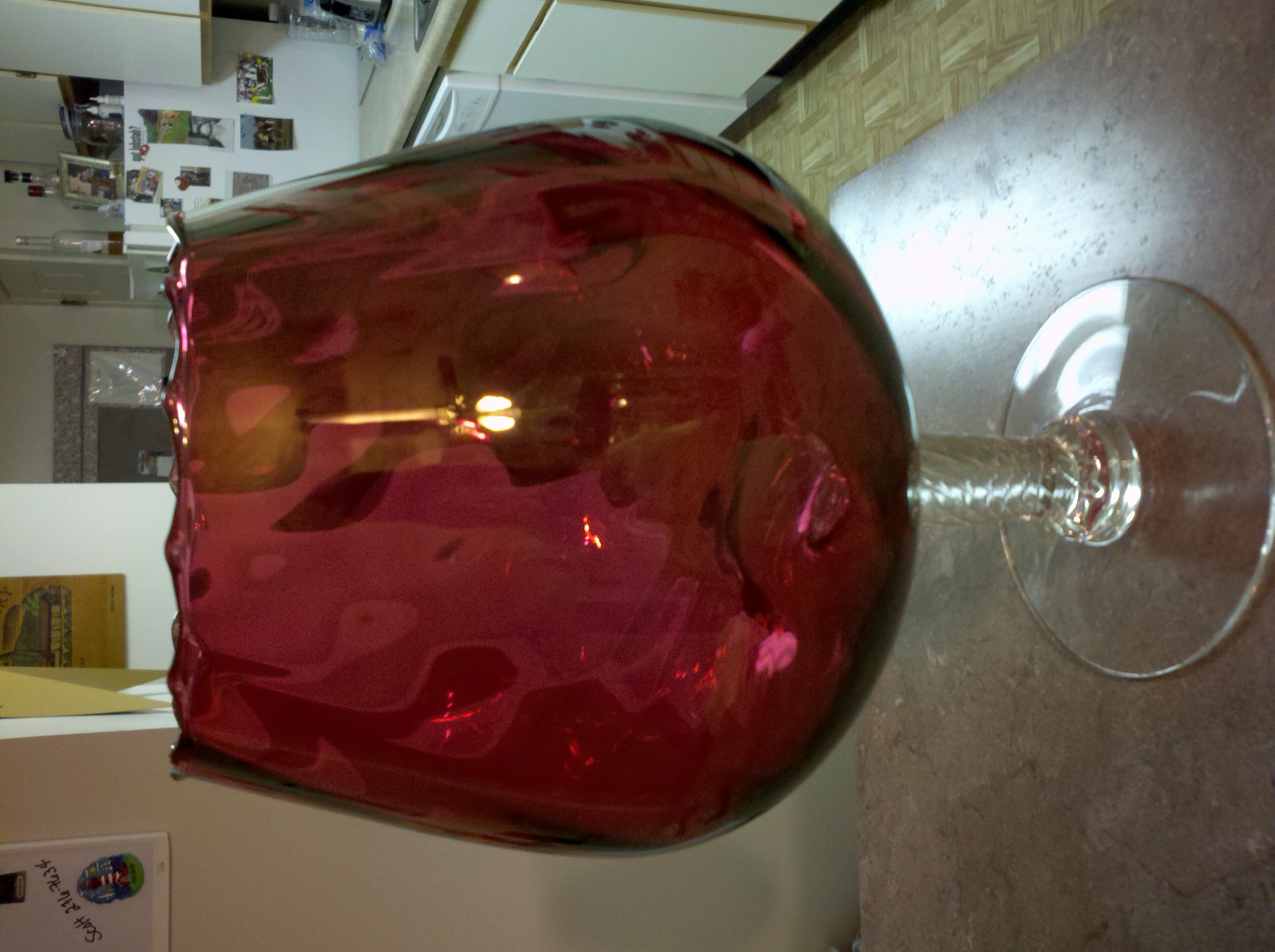 top is a beautiful red with a fluted edge, base is clear glass, stem is twisted clear glass