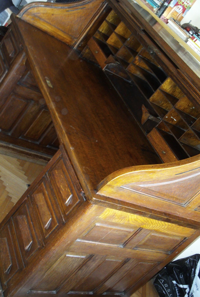 I believe it is oak, I haven't seen any stamps or marks anywhere. It is relatively large, so I would be curious how it got to where it is now.  In good condition, except for a couple of glass stains.