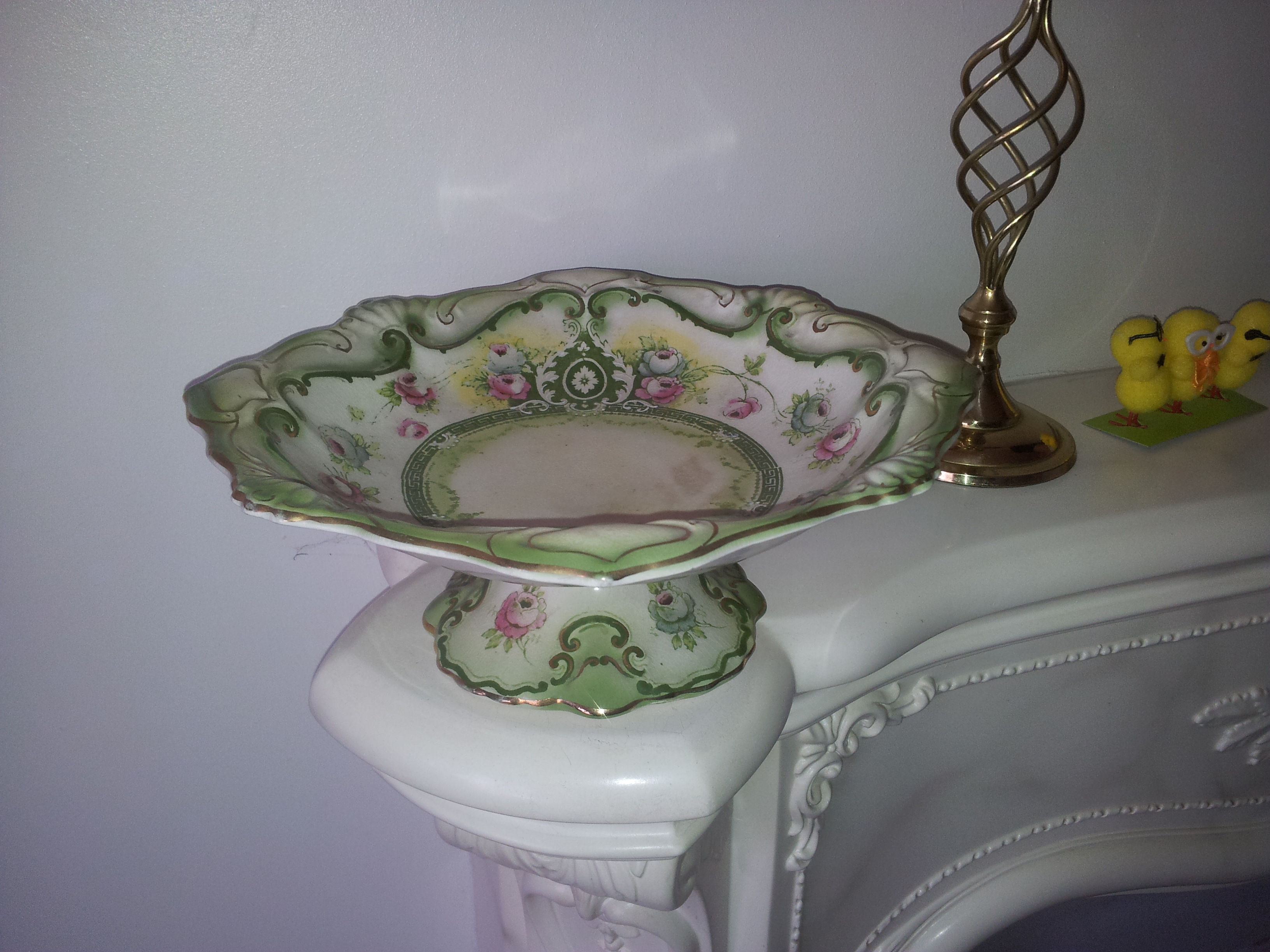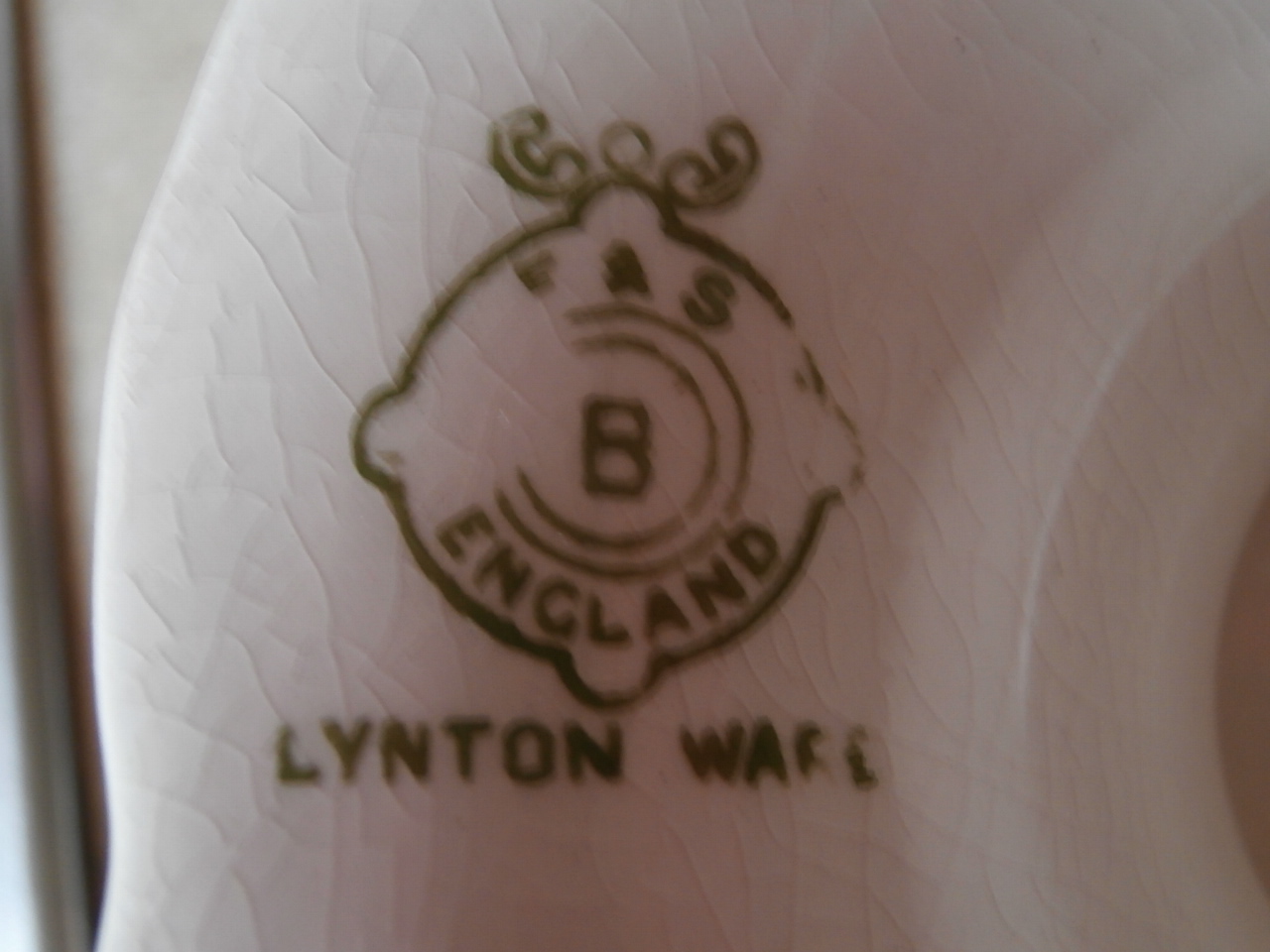 This little set I have consists of six Large dinner plates , two footed serving dishes / bowls and two larger ones . They have an embossed design with feather / leaf edging , and hand painted floral design . The makers mark I think is F & S with a B in the middle of the mark , which I think could be for Burslem , they also have the number 300 in red on each item . They look very old and the plates and bowls have discolouration on the inside and also some crazing .