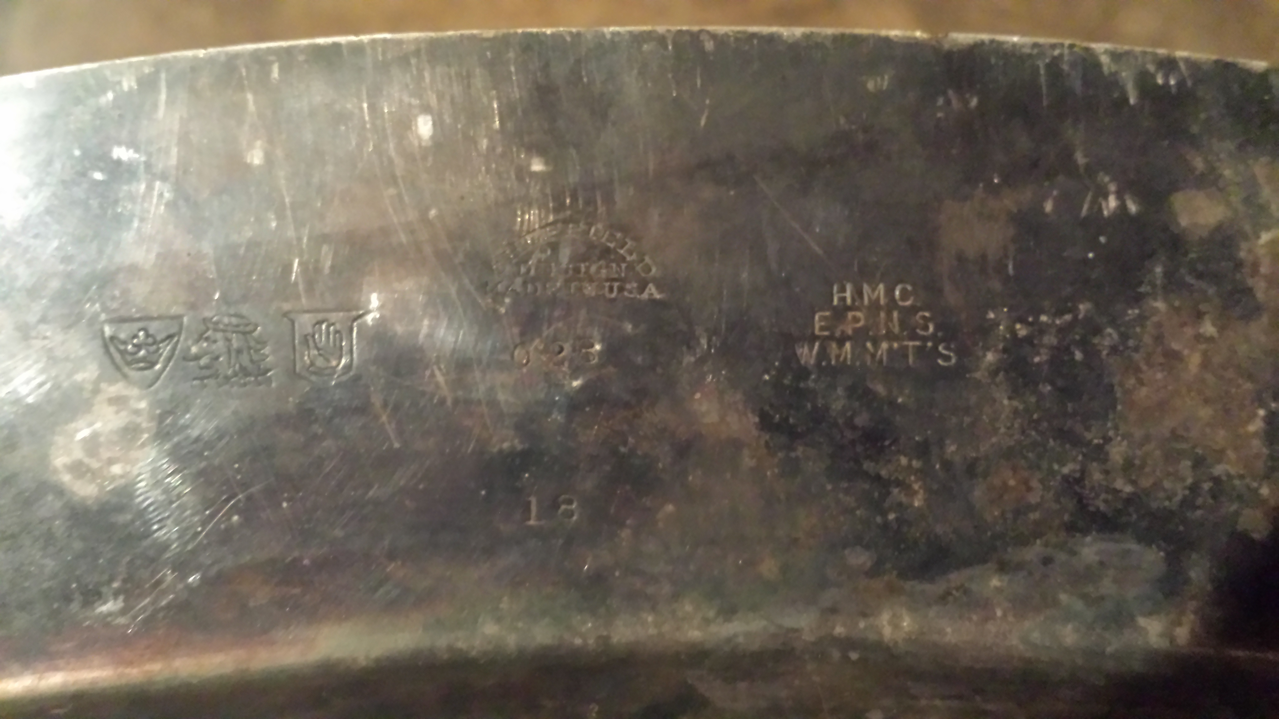 ONLY LOOKING FOR INFORMATION AND AVERAGE PRICE. It has old english letters in the middle of what looks like a large silver tea plater set. Flip it over it has 3 insignias one looks like a kings hat inside a shield shape, the next is what looks like a crudely drawn face of a jester and a hand with the sign language for stop inside a tower shield shape. Next to the ensignia's says sheffield in an arch and inside the arch says design under that says made in the U.S.A. under that about 0.3 cm says 028 and 1cm down says 18 or I8. To the right of that shows entails for Homan Machining Company H.M.C. under that says E.P.N.S. and under that it has entails for White Mountain Metal's W.M.MT's. I would love to know more about this plater and I found most of the information, I just don't understand the 3 ensignia's, the numbers 028 and 18 or I8 and the last thing is the old english letters on top, I don't understand who or what it is and I don't know what the letters are W E or M F or if I'm wrong? Would you be able to provide me with a page about this plater or any information about it and if I were to consider selling this what price range would I be looking at if I were to sell this item? Feel free to email me at [email protected], I currently don't have an active phone. Anything you can provide me I would appreciate it.