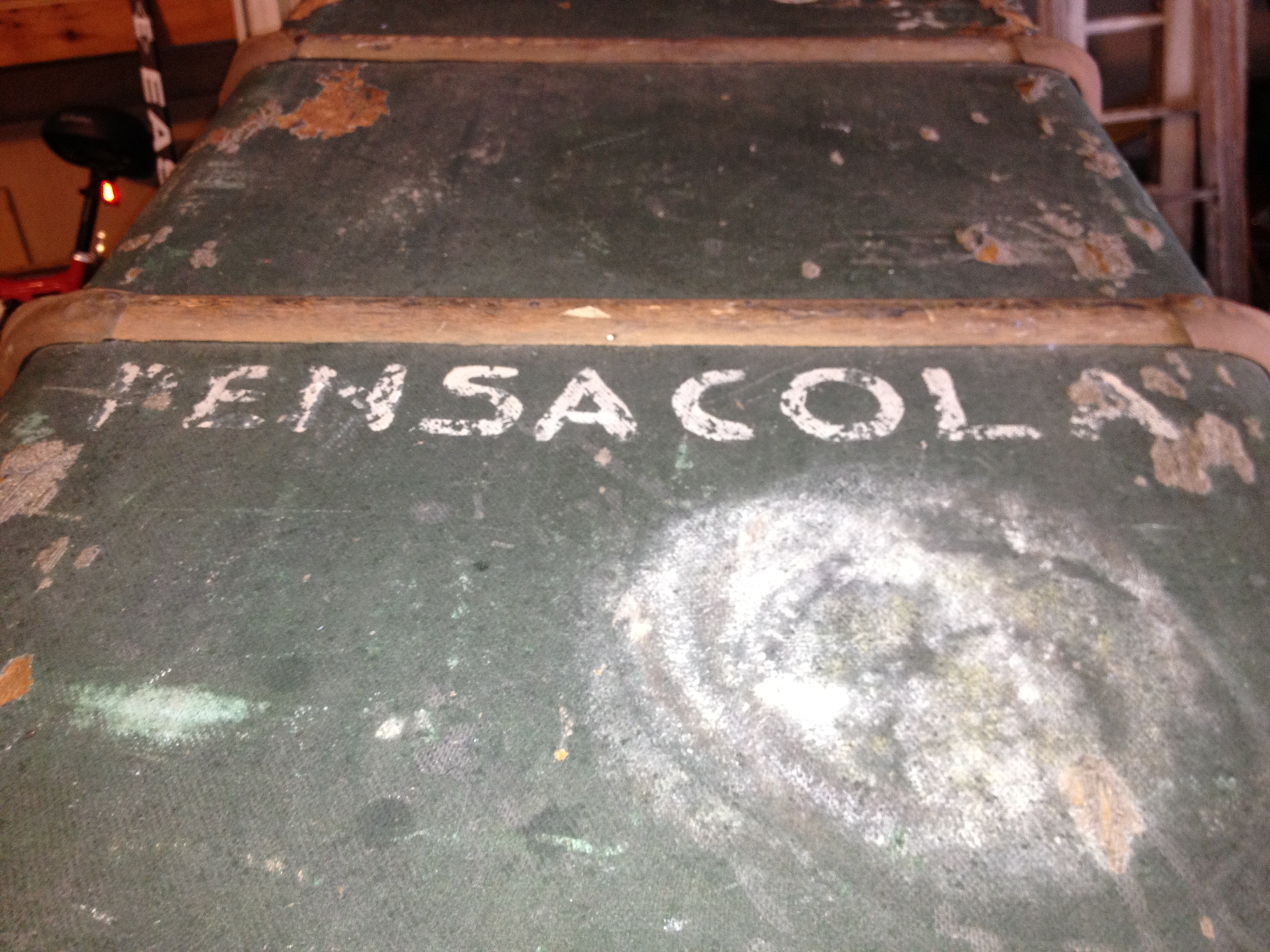 This is a large green trunk. I purchased it from a guy who was a collector he had alot of nice stuff. This trunk has two shipping labels on it where it looks like it traveled from pensacola florida to genova itally. The handles and closure locks are broken but it still has a sturdy structure. There is no rot as far as i can tell. it still has the orignal upper tray although the elastic is wore out as you would expect on a piece this old.