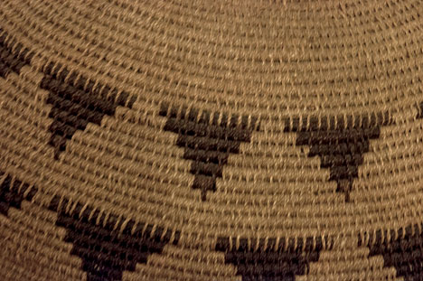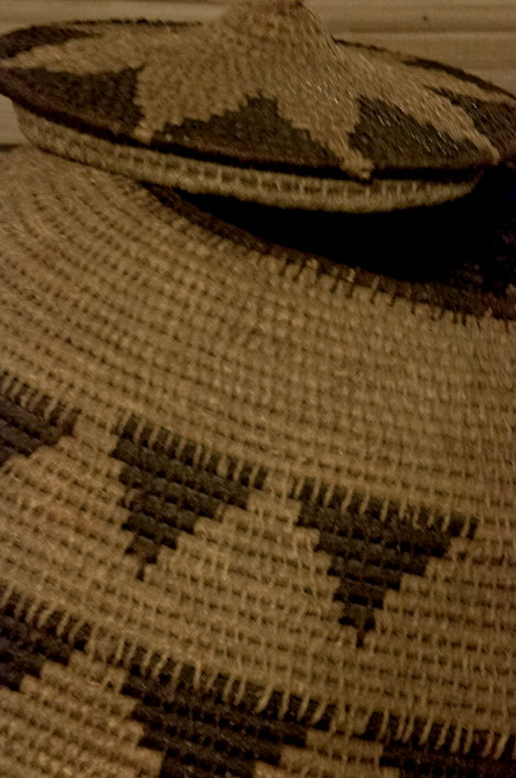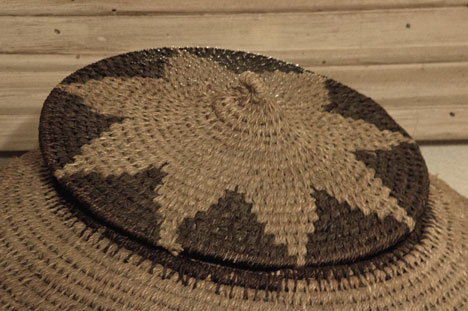 Large Vintage or Antique Coil Basket with lid. Lid has Star design on it with 8 Points. The basket has several Dark Triangles upsidown mirrored. Snake Diamond Design? I believe it was purchased California in the 1970's.