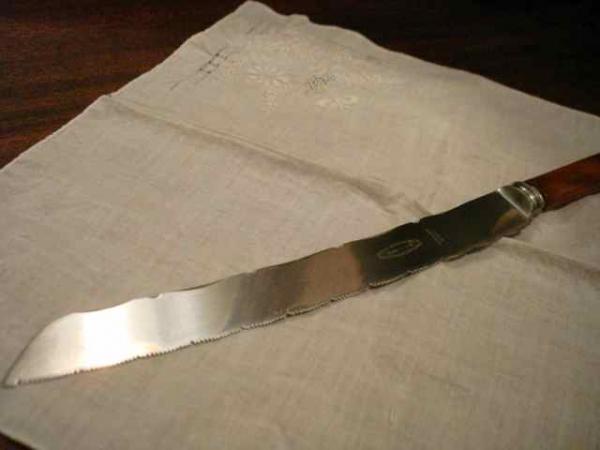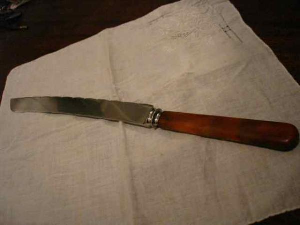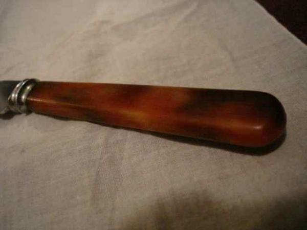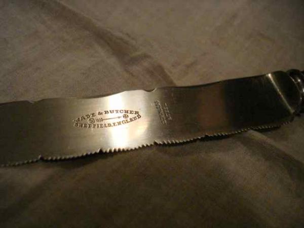 I don't really know anything useful about this knife, except that I picked it up and found it very beautiful. I'm curious about the history of the knife itself, as well as the company (read a bit about it online), as well as the knife's time period. I thought it was bone handle, but I'm starting to suspect that it might be an early plastic, like Bakelite? I haven't found any mention of Wade and Butcher making a knife like this, though - I know they made carving knives, but this knife looks like a particularly ornate, gorgeous bread-slicing implement, or else something specialized that I don't recognize. Any help would be great.
