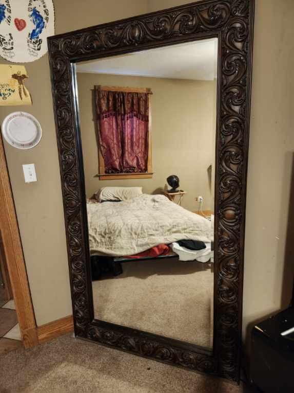 Approx 7ft by 3ft. Beveled mirror. With wooden carved frame. Label on back says made in china, 2002.