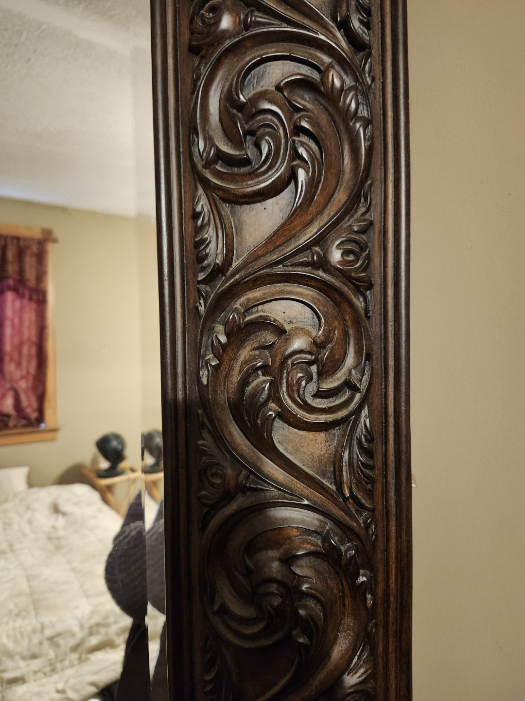 Mirrors of this size, style, and quality typically sell in the range of $200 to $500 on the resale market, depending on your location and demand. The carved frame and beveled glass are attractive features, but the "Made in China" label and relatively recent manufacturing date place it in the mid-range of value for decorative mirrors.