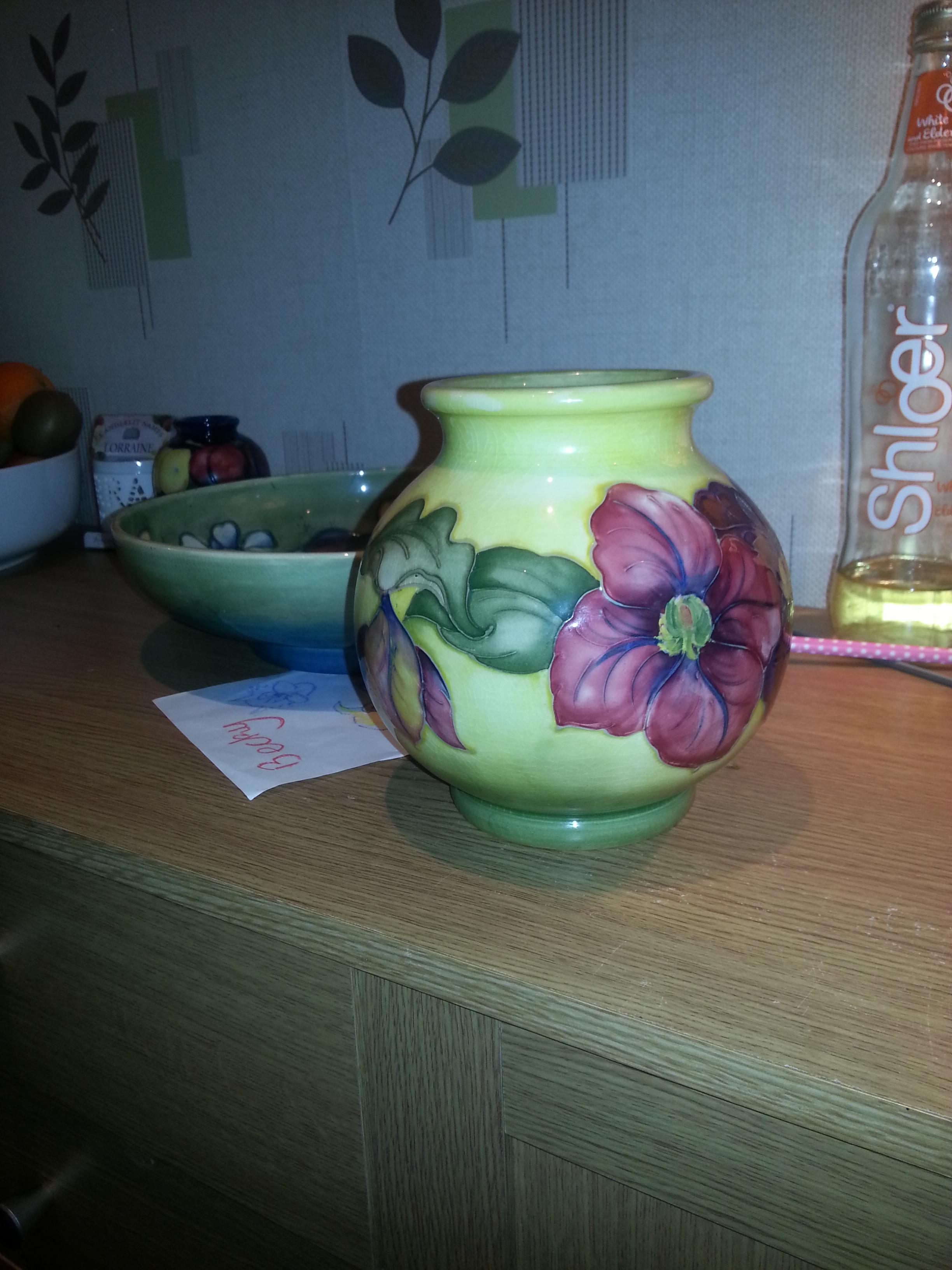 "The beautiful "Clematis" pattern was originally drawn by William Moorcroft in 1936. Unfortunately William died before the pattern was ever put into production. His son Walter Moorcroft first produced the Clematis pattern in 1946 & production continued until 1975."