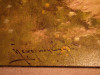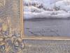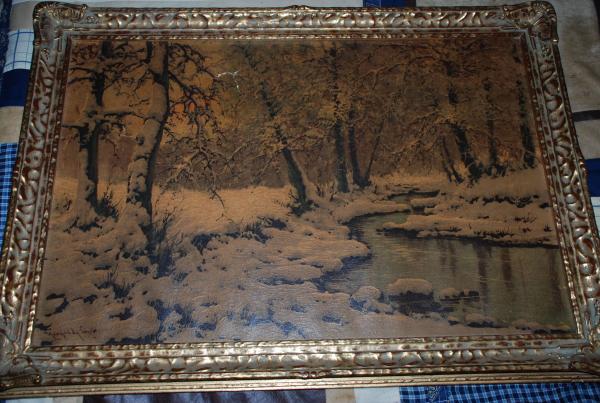 The Psinting is of a snowy forest with a small brock. There are tree clumps of Trees one is a group of four trees on the right, three trees in the middle and two trees on the left. The signiture is in the lower left corner.