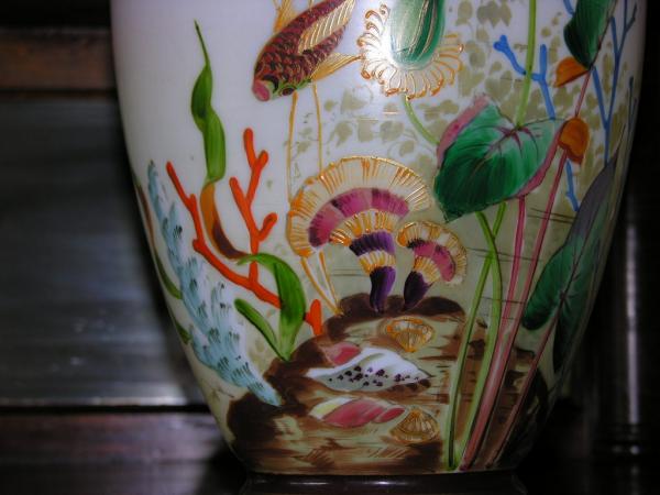 Beautiful hand-painted French Limoges vase gilded on top and bottom, and along edges of designs to add depth. Brilliant blue, orange, green, yellow and coral colored fish, shells and underwater plant life on a pinkish background.