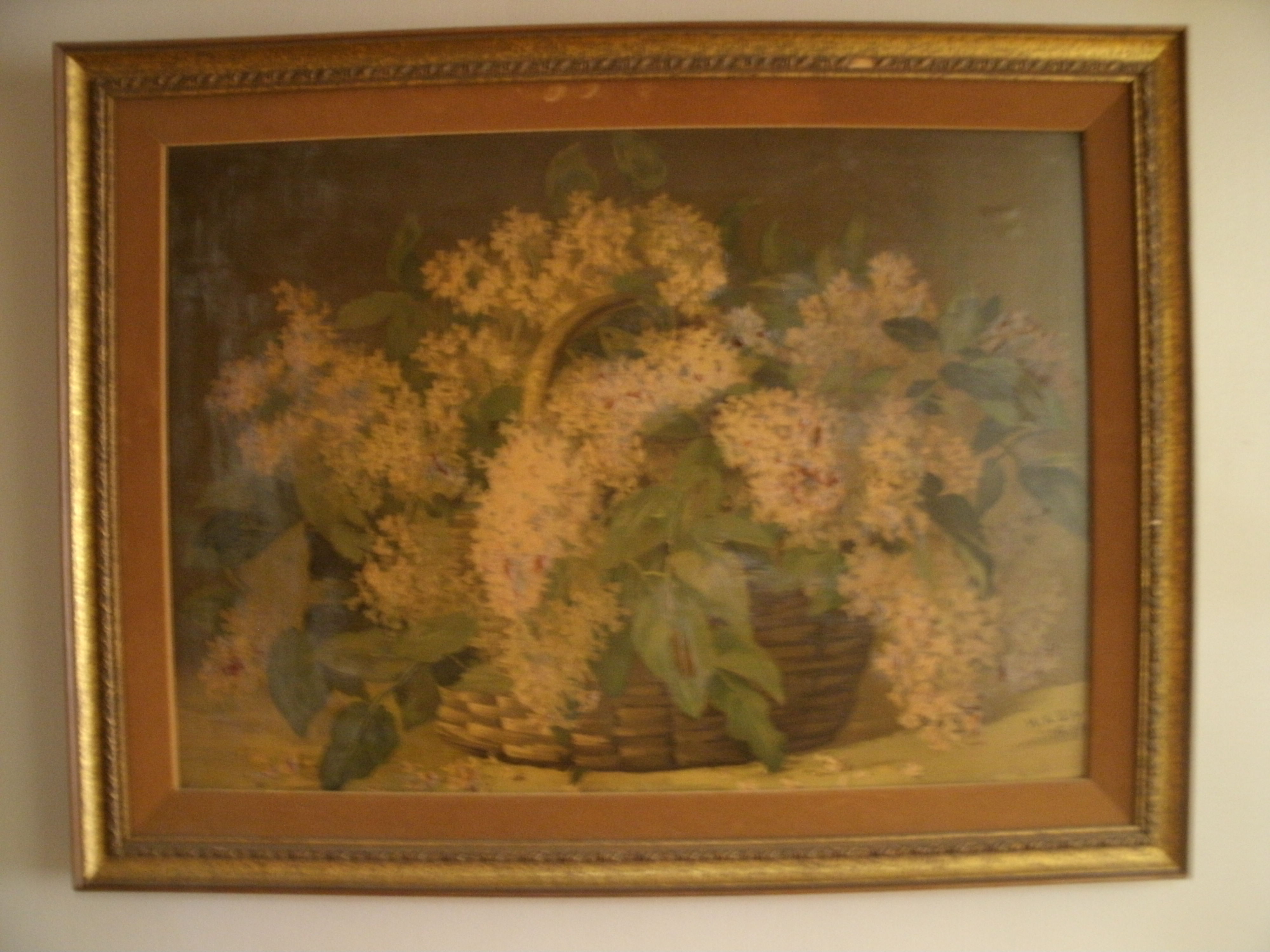 Painting of flowers in a basket signed by H.K. Ely and dated 1888. It measures approximately