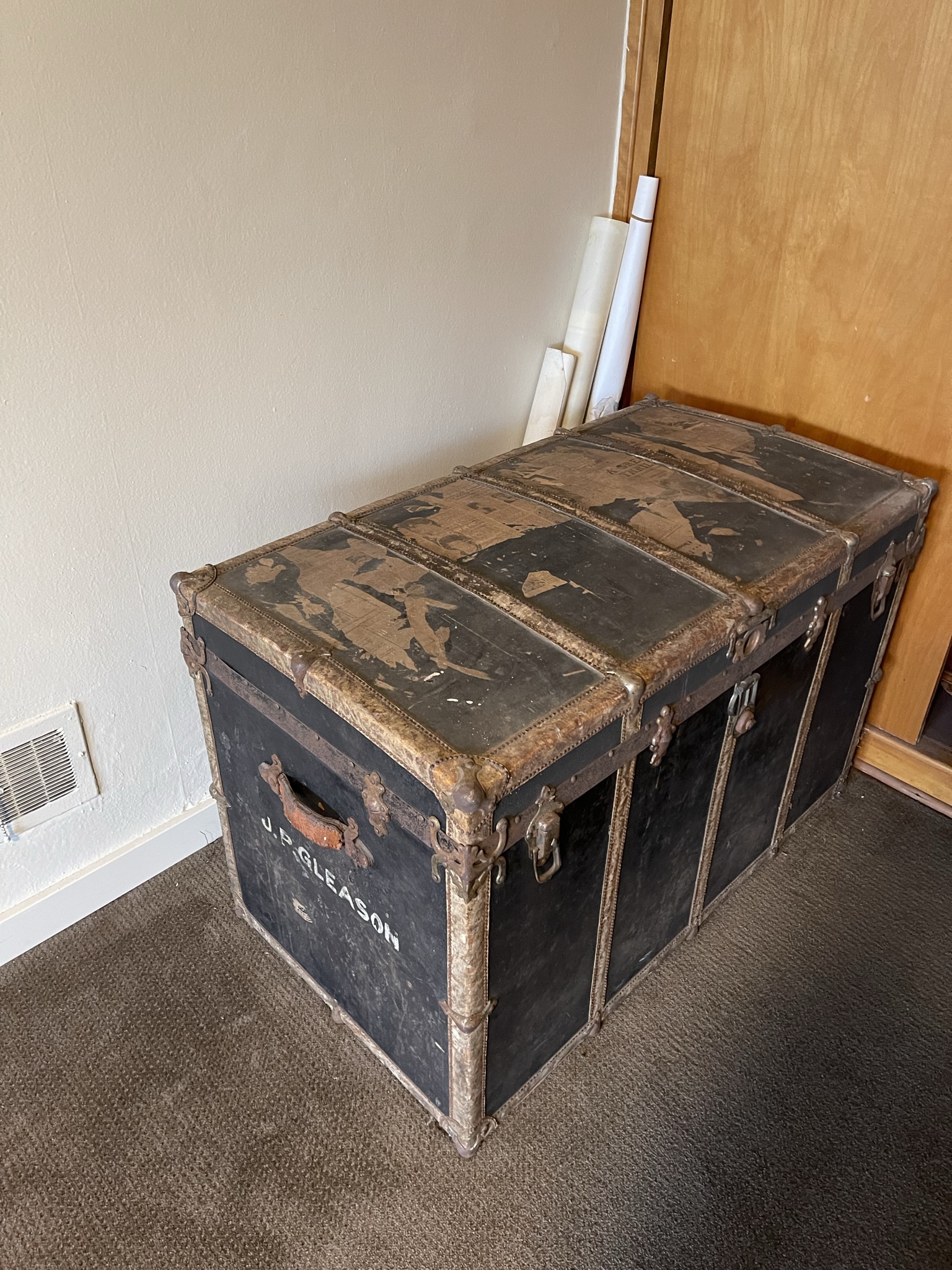 I believe this steamer trunk was used by my great uncle when he immigrated to the U.S. in the 1880's or 1890's. However, the only marking is on the lock, which is from Eagle Lock Company dated 1892. I'm not sure if this lock was attached when the trunk was made or after. The dimensions are 43" wide by 23" deep by 28" high.