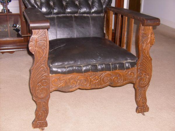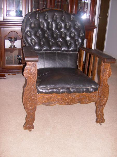 This chair belonged to my Great-great Pennsylvania Dutch Grandfather. It has been in my family for many years. I do not know much about it or the actual value of this chair. I believe it is dated back to the latter 1800's to early 1900's. I just am not sure of its age. This Chair is made of oak I believe. It has a flared cushion for your back and is adjustable to fit comfort of seating. It's seats are covered in leather which is original. The legs in the front have a side profile of a lions head and paws carved into it. If anyone has any thought to as who the manufacturer was, what years possibly, the appraisal value (if possible) or any history of this chair I would love to know.
