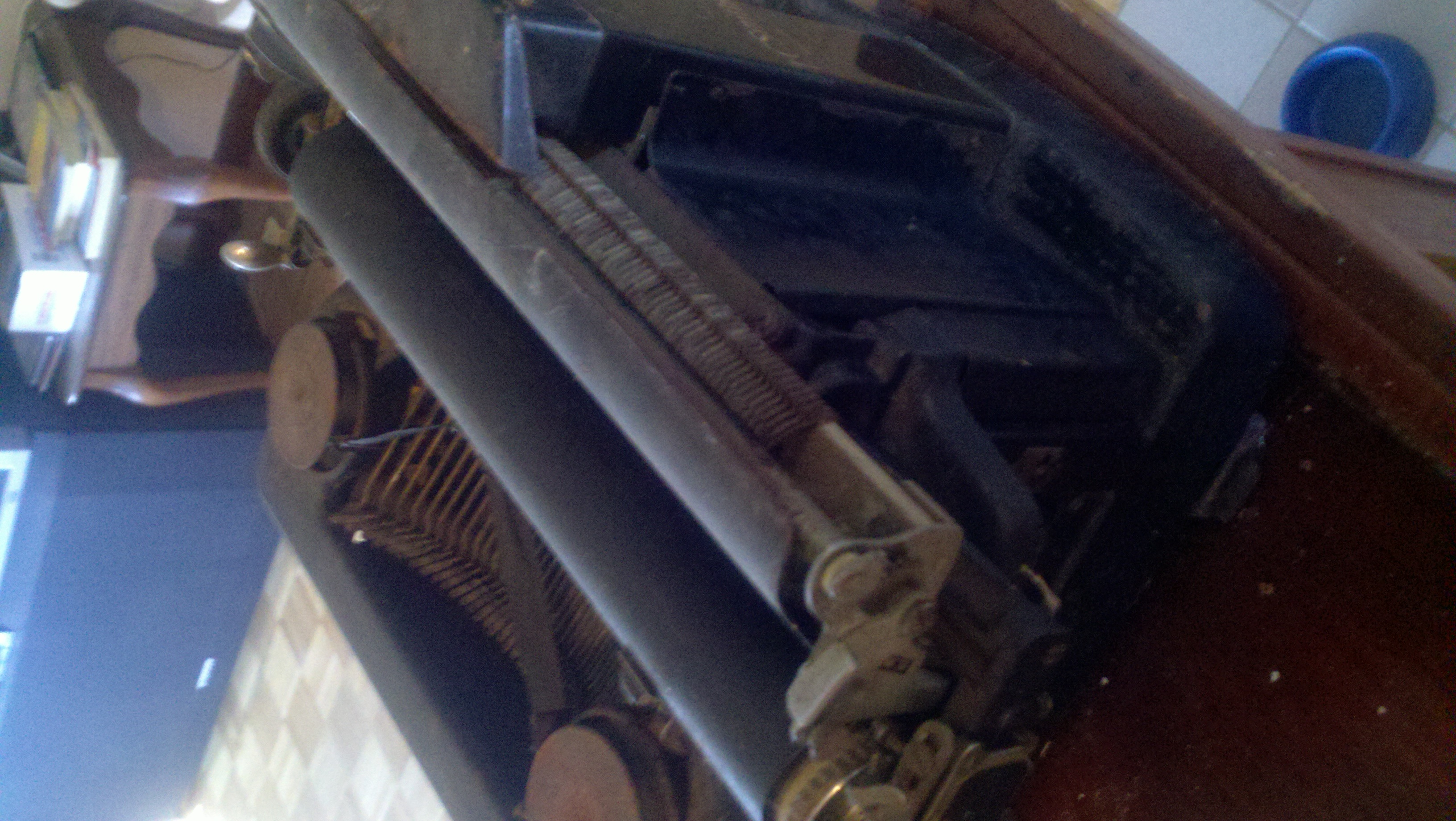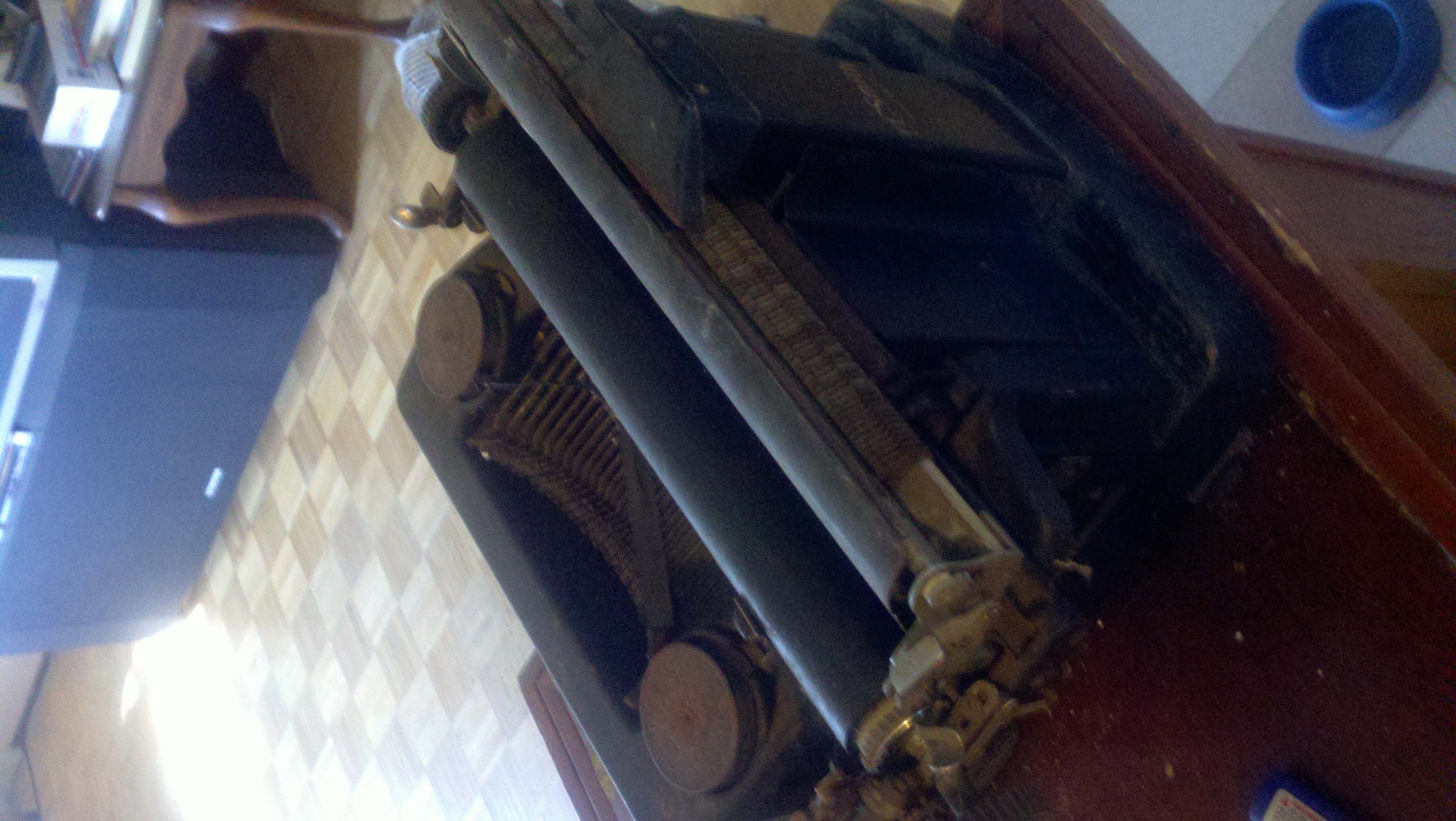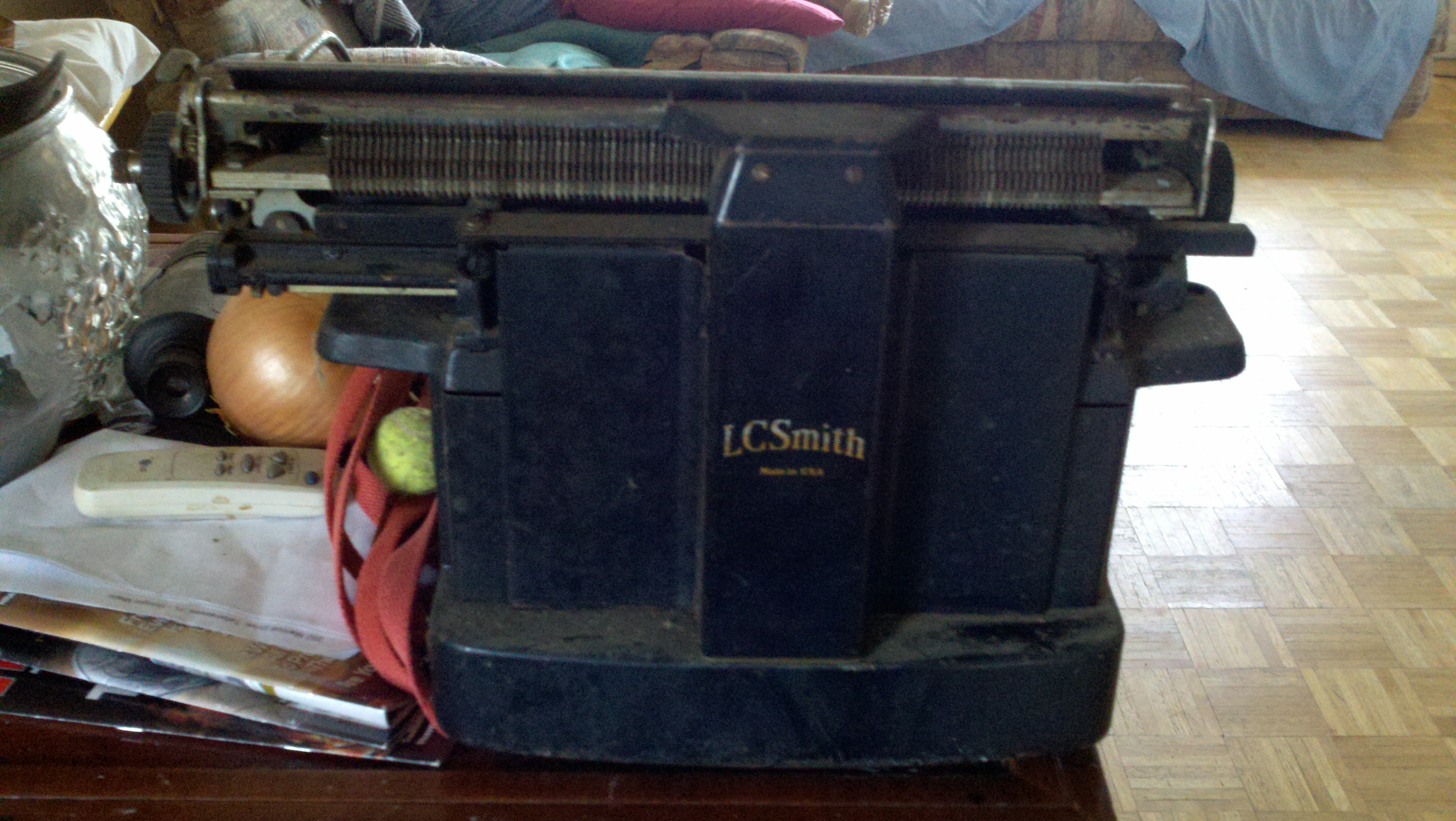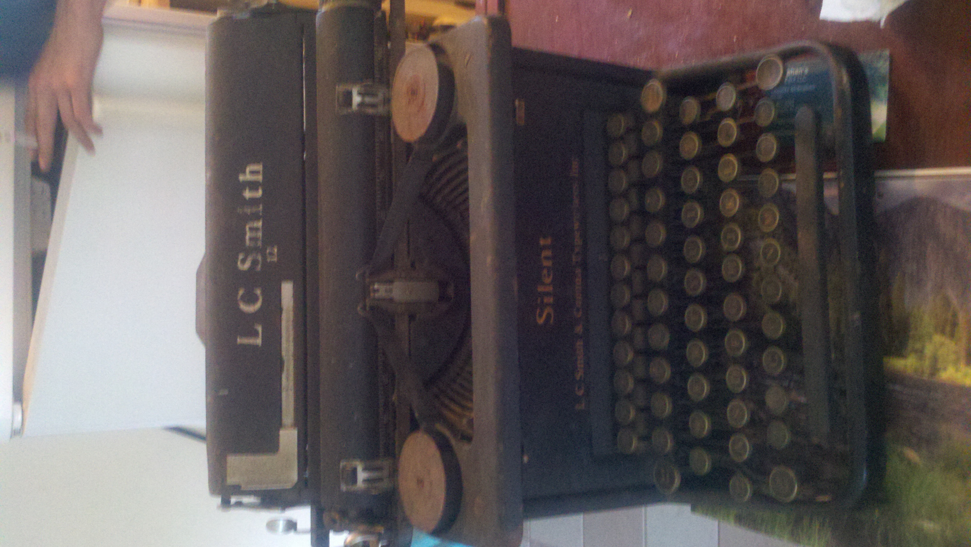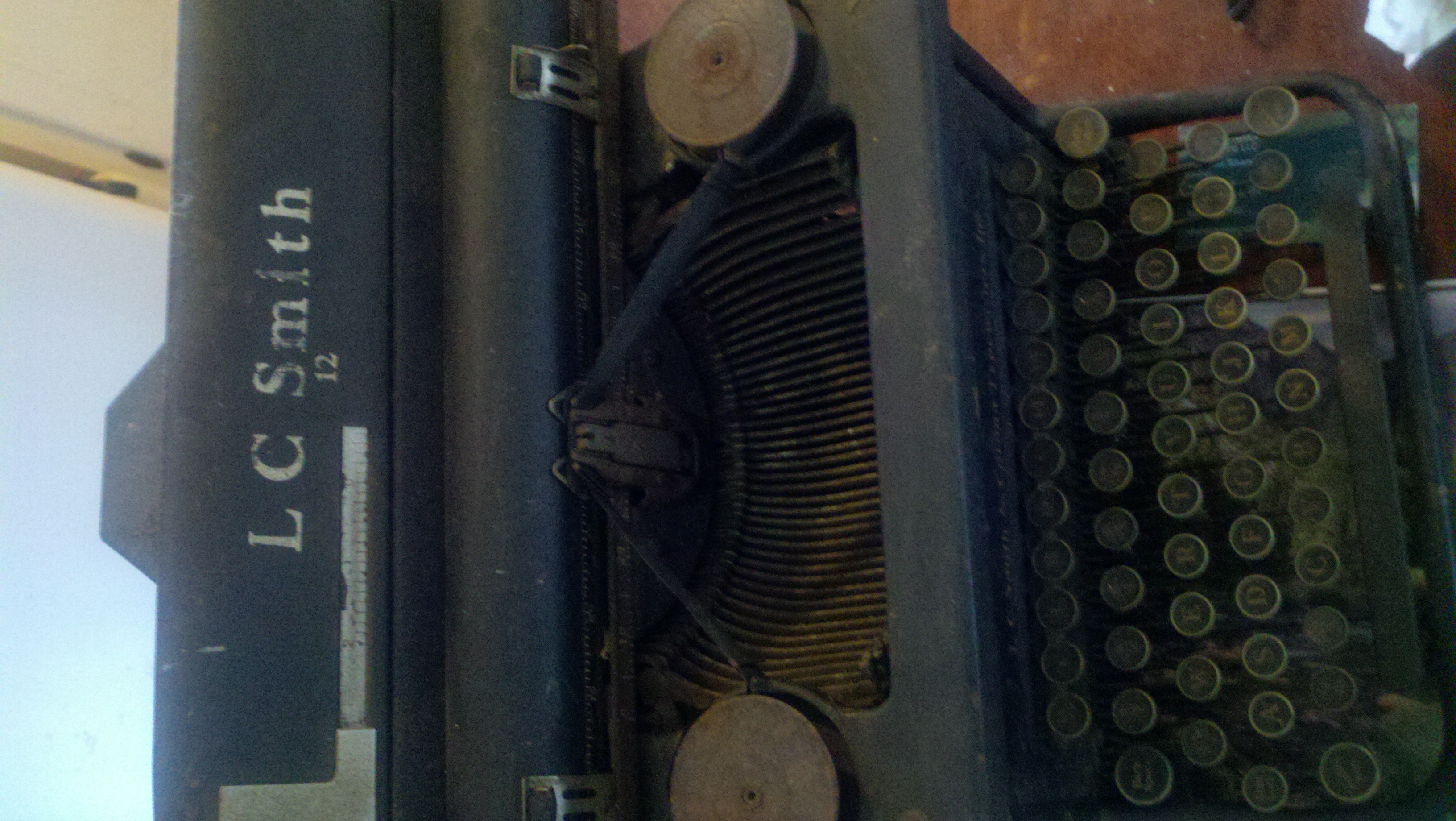 Black and a little dusty. Says LC SMITH 12 on the top. Silent Lc Smith and Corona Typewriters on the bottom. Still in working condition though may need some care. I can't find anything EXACT to match it anywhere online, only similar pieces.