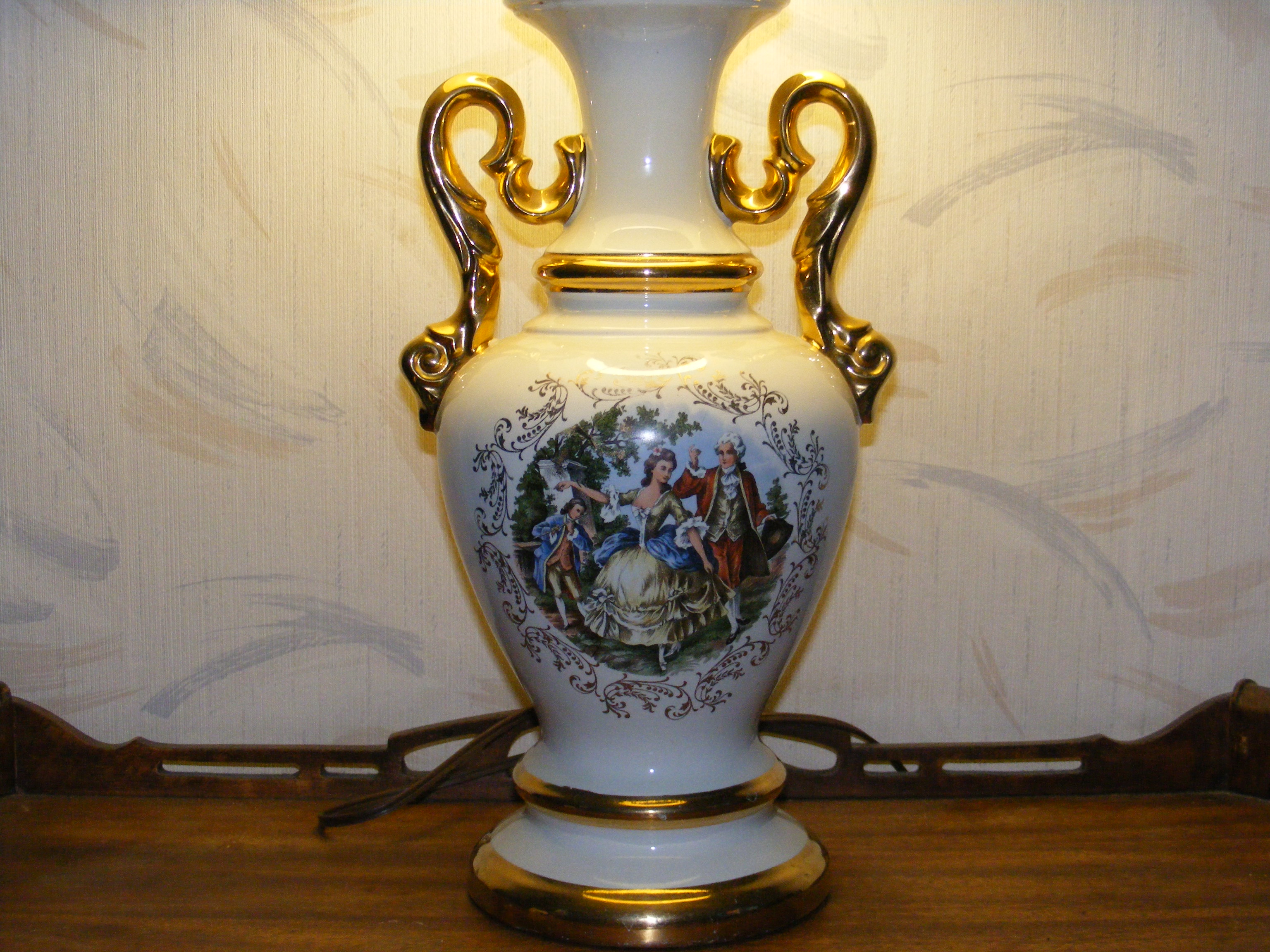 Porcelin lamp with old picture on front has gold handles on sides and gold rings around in four areas. On the back its written Le Grand prix , hand decorated, 22 carat gold.
