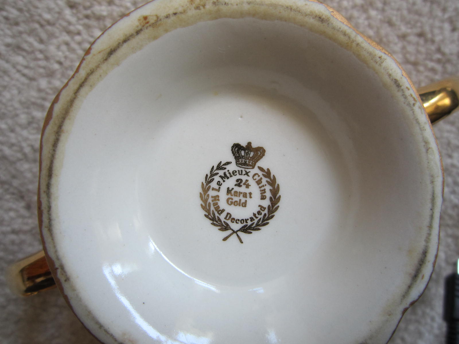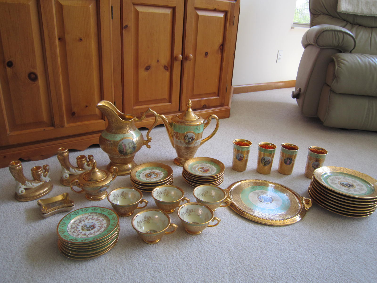 I have a set of Le Mieux 24 karat hand painted china that consists of 4 glasses, 8 scallop edged dinner plates, platter, 5 cups , 5 scalloped saucers, 8 small paltes, 8 more small plates-dofferent pattern, sugar bowl w/lid, 2 ash trays, 2 double candle sticks, one has surface crack, large coffee pot/urn w/lid, large water pitcher.