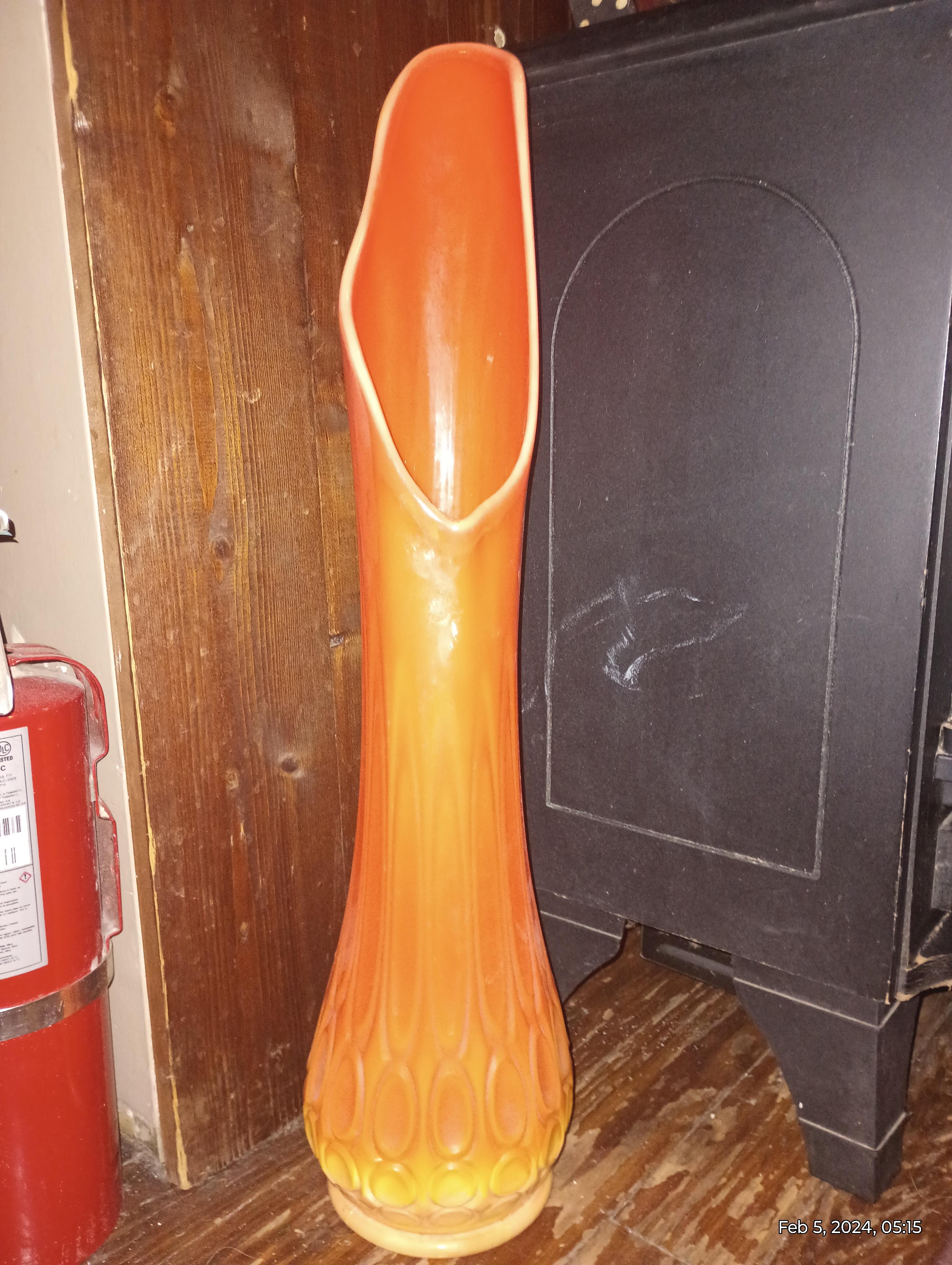 LE Smith Thousand Eyes bittersweet swung vase, orange, big eye, 22.25in H x 7.75in W with 10in mouth