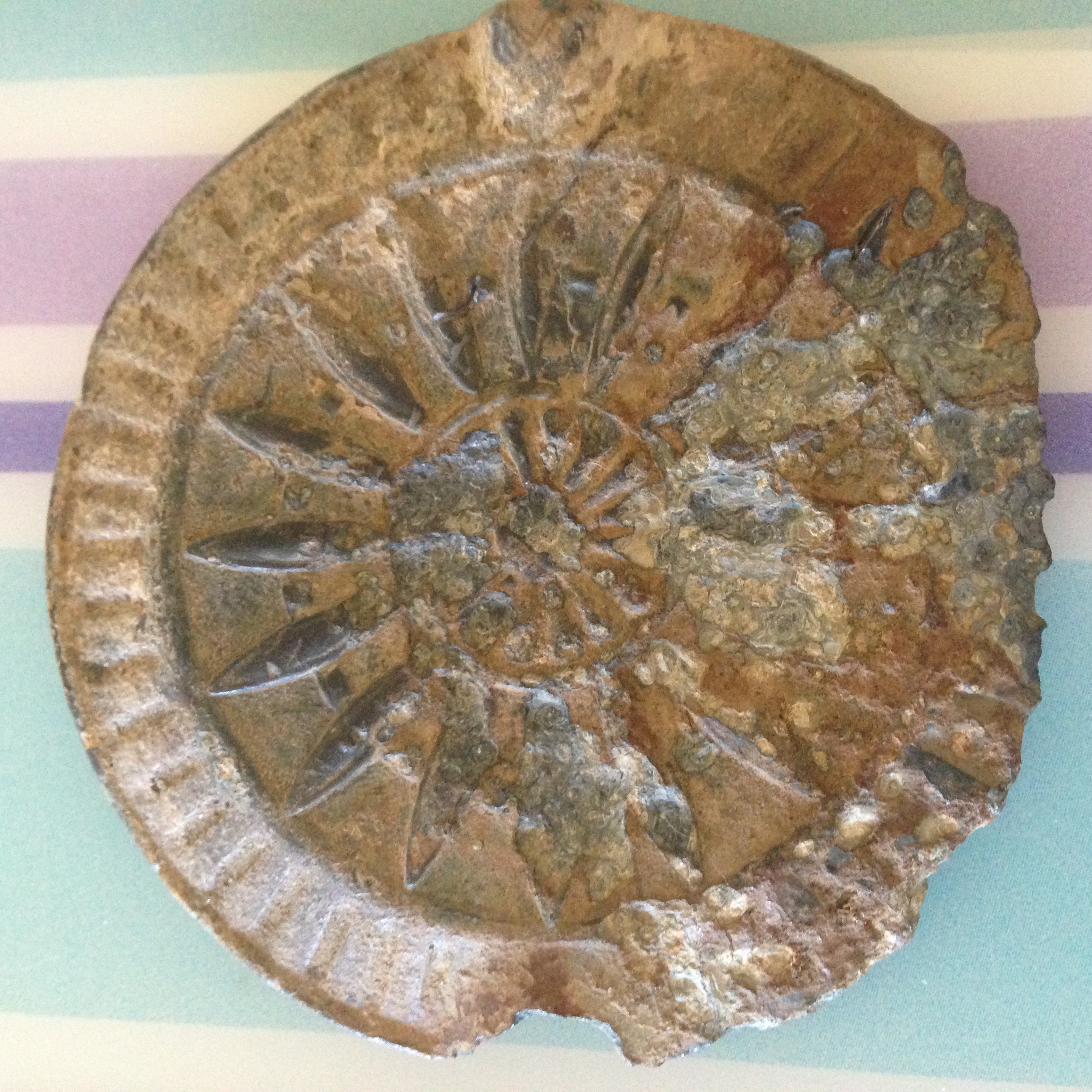 FOUND THIS MEDALLION LIKE ITEM IN NE TEXAS APPROX 10" BELOW GROUND. IT IS MADE OF A LEADLIKE MATERIAL, 2.5" DIAMETER, .25" THICKNESS WITH SUNDIAL TYPE DECORATION ON ONE SIDE AND A CROSSHATCH DESIGN ON THE OTHER SIDE. THERE IS AN OVAL HOLE THROUGH THE CENTER HORIZONTALLY ACROSS THE DIAMETER. NOT SURE IF IT WAS FORMED FROM A MOLD OR A STAMP.