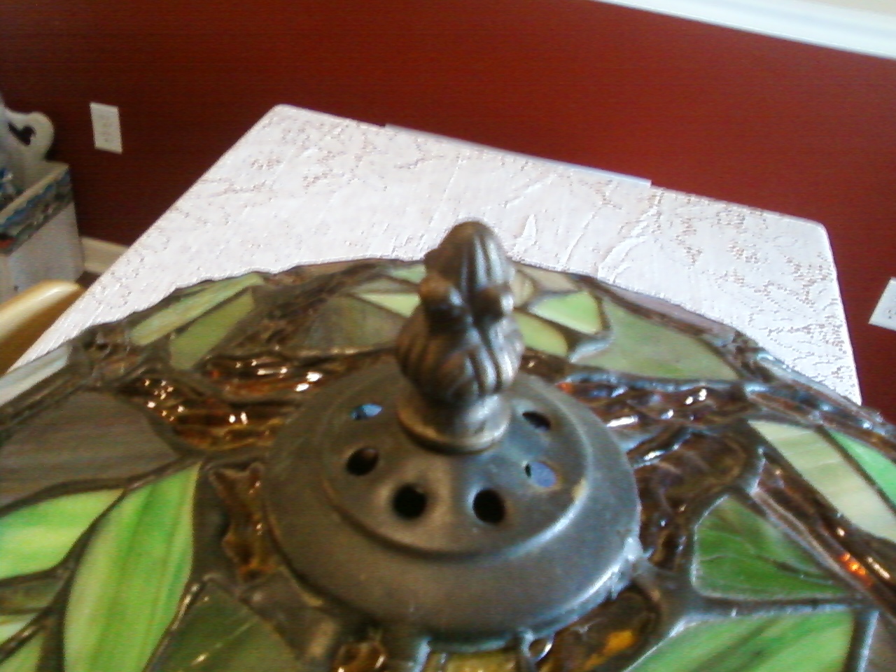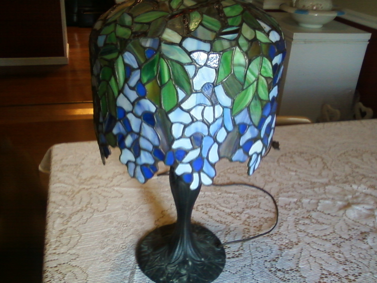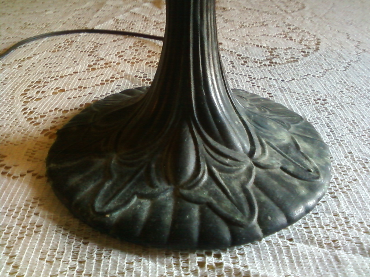 Complete working table lamp.  The shade is leaded glass with a tree and leaf pattern.  The is approximately 12 inches wide and 12 inches tall with leaded drop leaves around the edge.  The base of lamp appears to brass or bronze casting with victorian shape like a tree trunk.  When shade and base are together the lamp looks like a weeping willow type tree.  The lamp is approximately 24inches tall from the base of the lamp to of the lamp. The lamp is complete. The shade is a rounded shape like the top of a willow tree.  It does work but has newer wiring  It came from a house where other items were dated like pictures and books dated early 1900's..