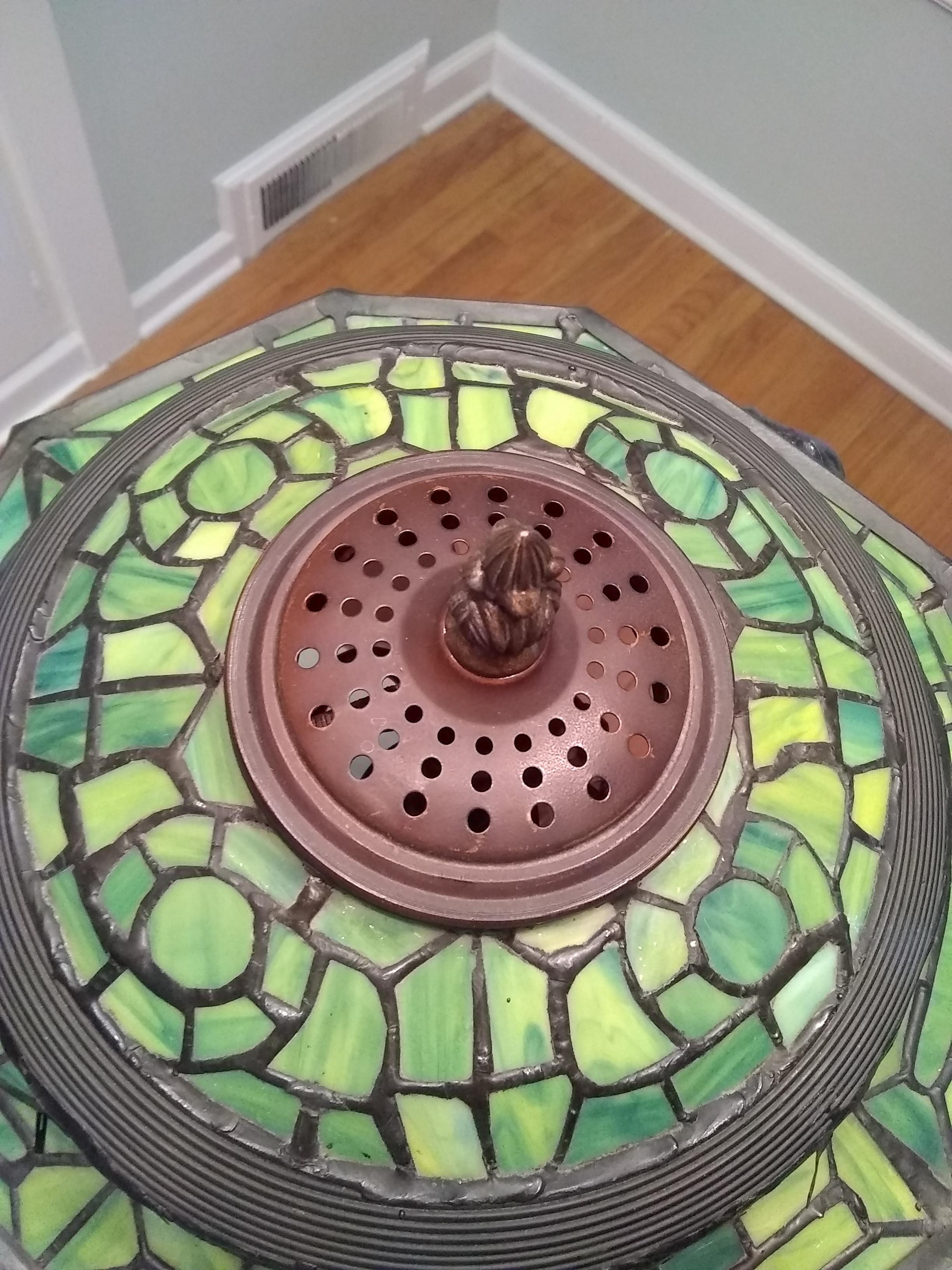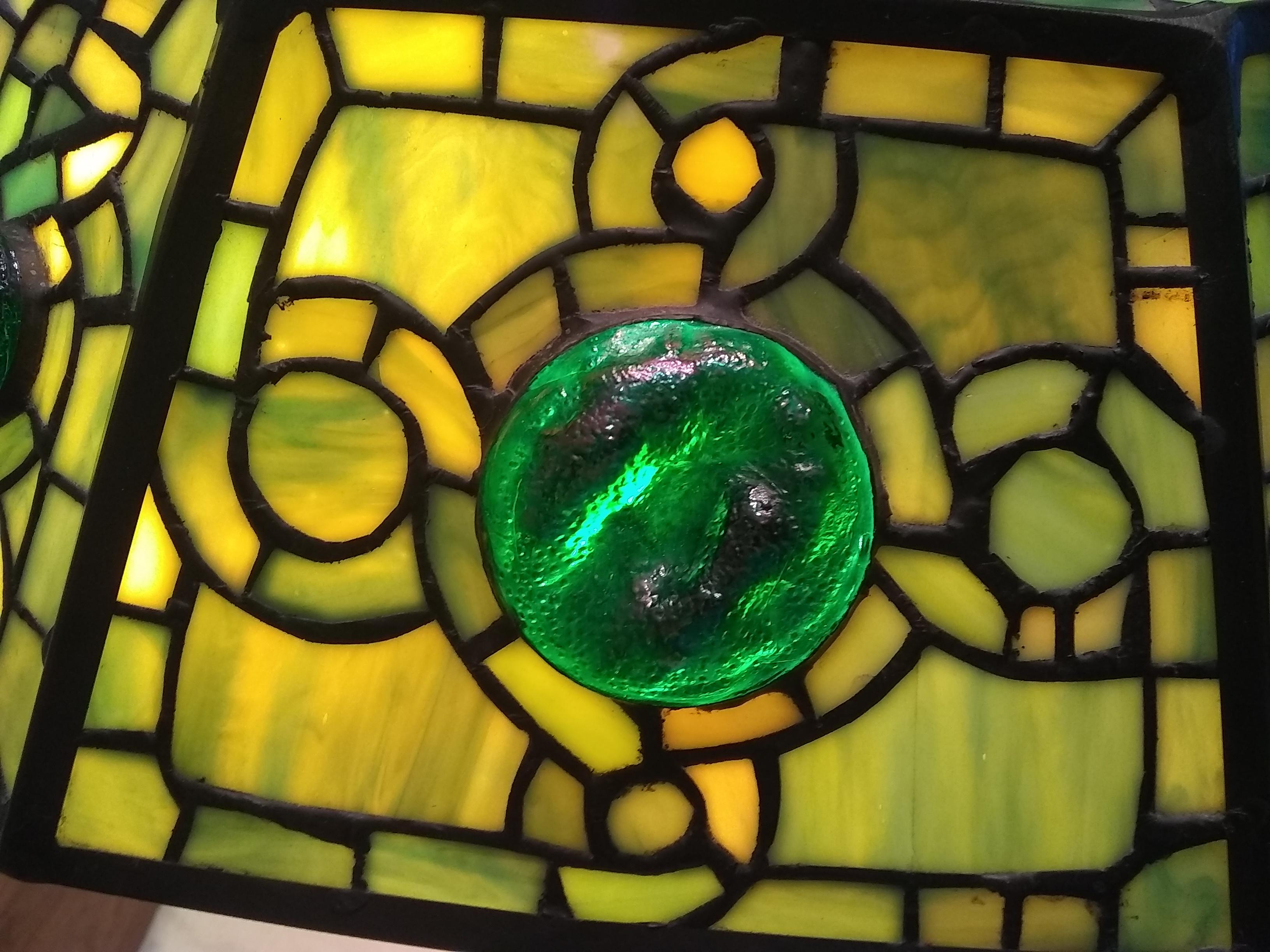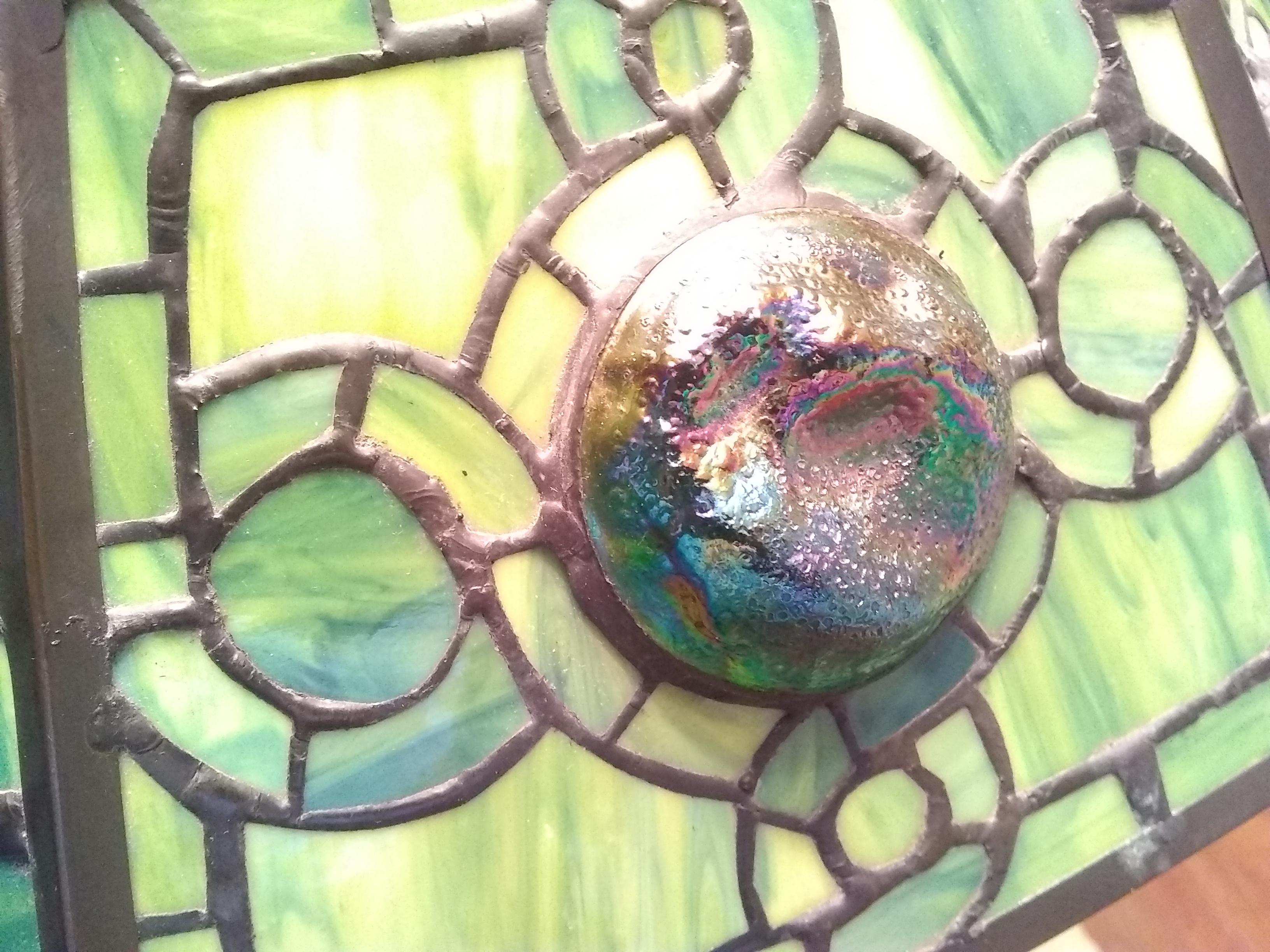 My wife found this lamp at an estate sale. She paid $350 for it. We think its base is made of bronze. It's quite heavy. The shade is leaded and has iridized cabochons of possibly "turtleback" glass (we're not positive about any of these terms). We'd like to know roughly how old it is, what it might be worth and anything else you can tell us about it. Thanks!