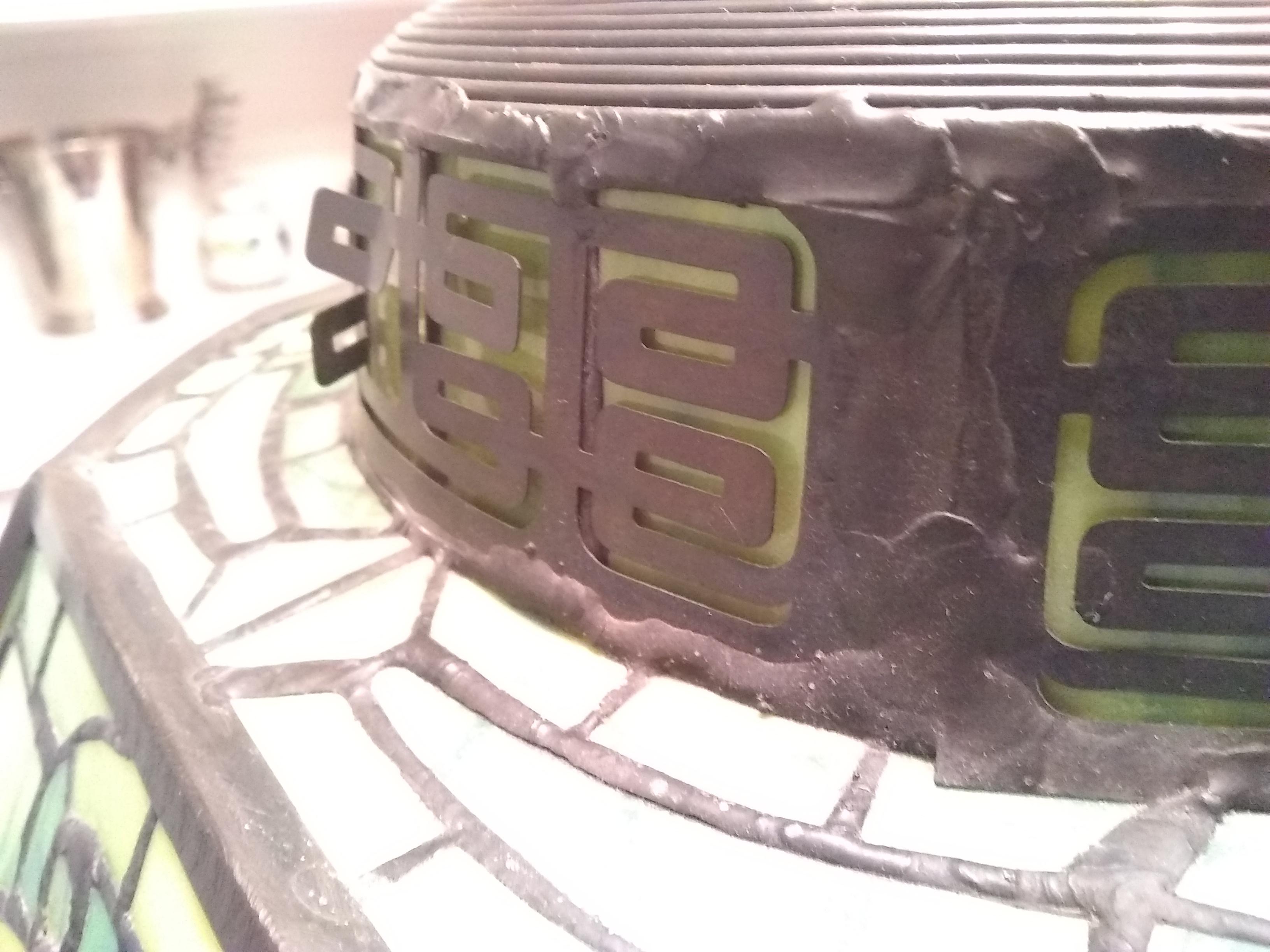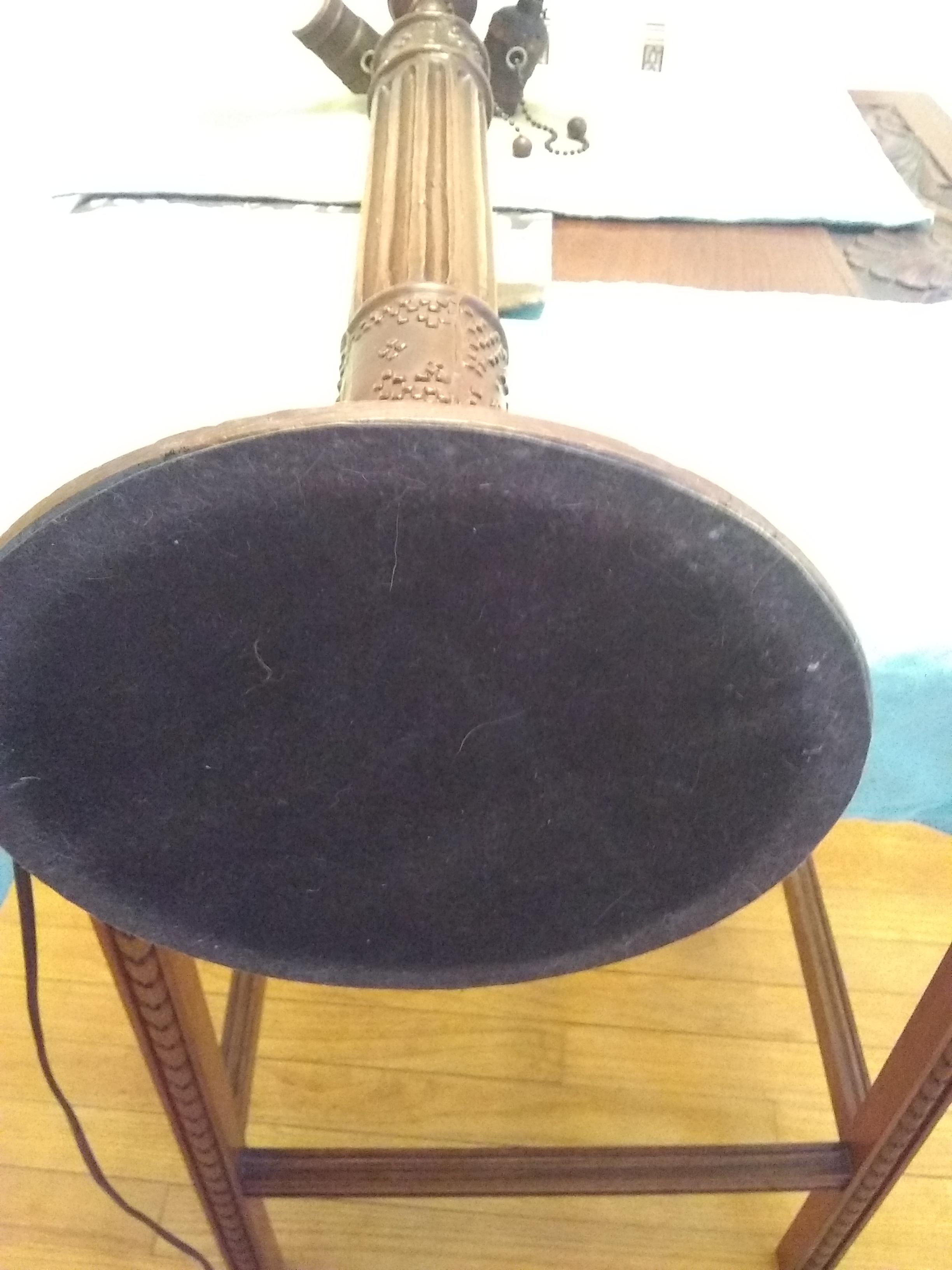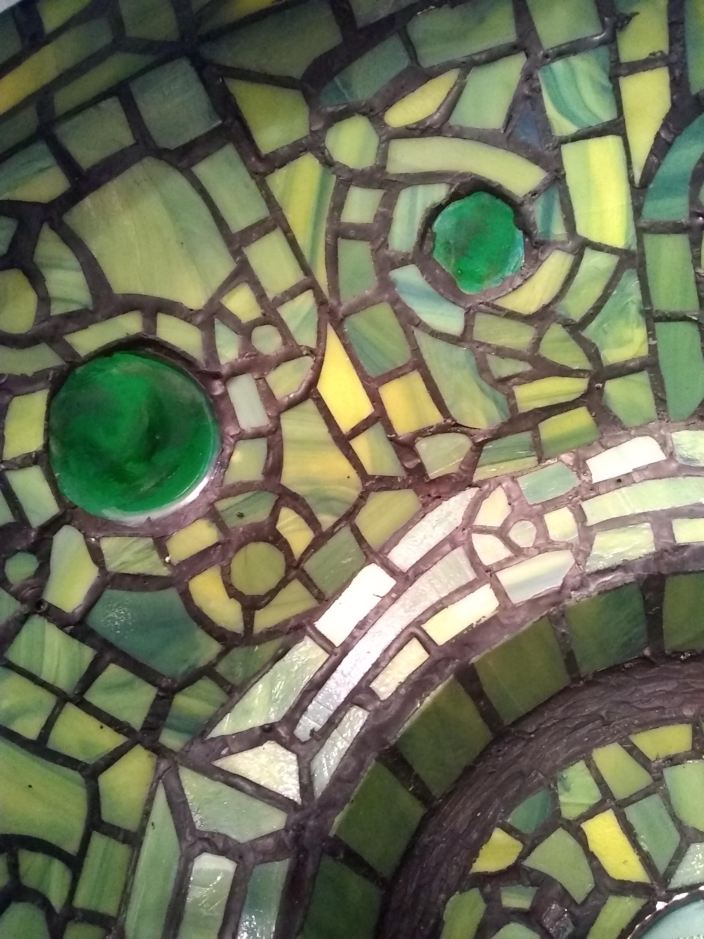 My wife found this lamp at an estate sale. She paid $350 for it. We think its base is made of bronze. It's quite heavy. The shade is leaded and has iridized cabochons of possibly "turtleback" glass (we're not positive about any of these terms). We'd like to know roughly how old it is, what it might be worth and anything else you can tell us about it. Thanks!