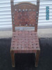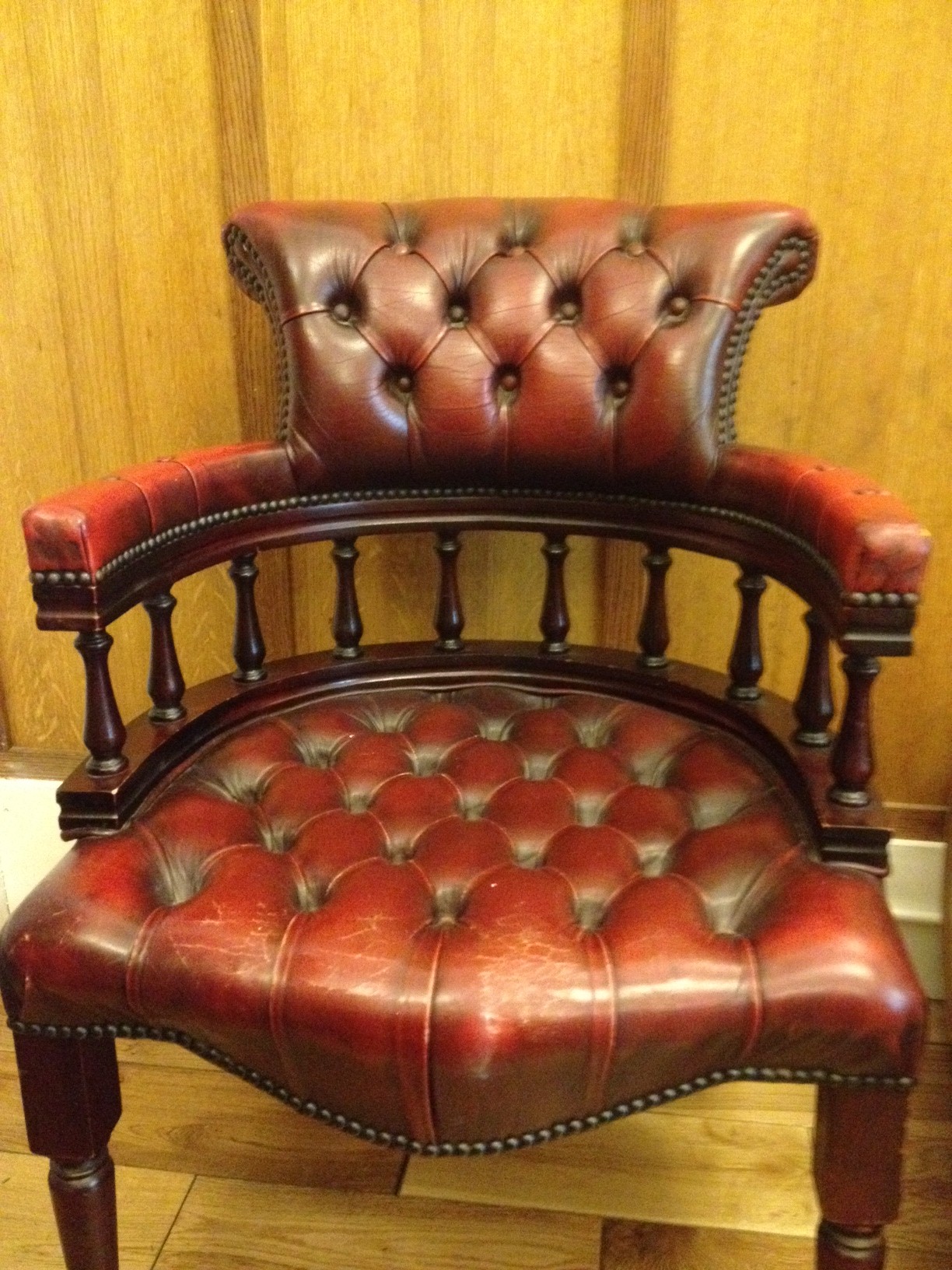 Deep red leather chair with wooden legs and base with metal studding