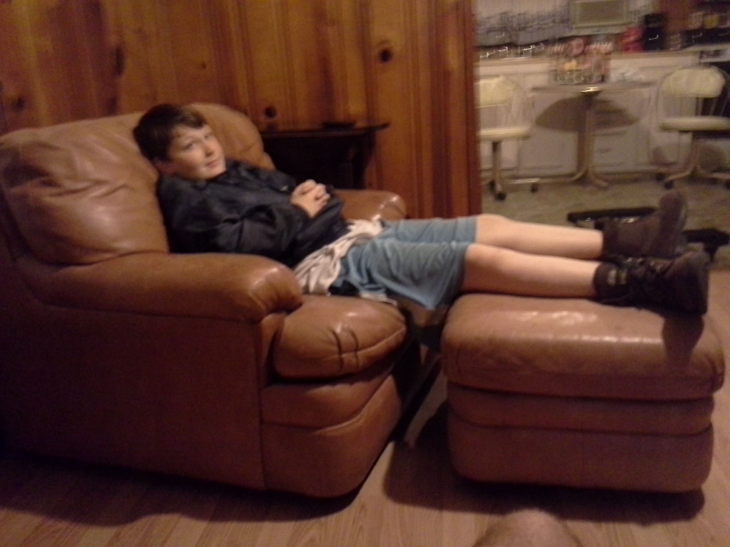 Leather chair and ottomon. Very solid. No rips or tears. Needs to be cleaned. Located in a storage unit.