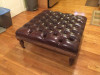 The chair is leather "all the way around and the ottoman is leather as well, but on the bottom someone attempted a restoration and stapled a sheet of plastic on the open bottom. I do not know what is under the plastic as I decided it is best to leave it in the condition in which I bought it rather than attempt to restore it and risk diminishing whatever value it may have. On the arms of the chair where ones hands would be if they were sitting in the chair are two spinnable ornate discs. One on each arm.