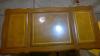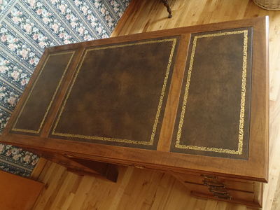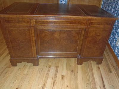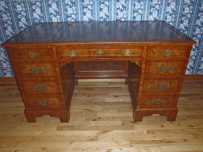 Gold embossed brown leather inlay top on this pecan burl executive desk with modesty panel. Drawer faces have beautiful wood inlay work. Size: 54Lx28Wx30H