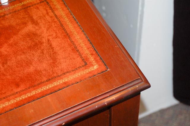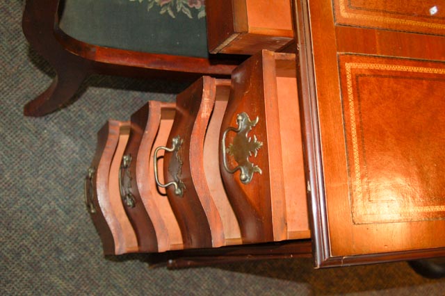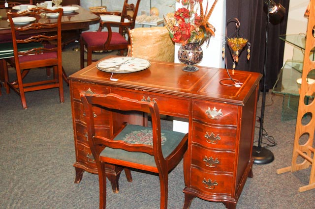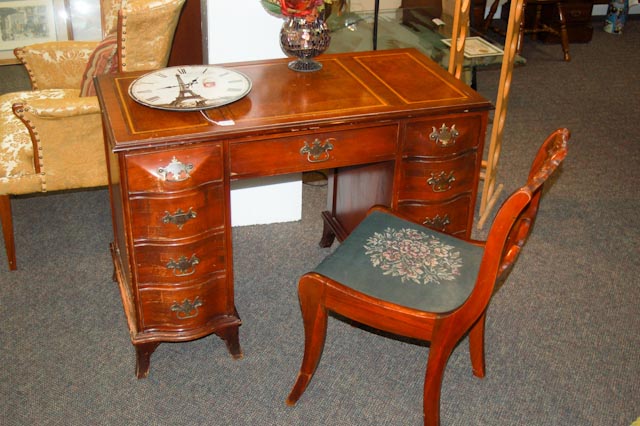 Was told this is a 1920's mahogany writing desk. Has matching cahir and leather top is in great shape.